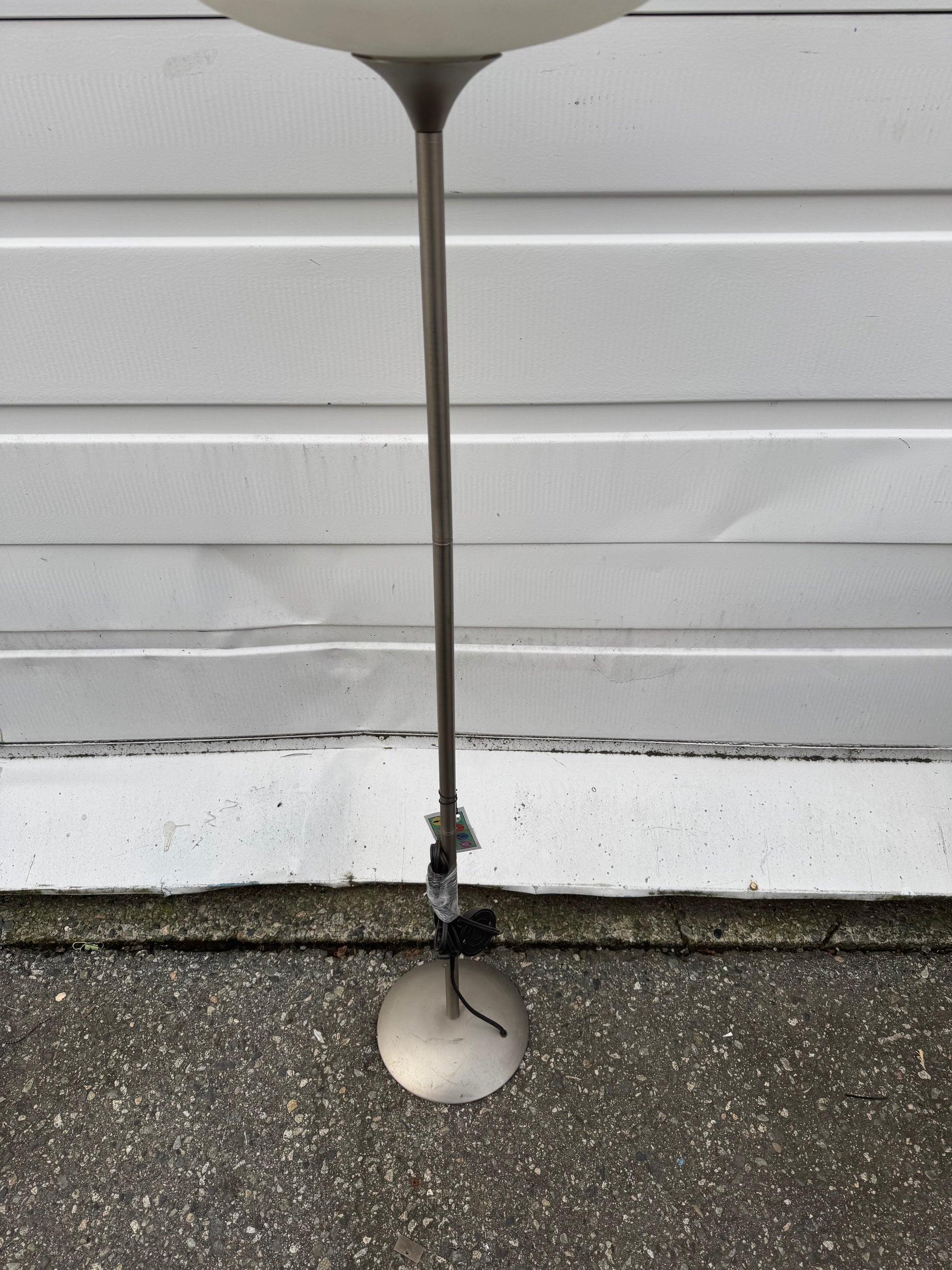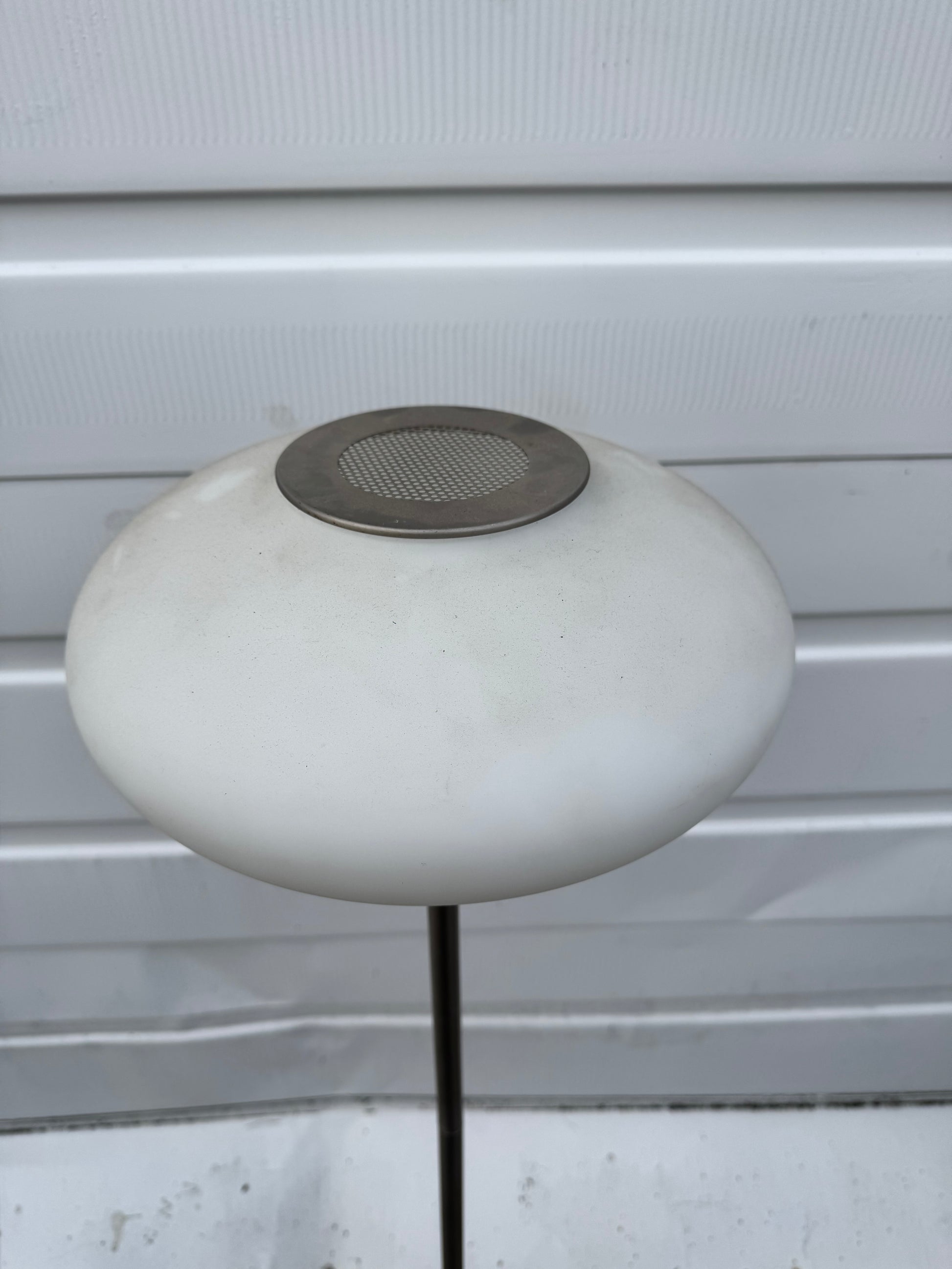 Silver lacquer base with frosted glass doughnut shade. $60/w to rent $90 each to buy.