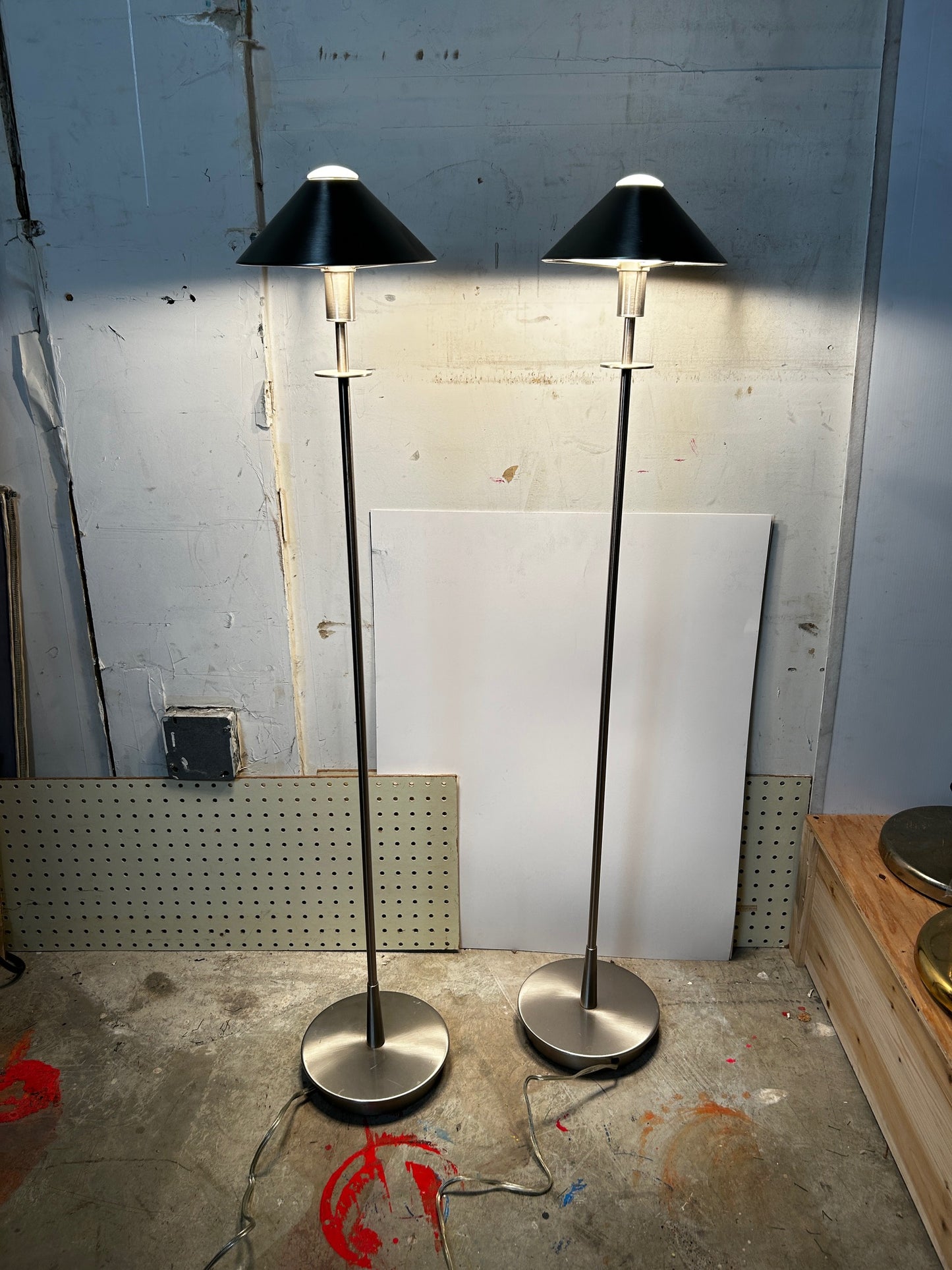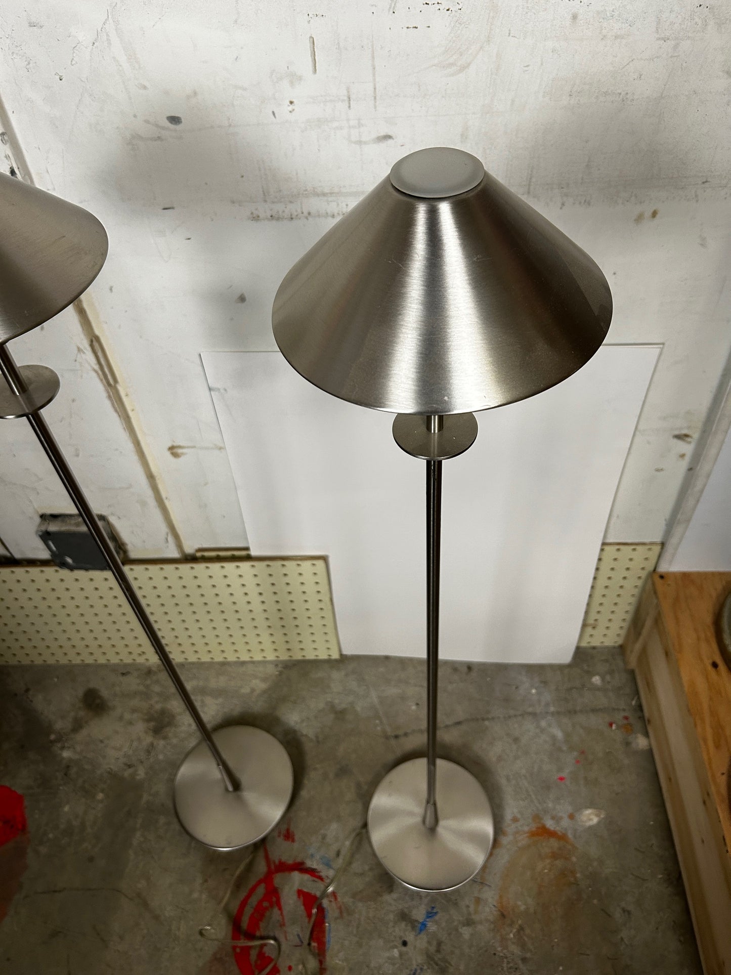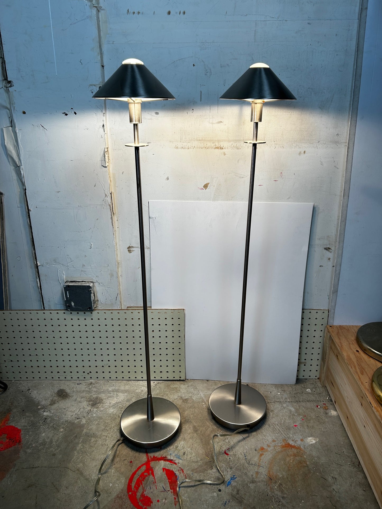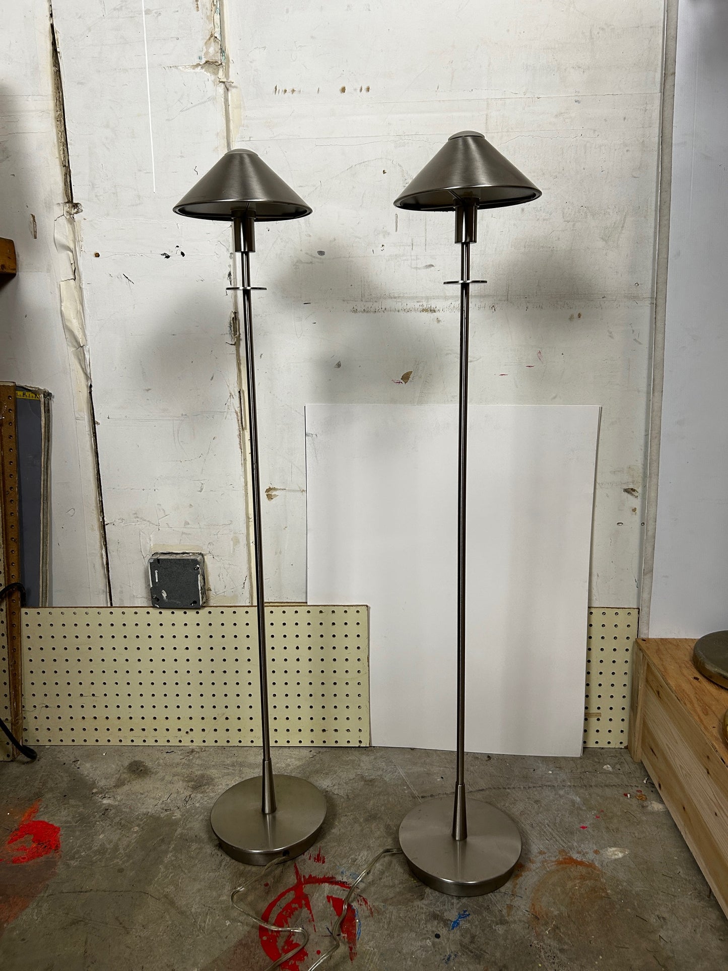 Holtkoetter pair of floor lamps w/ satin nickel base and a glass diffuser on top, halogen bulbs.