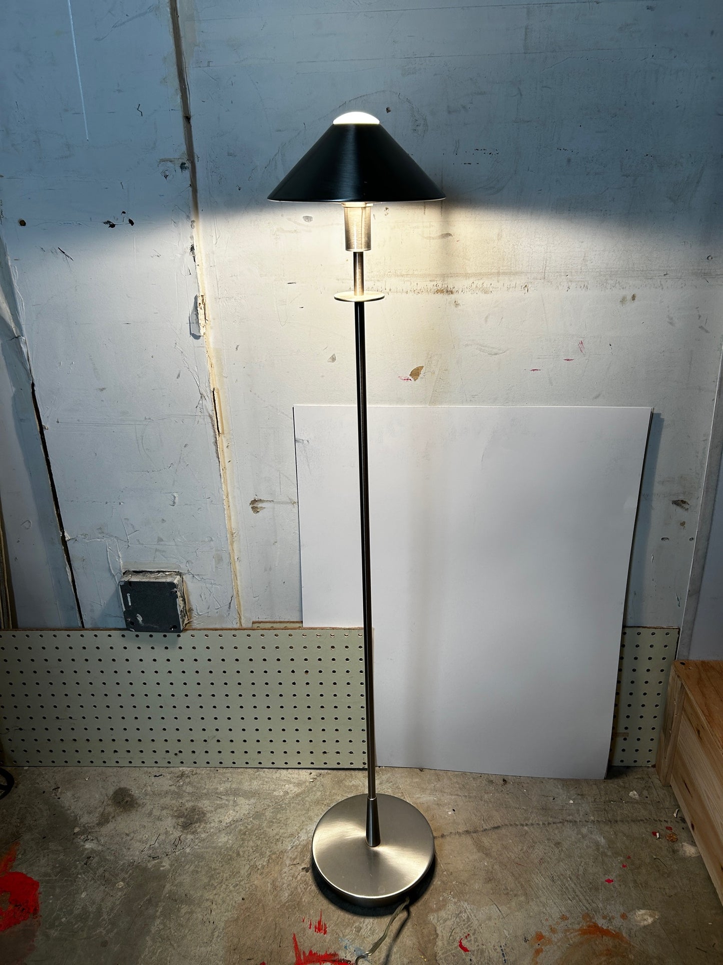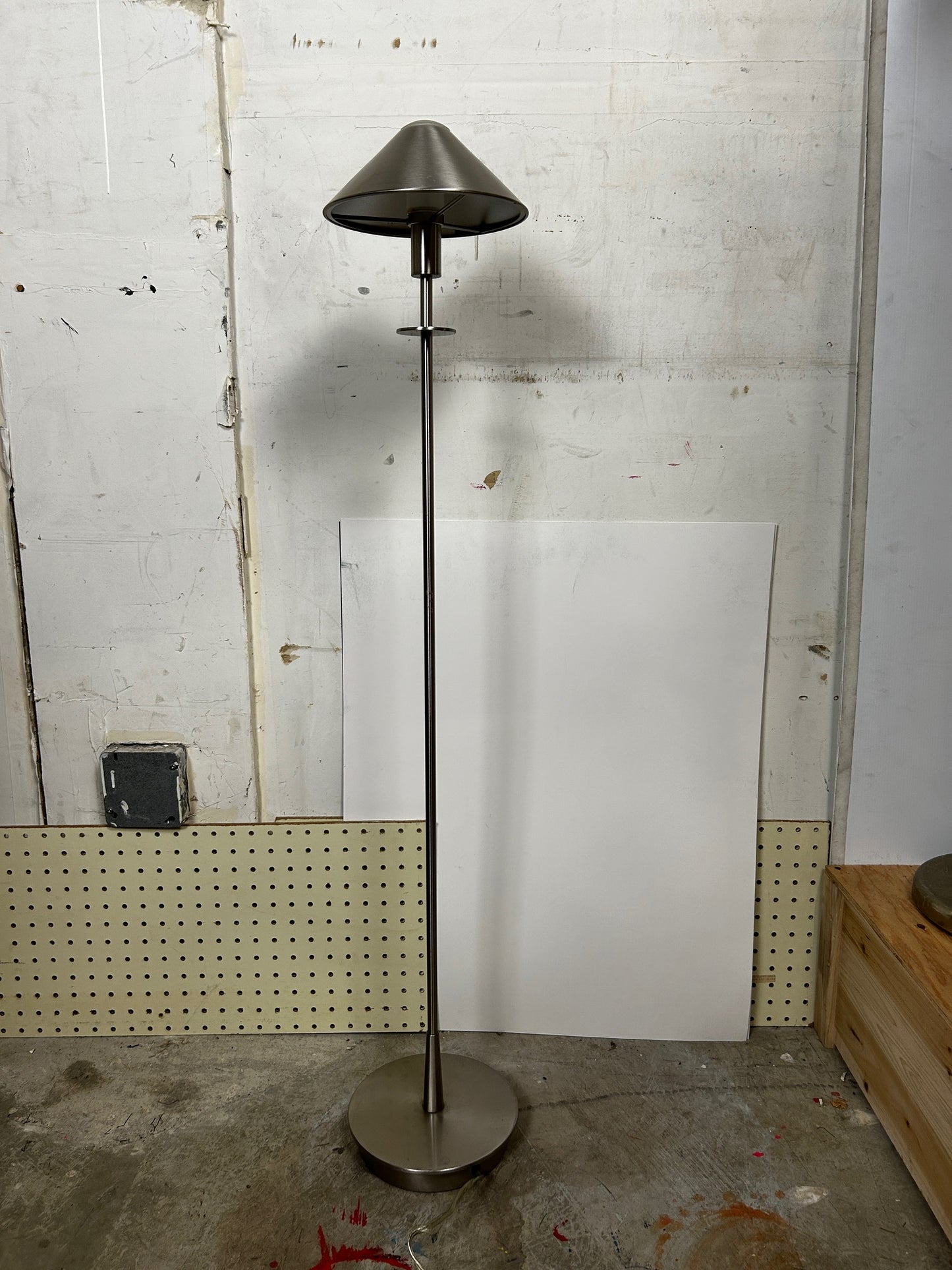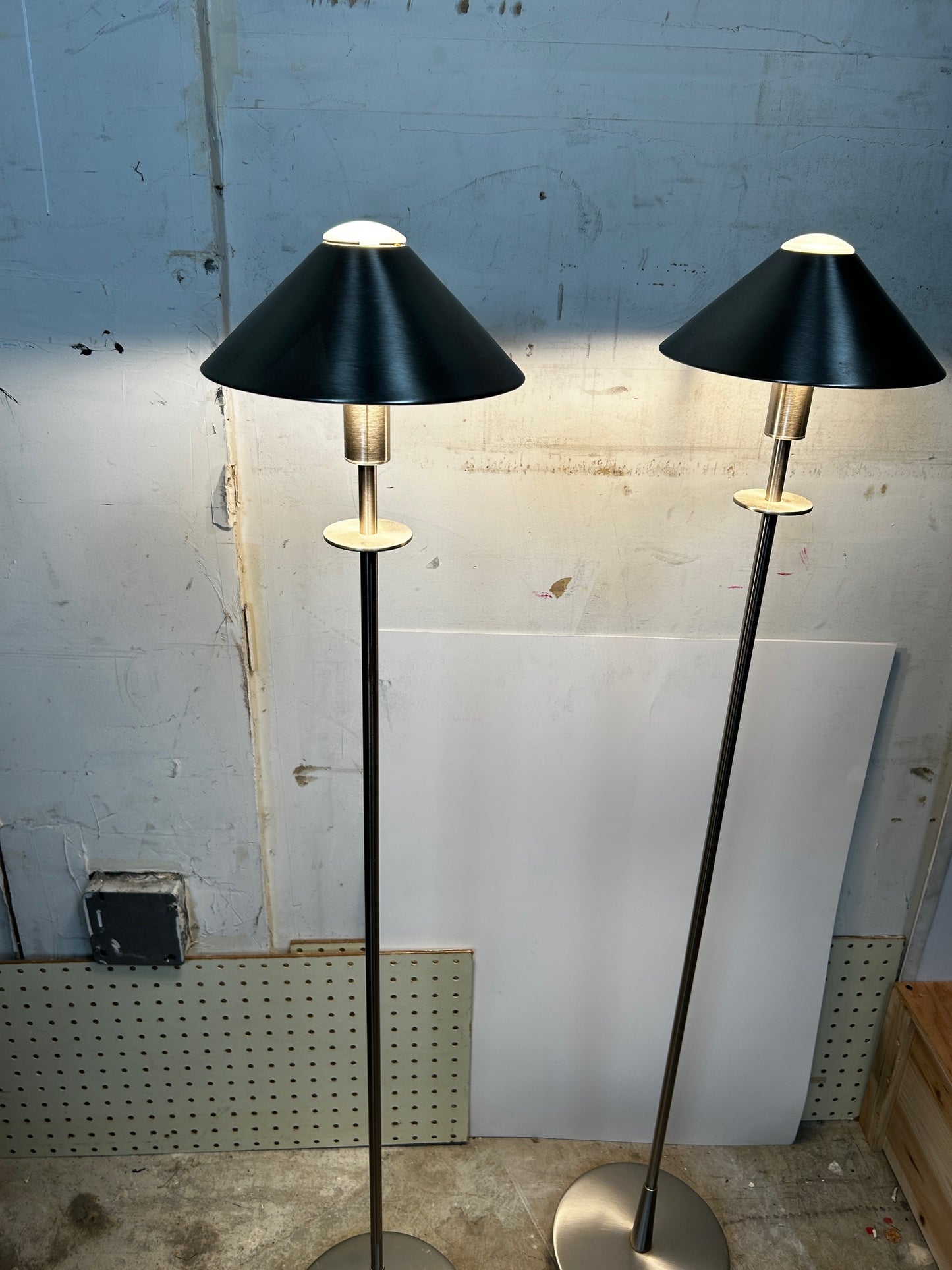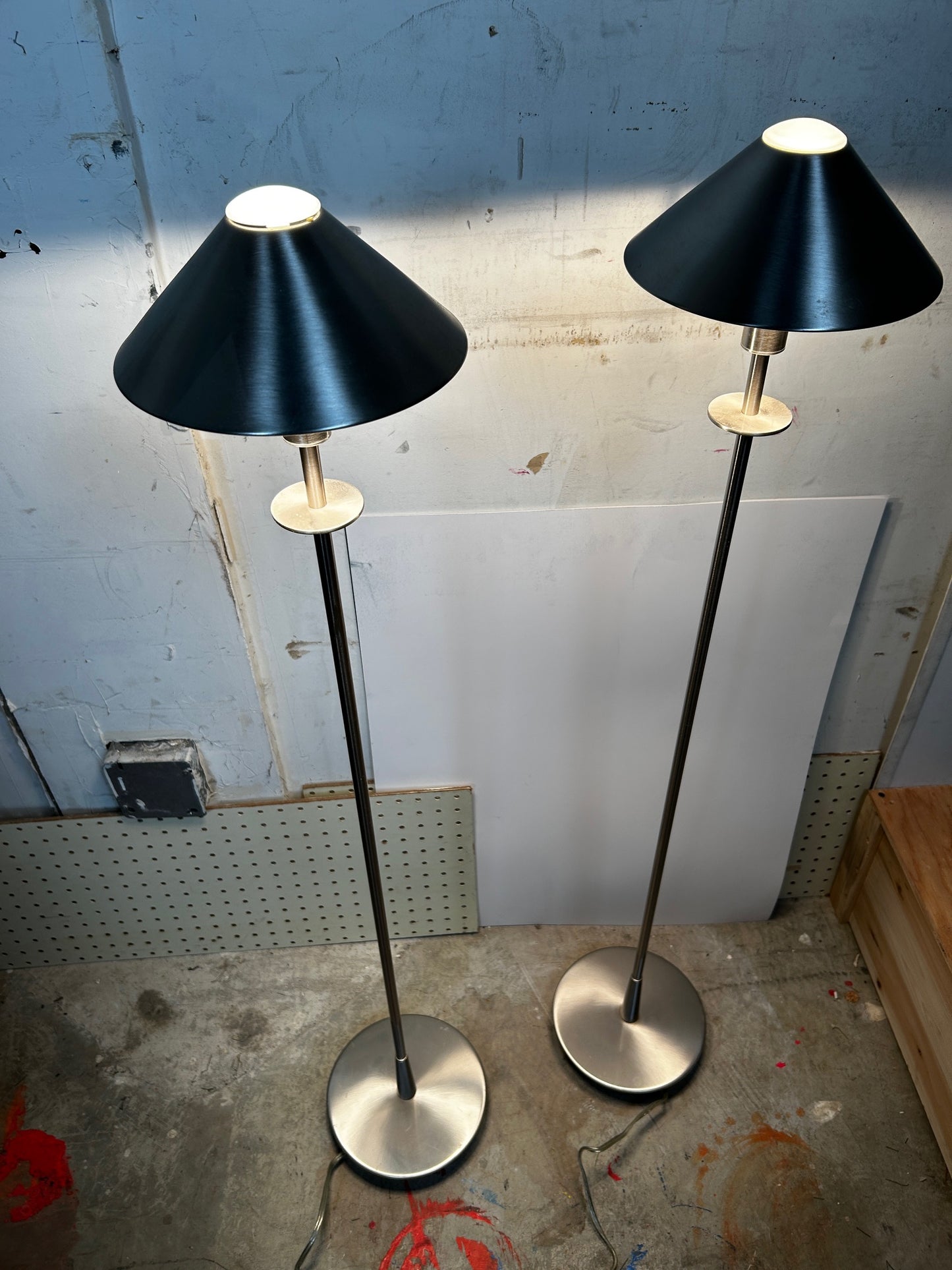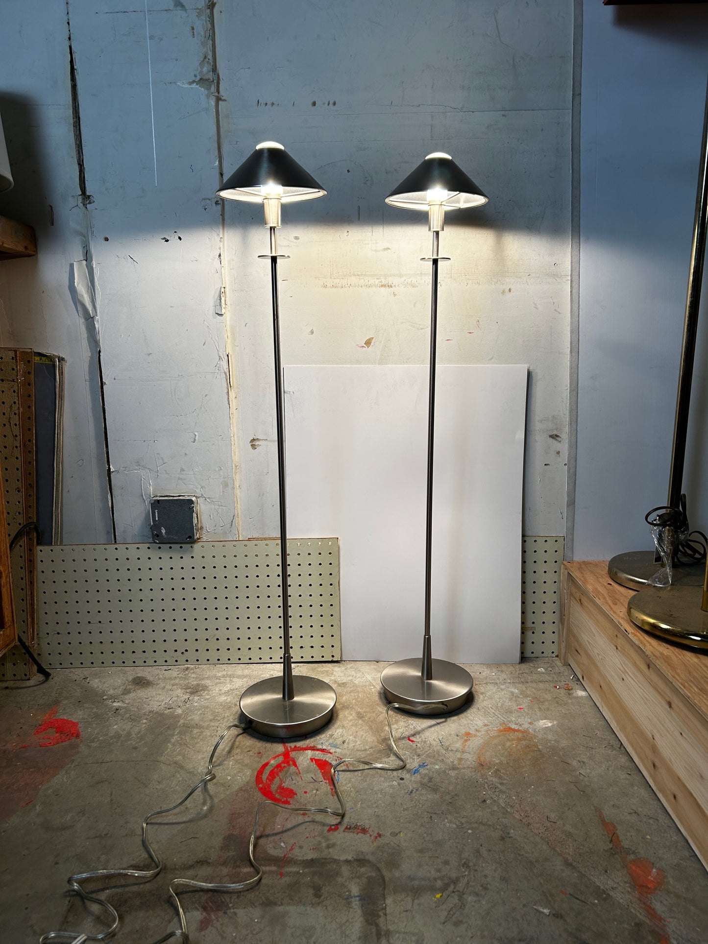 Holtkoetter pair of floor lamps w/ satin nickel base and a glass diffuser on top, halogen bulbs.
