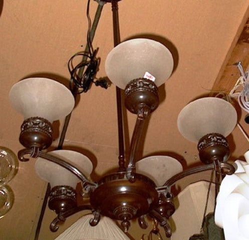 Cast metal bronze finish chandelier with 5 arms & frosted glass shade