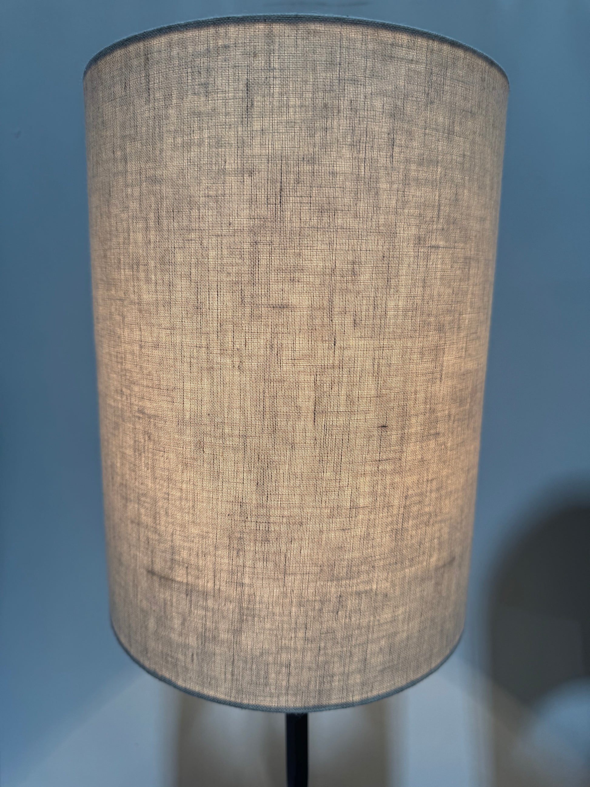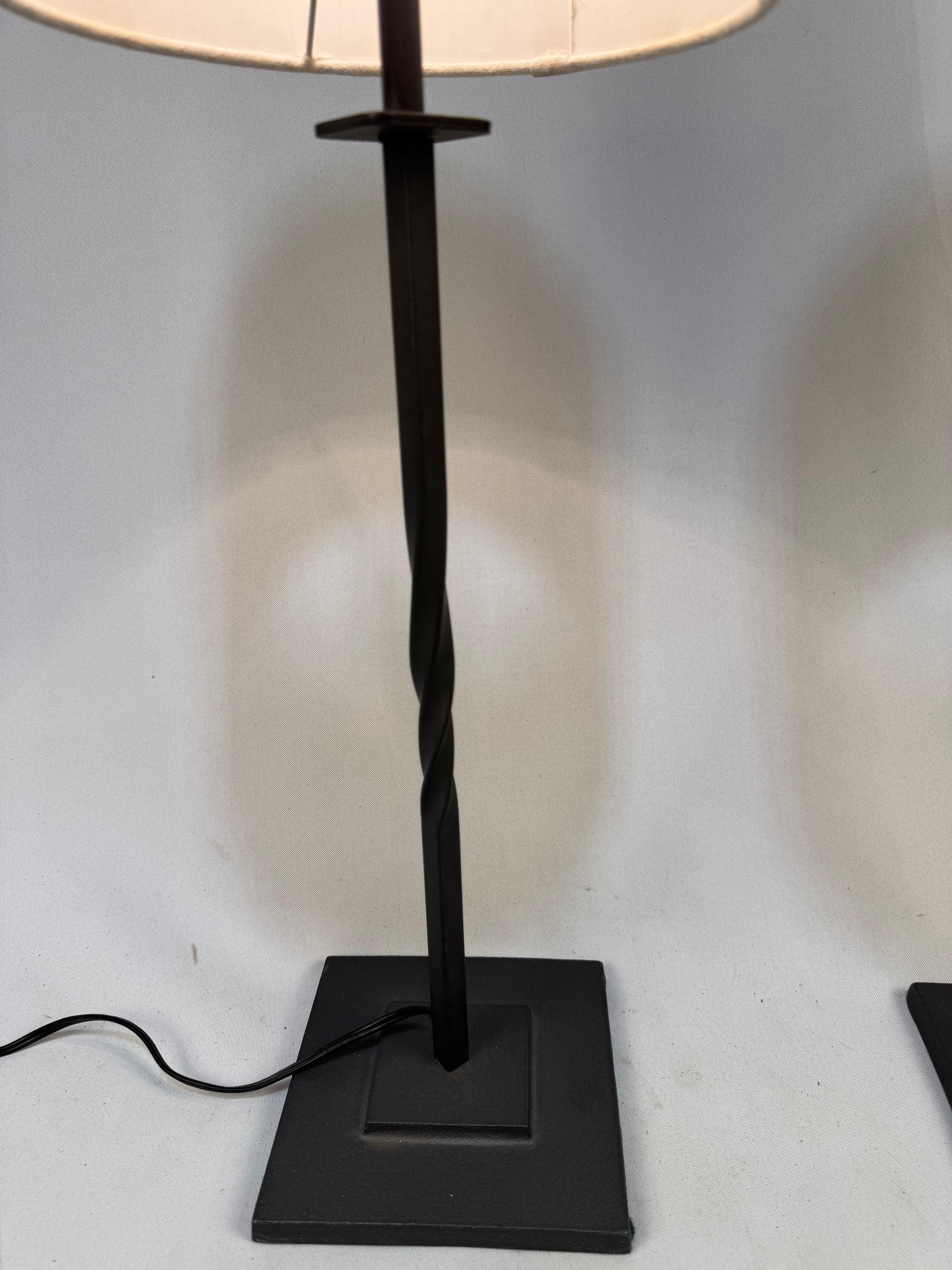 Contemporary twisted wrought iron table lamp with woven cylinder shade