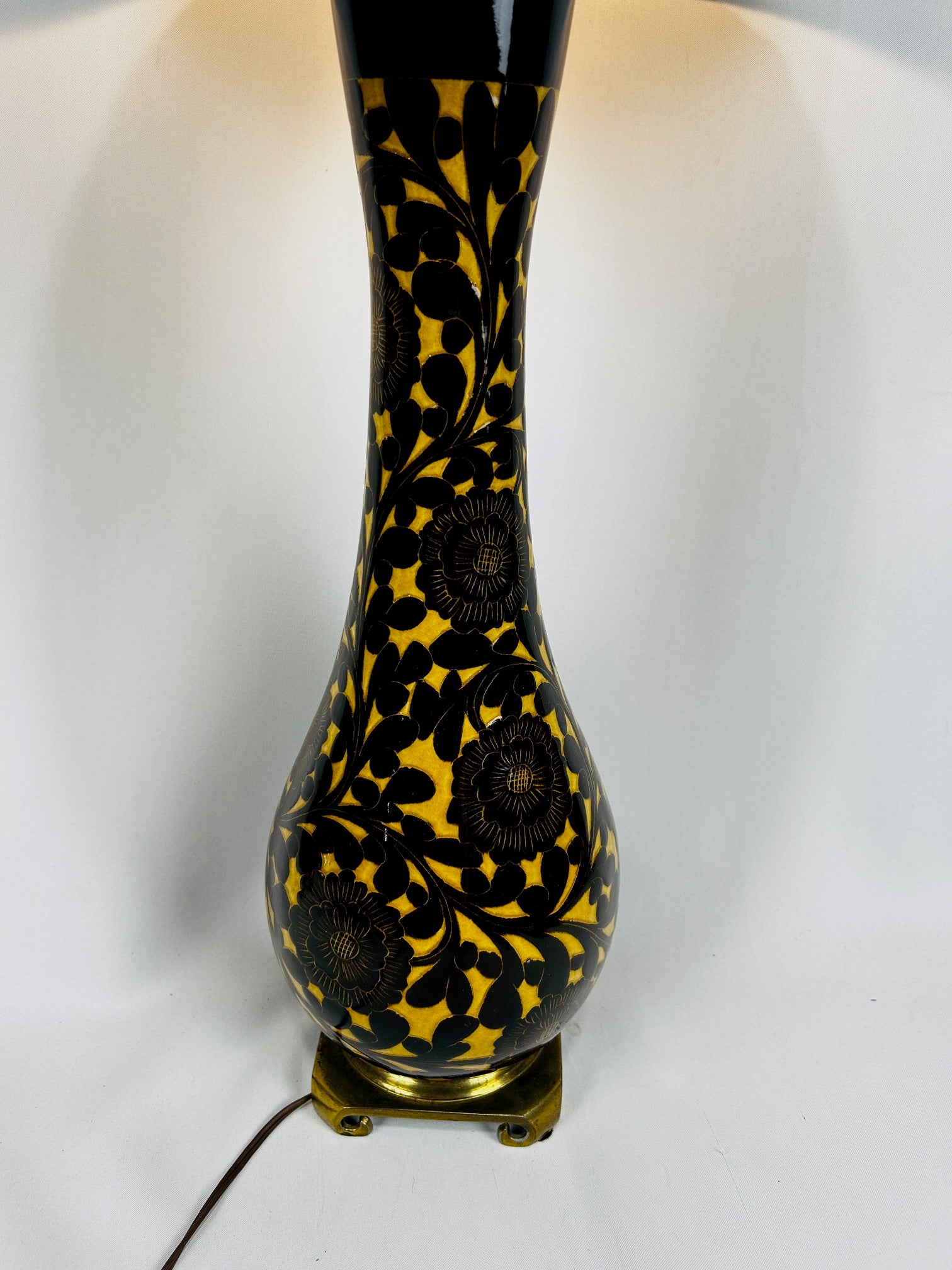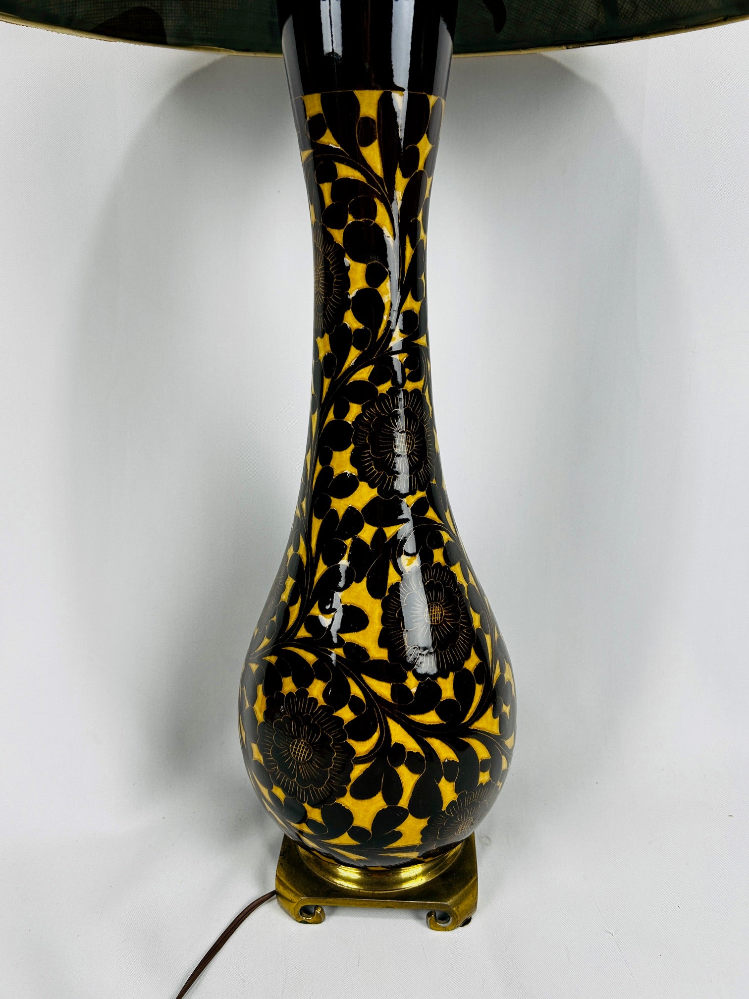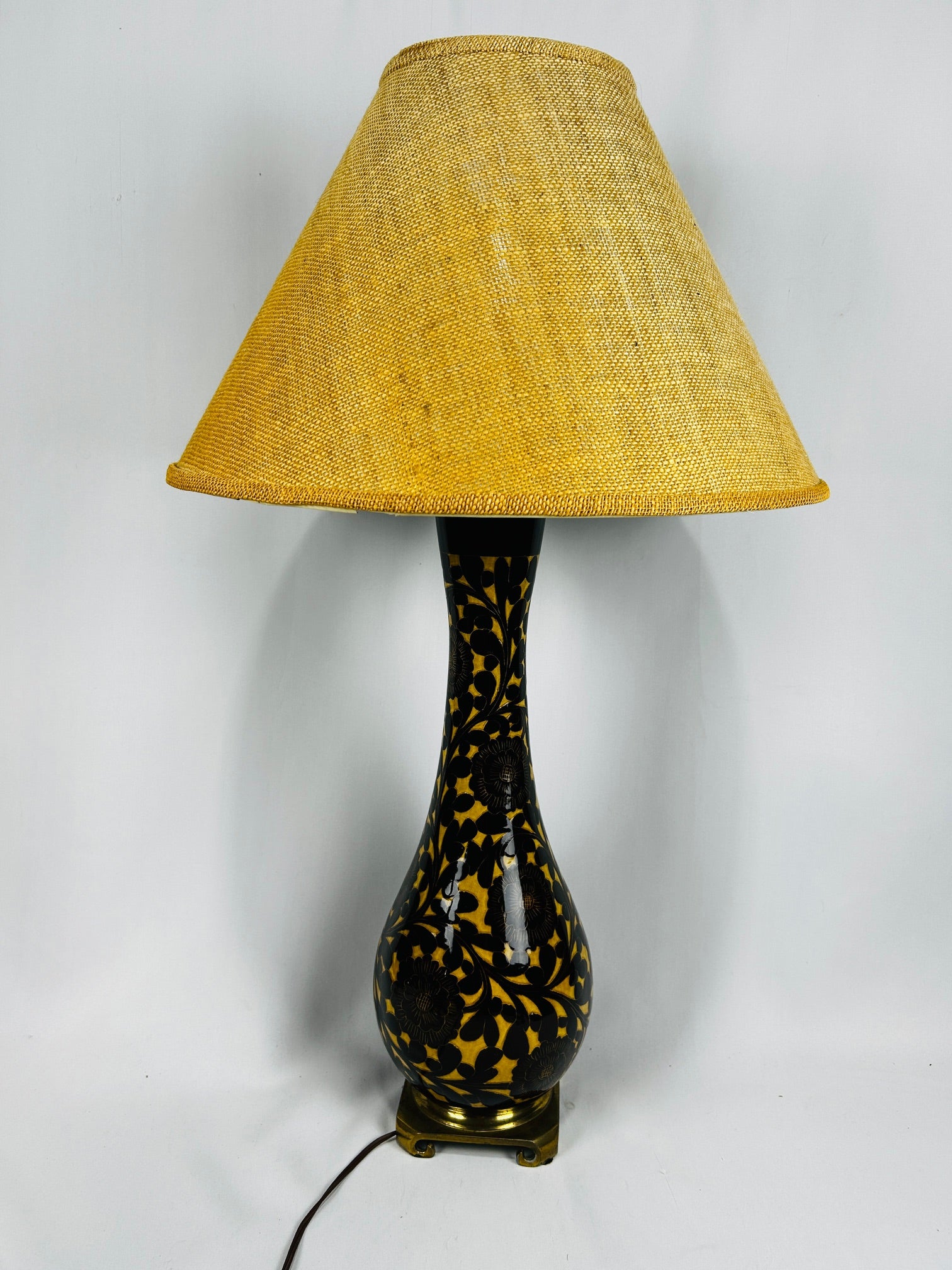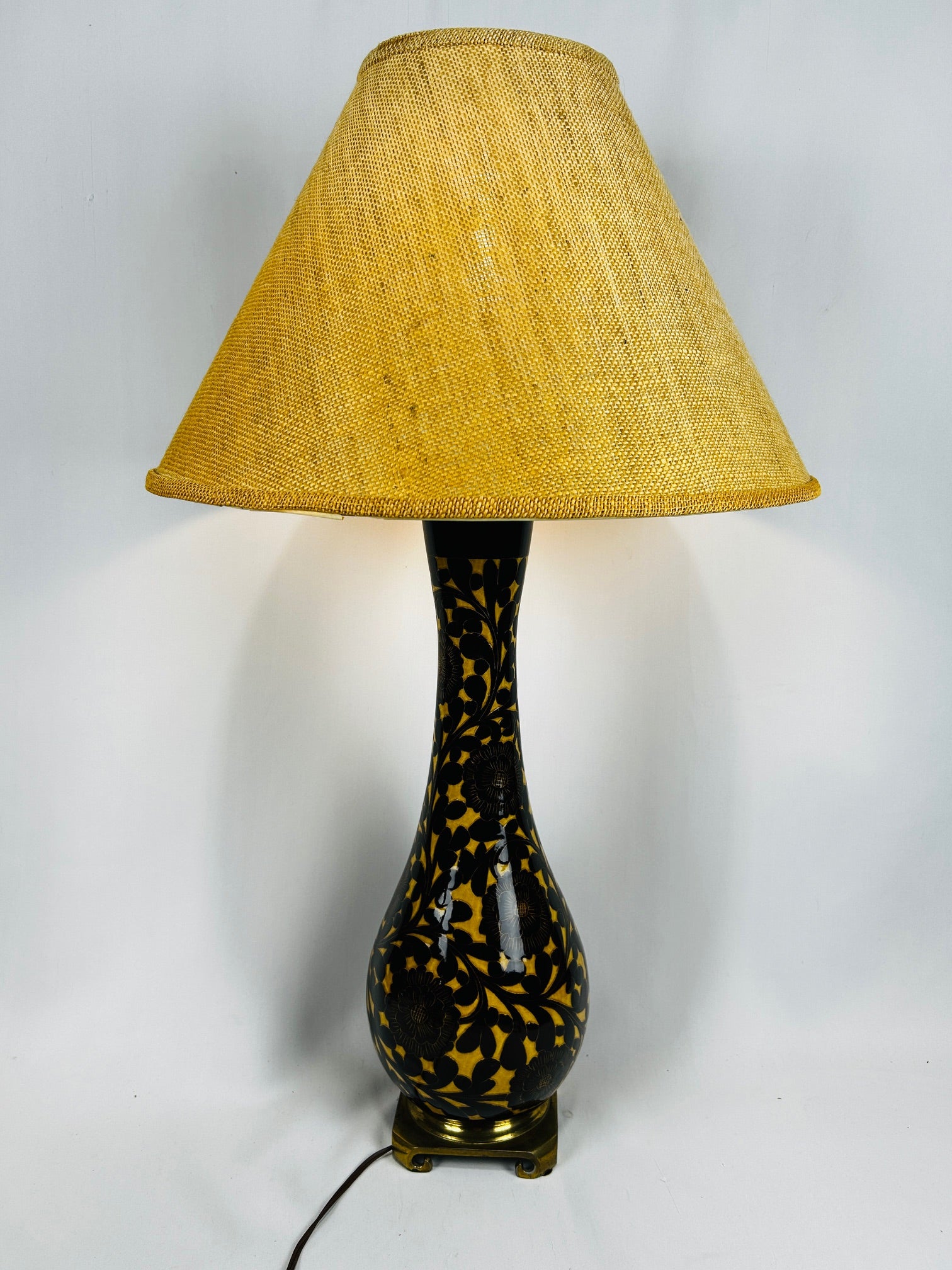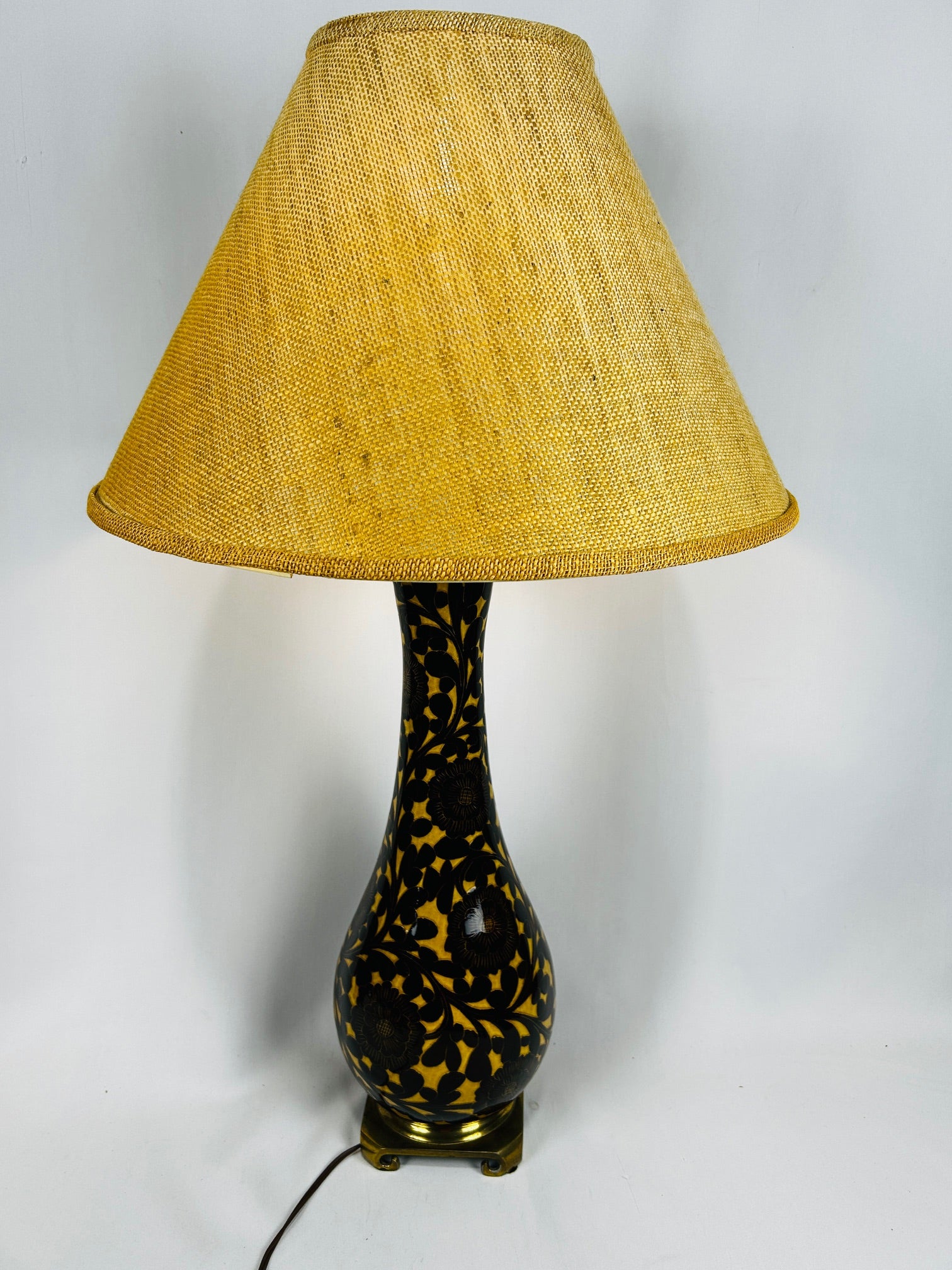 Large vase style on Brass base with brown flowers and brown parchment shade with lacing