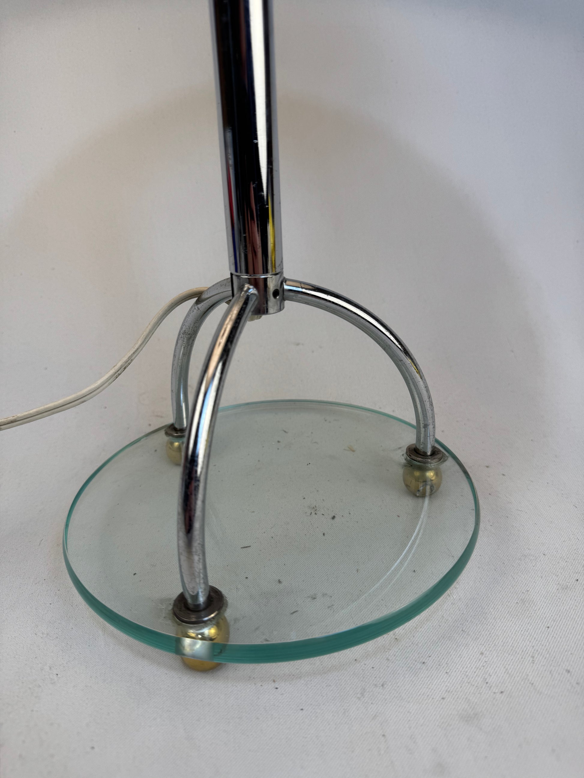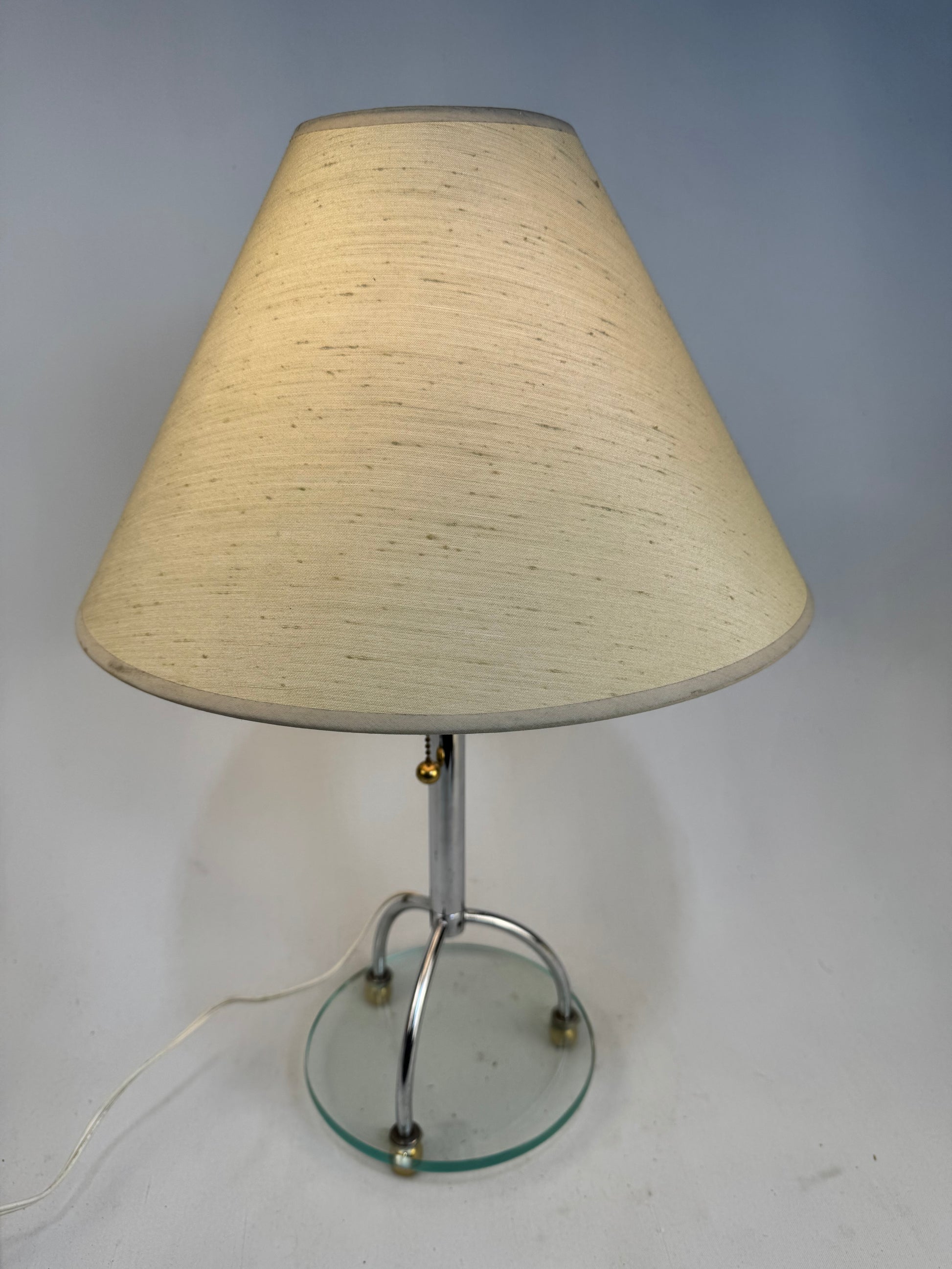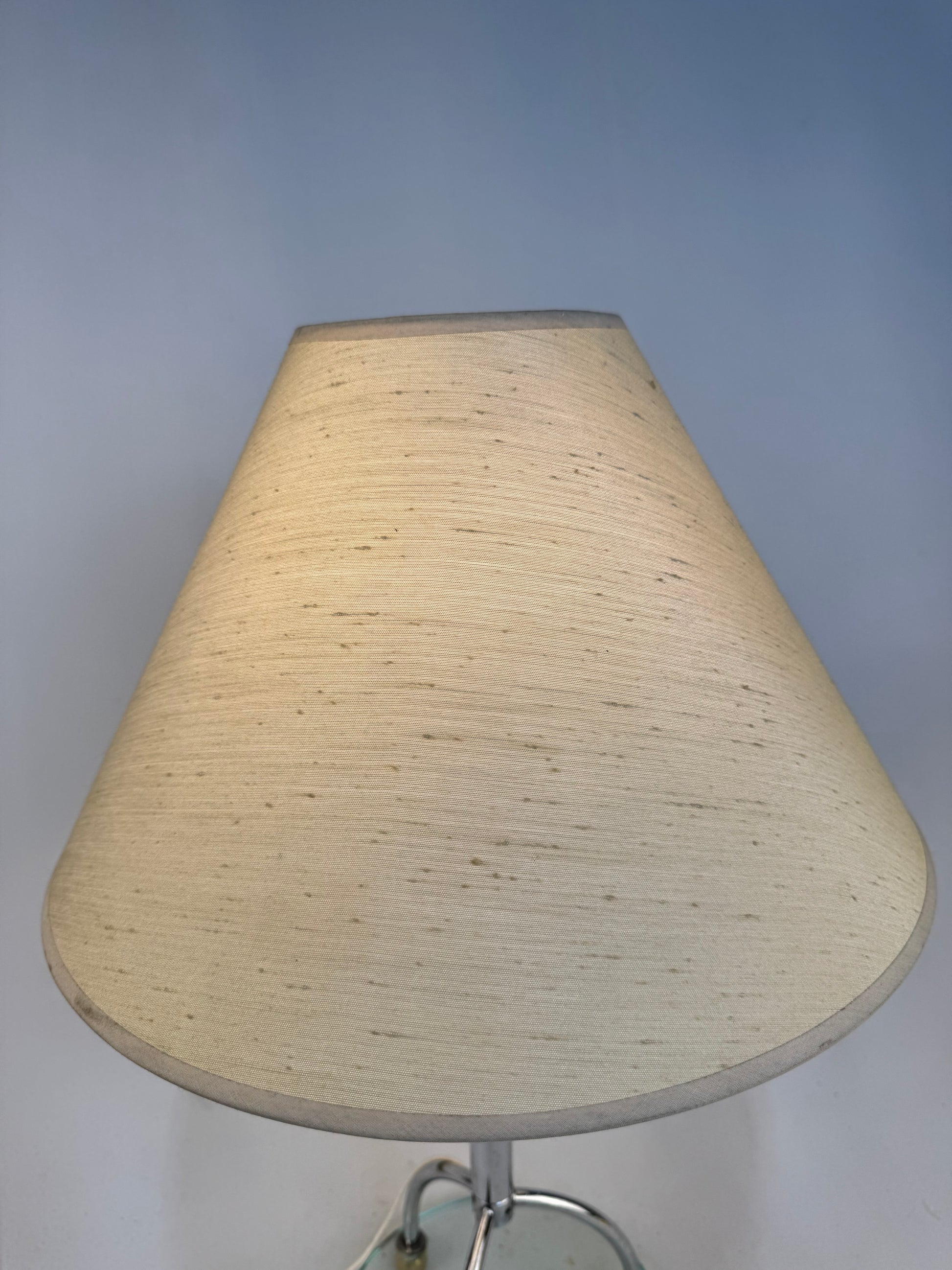 Contemporary Table Lamp with Glass Base Brushed Steel Finish & Silk Empire Shade.