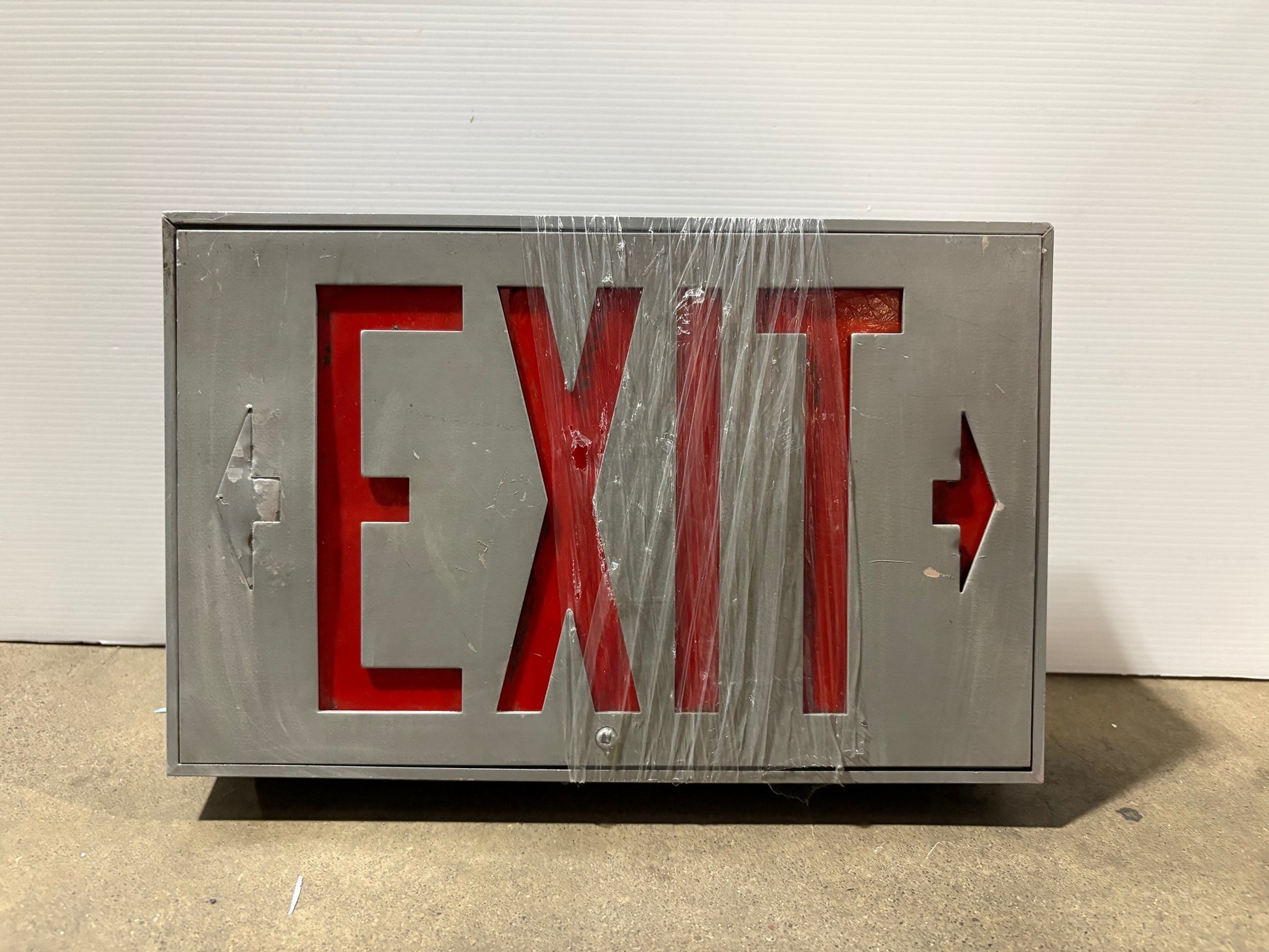 Silver metal with red acrylic exit sign & arrows on both sides tail plug at the back