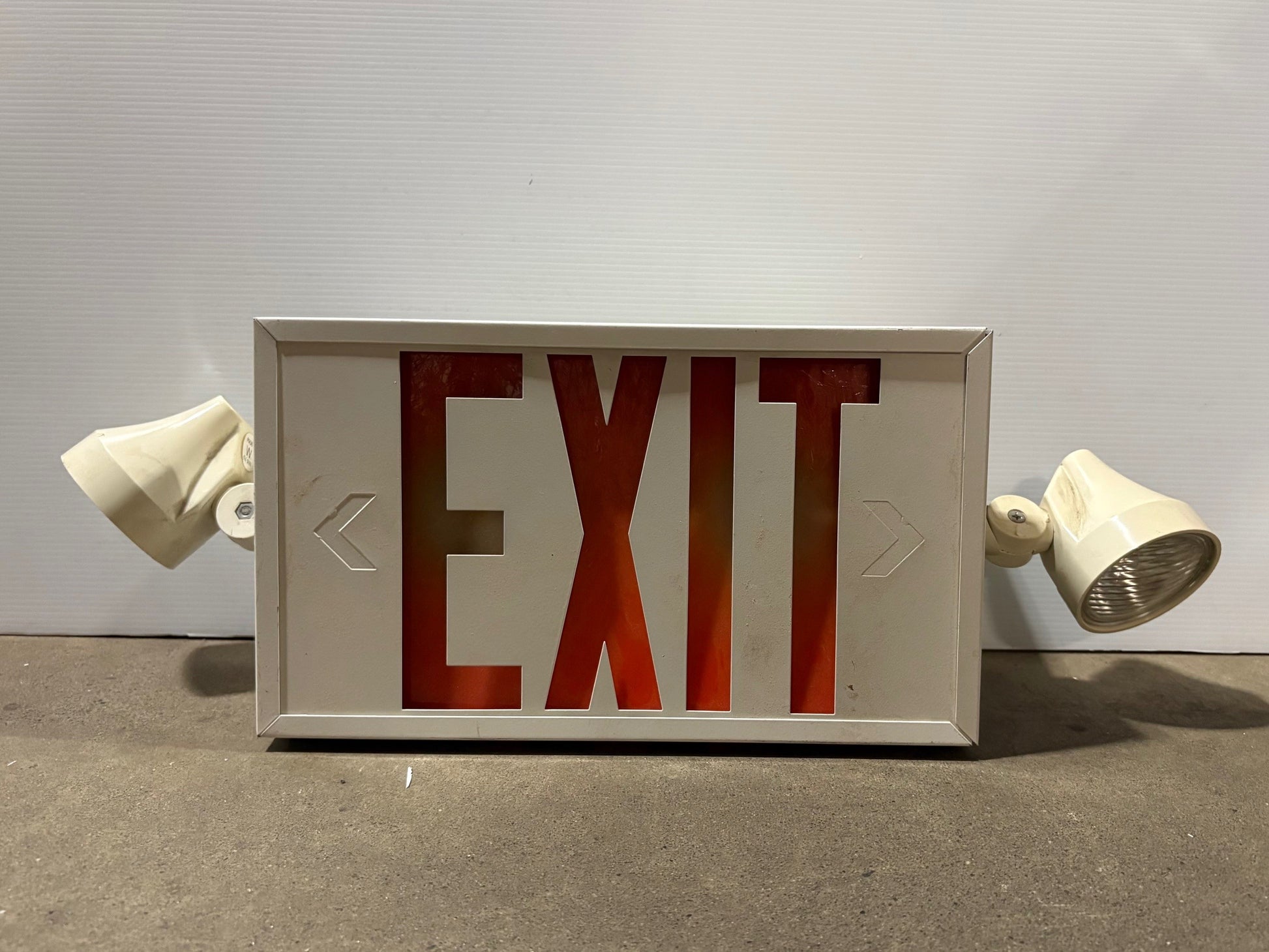 White metal with red acrylic exit sign & two articulating emergency lights