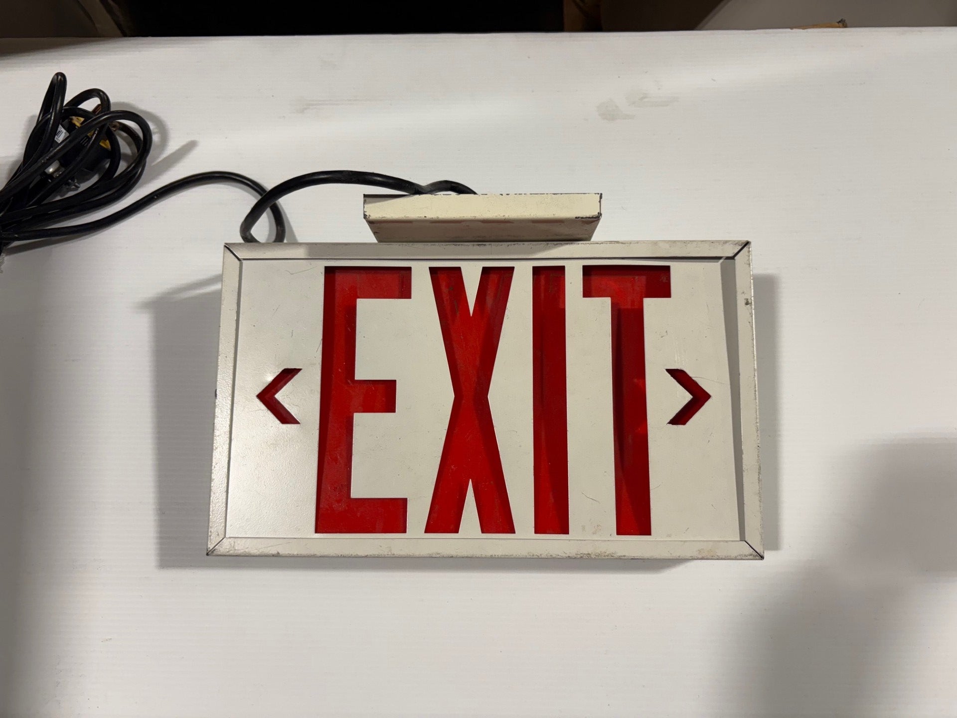 White metal with red acrylic exit sign, ceiling mount with tail plug