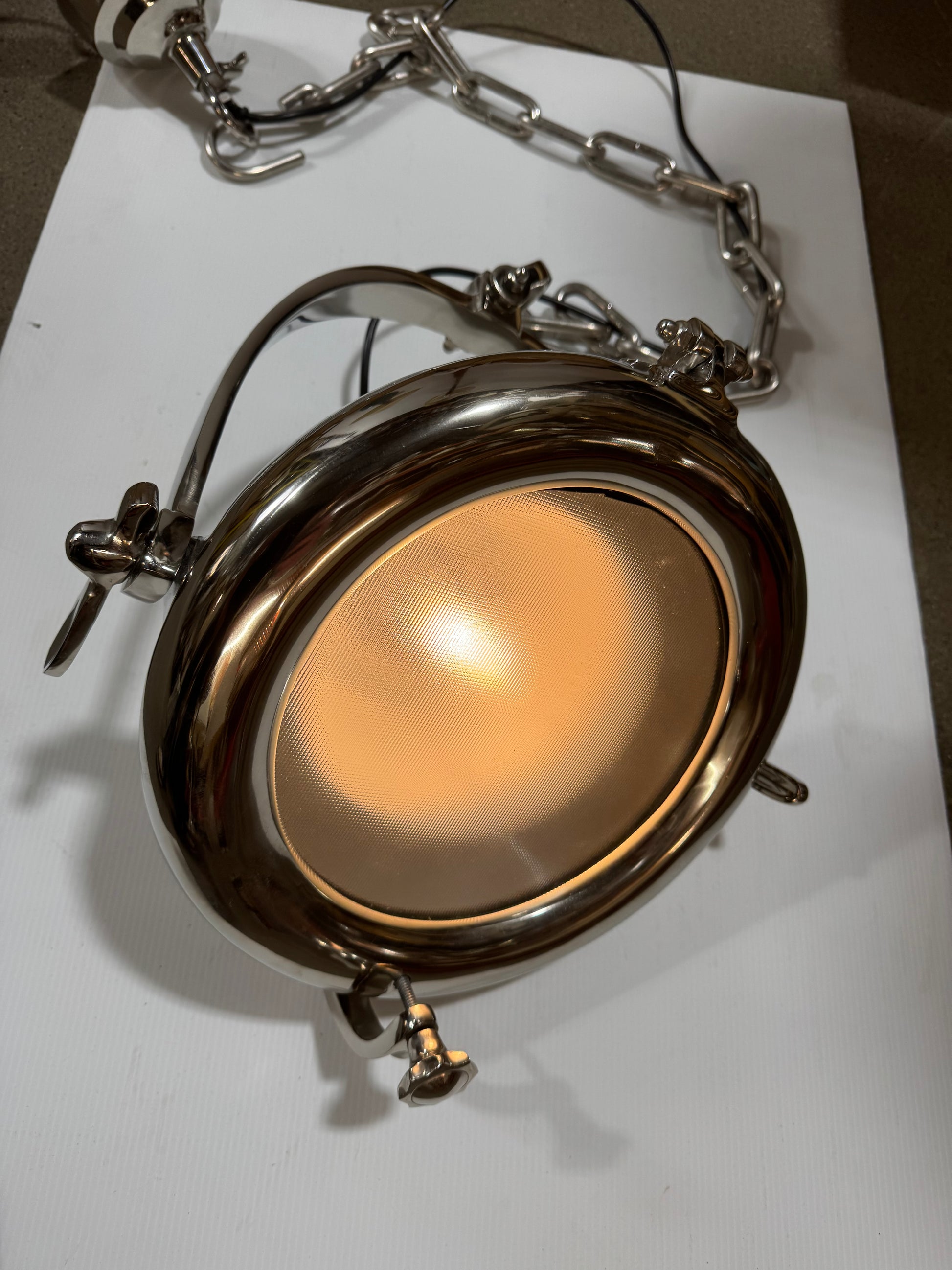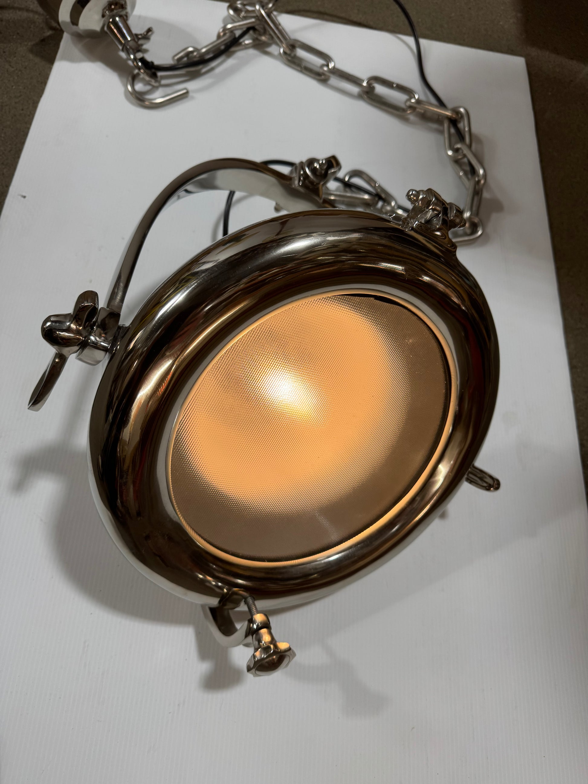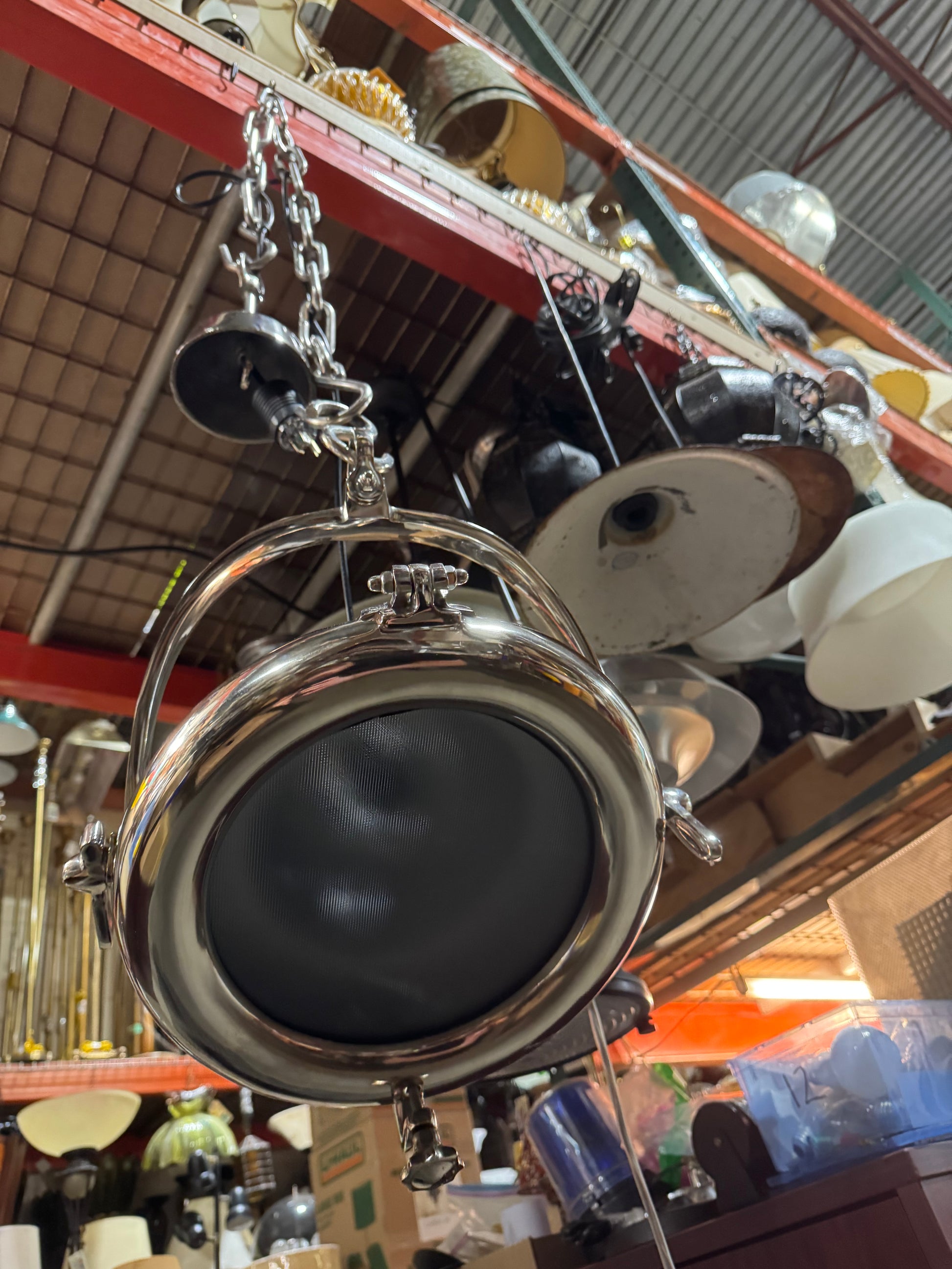 Industrial Pendant Light. Chrome Spotlight with Hinge Suspended on Chain with Prismatic Glass Lens.