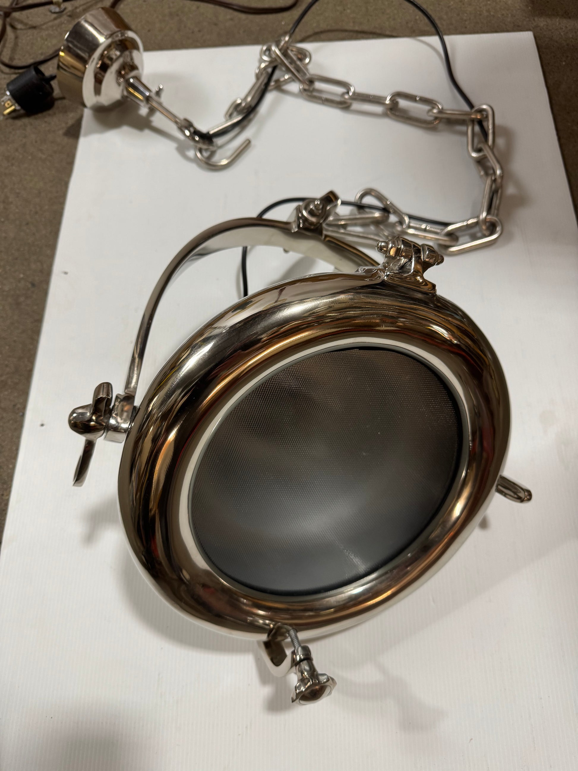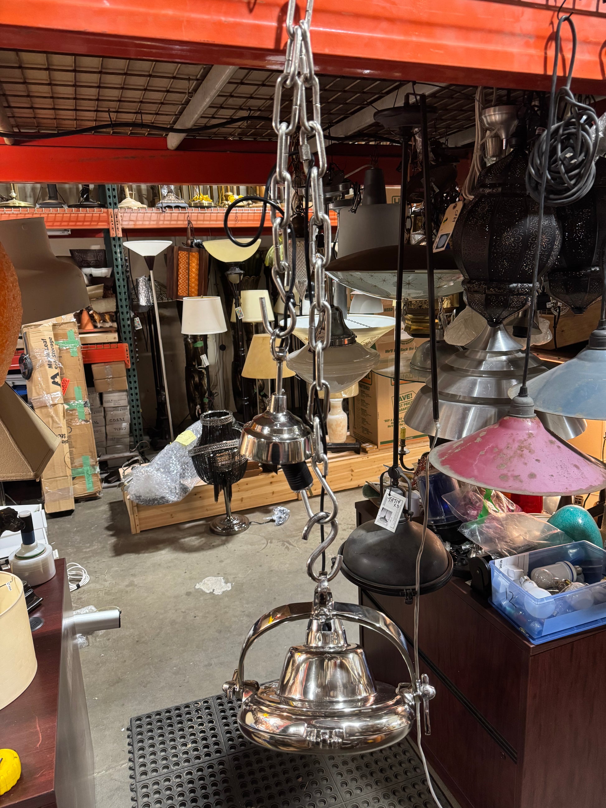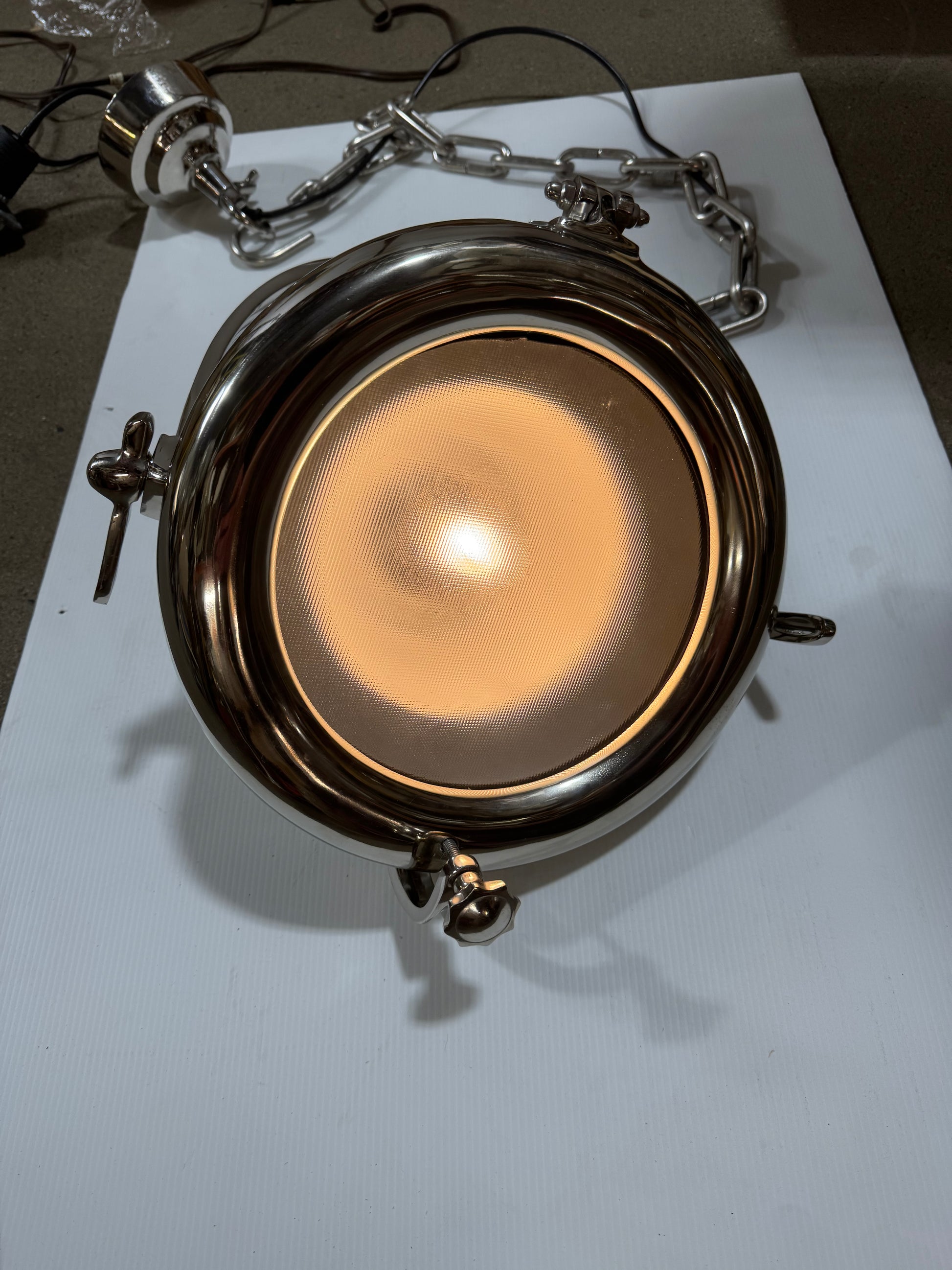 Industrial Pendant Light. Chrome Spotlight with Hinge Suspended on Chain with Prismatic Glass Lens.