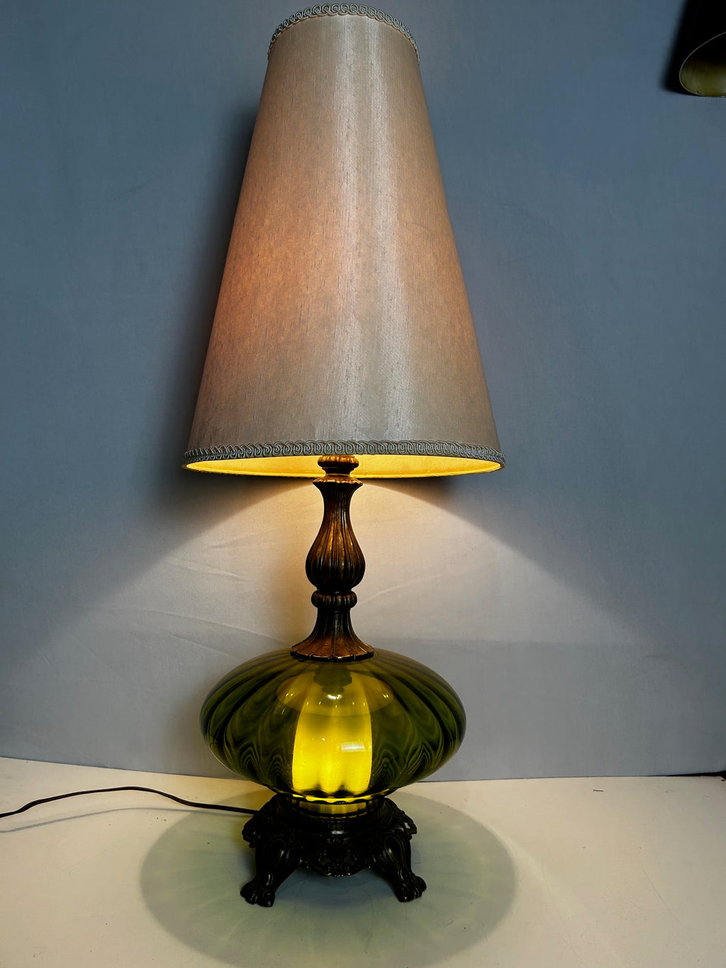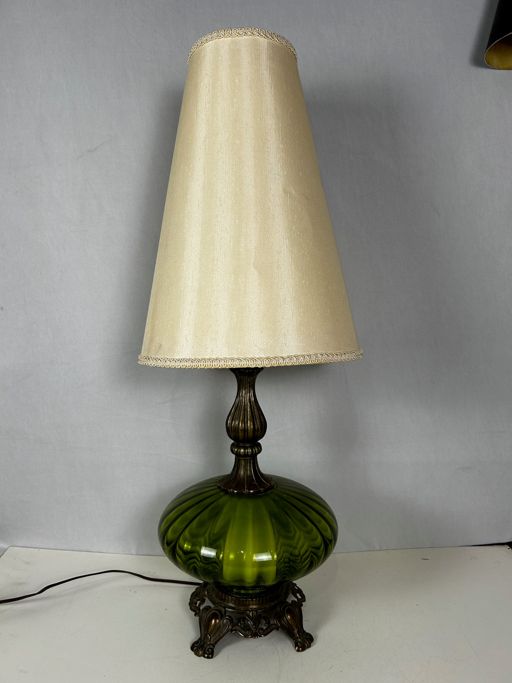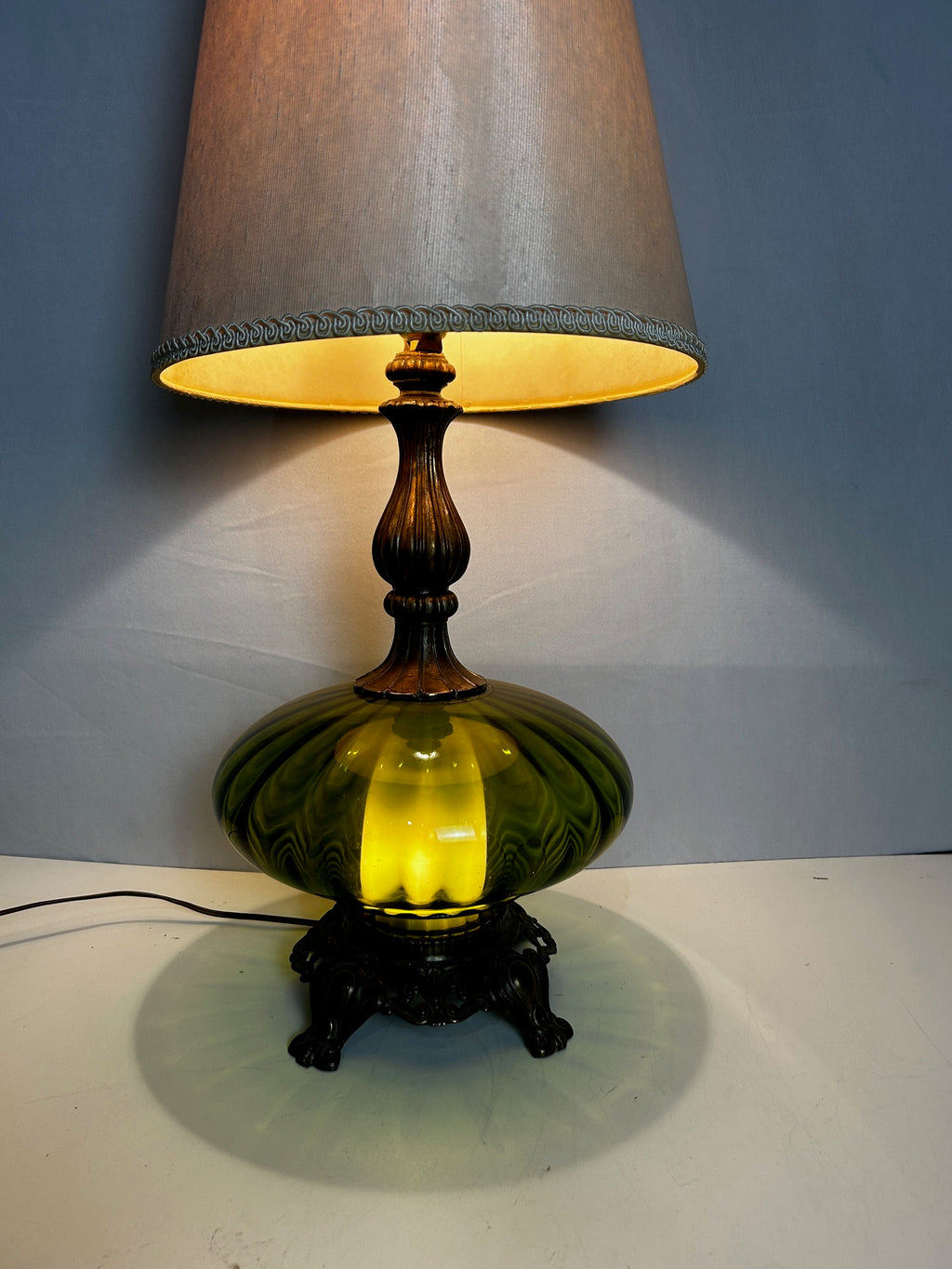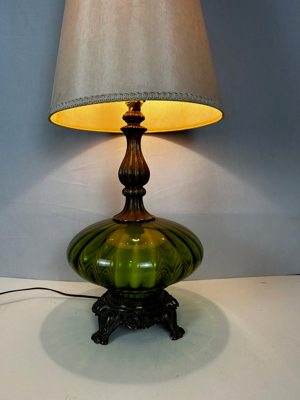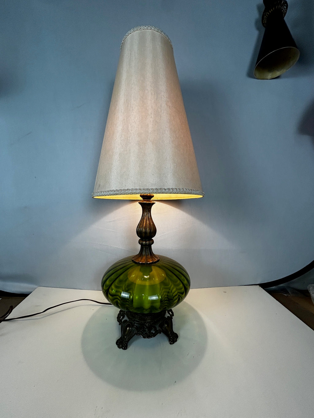 Table lamp Green glass with fabric cone shaped shade and 3 light settings.