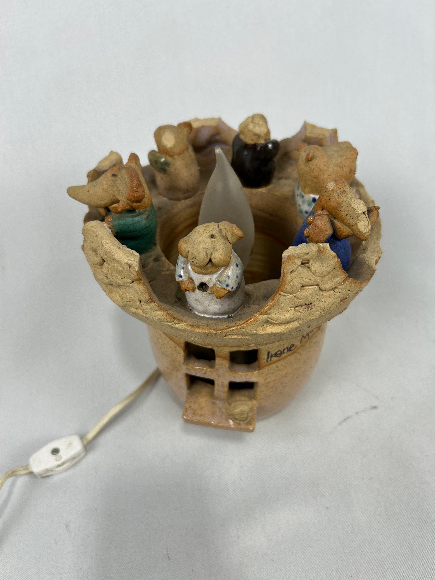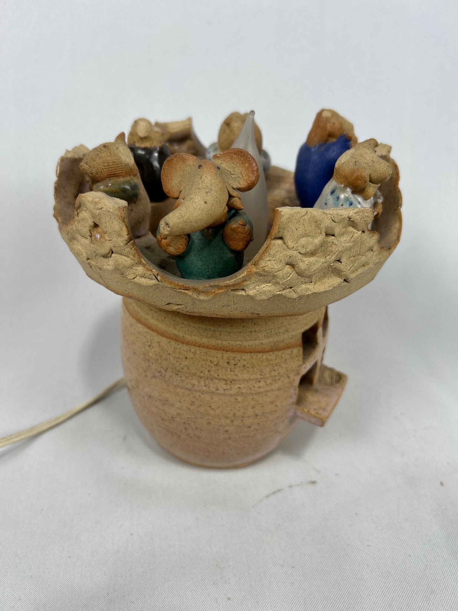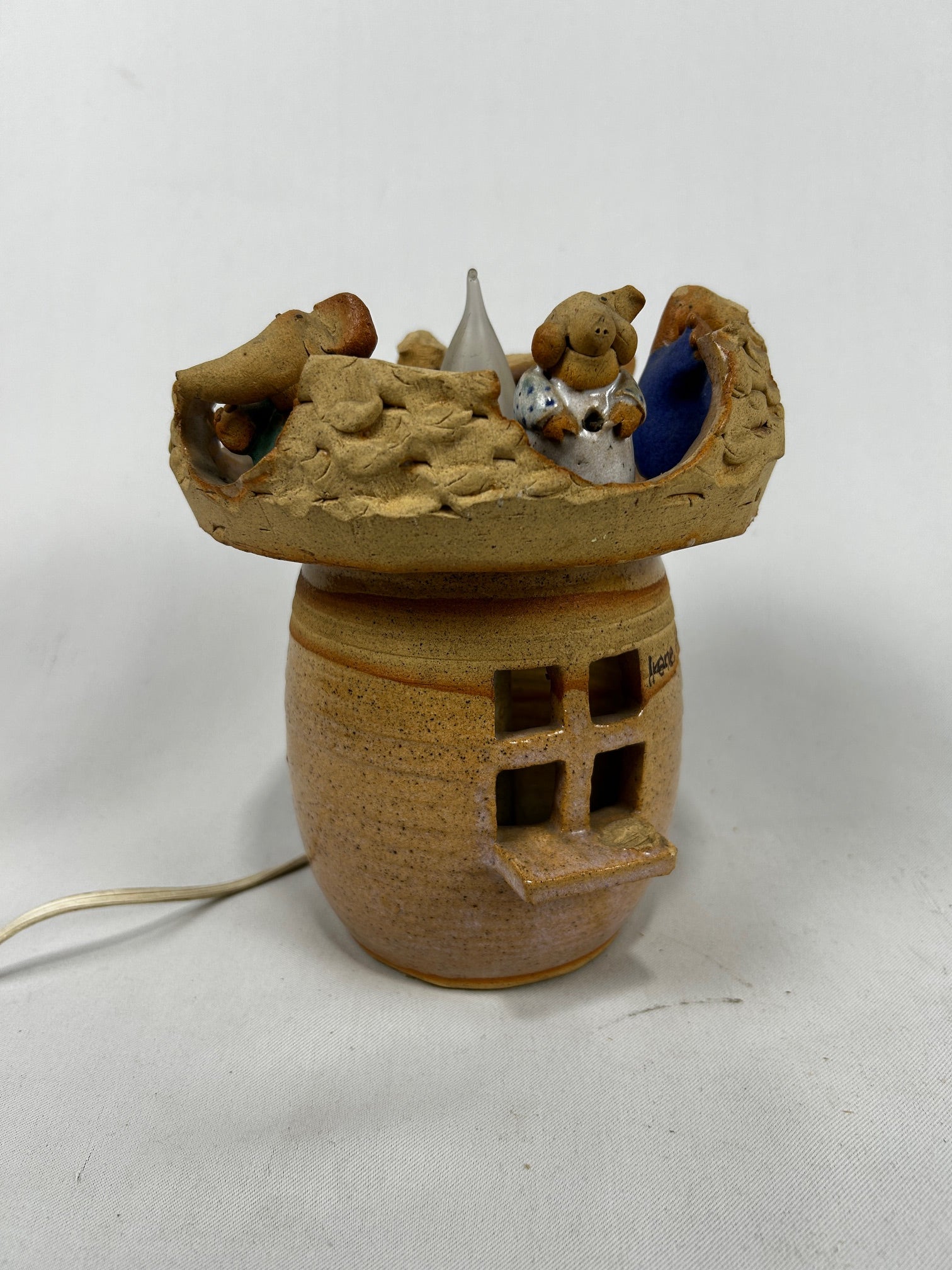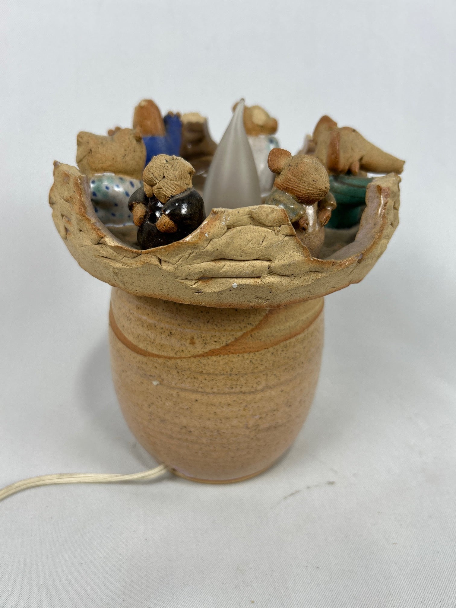 ceramic pottery honeypot and ceramic figures on top.