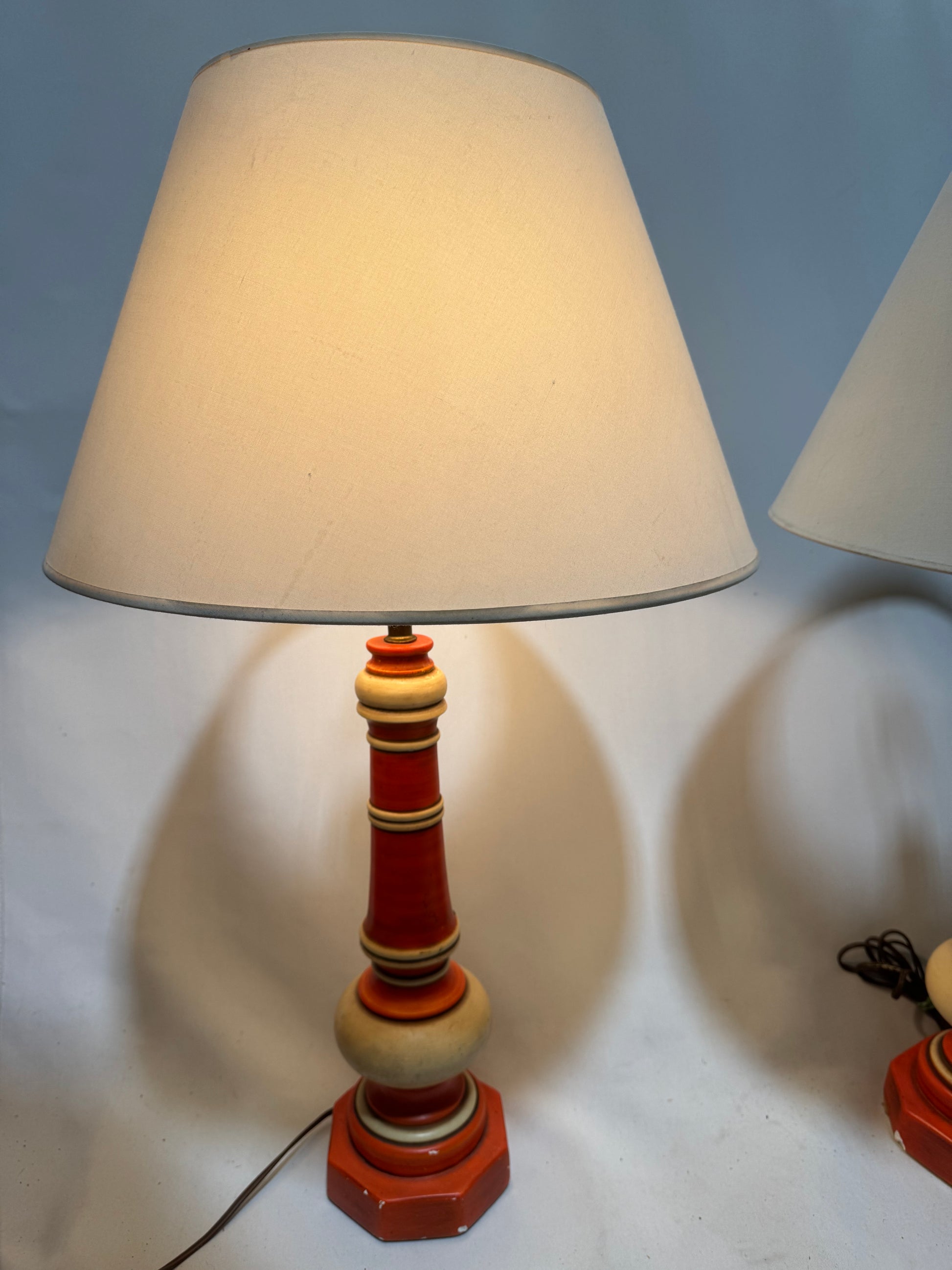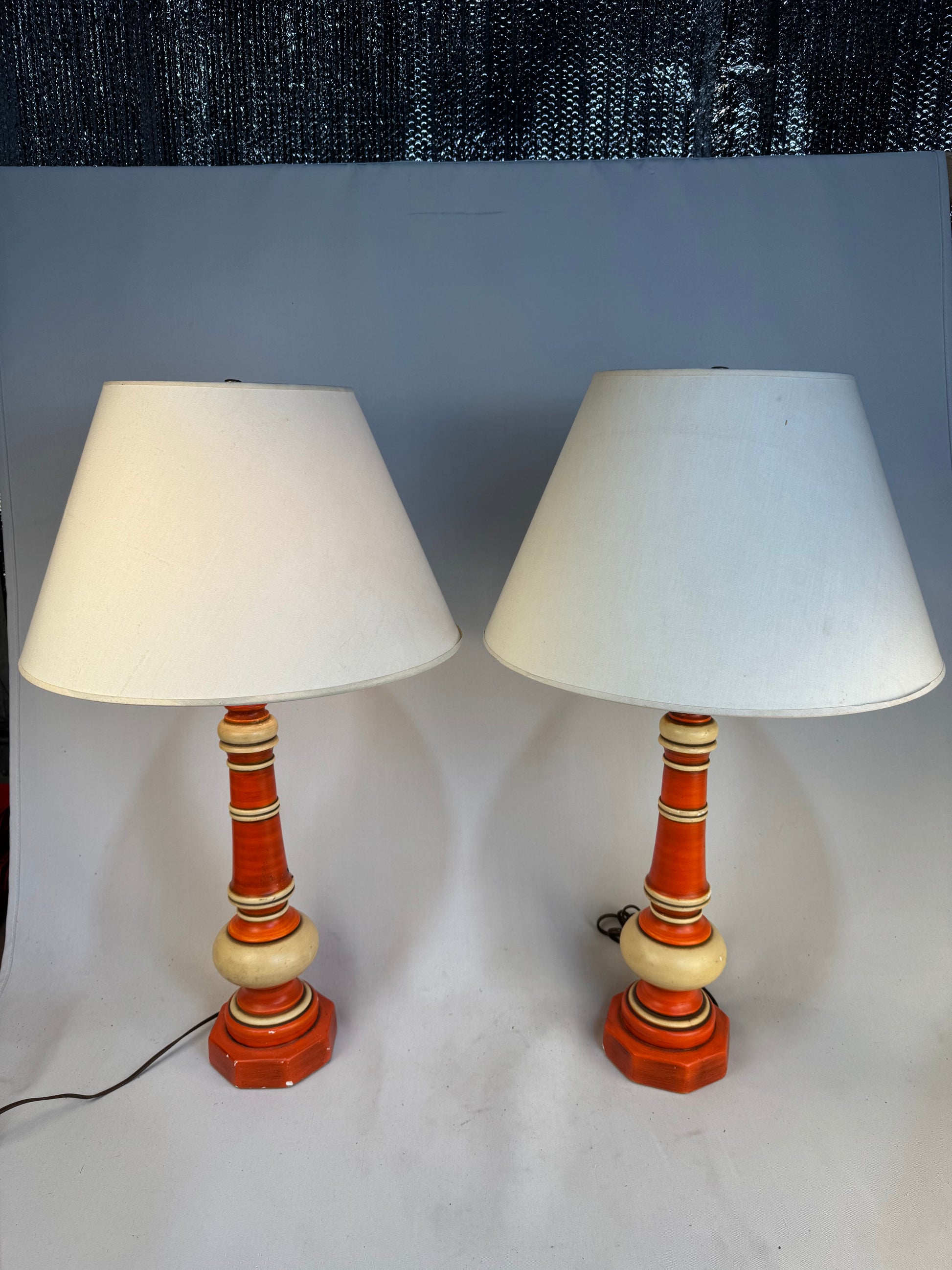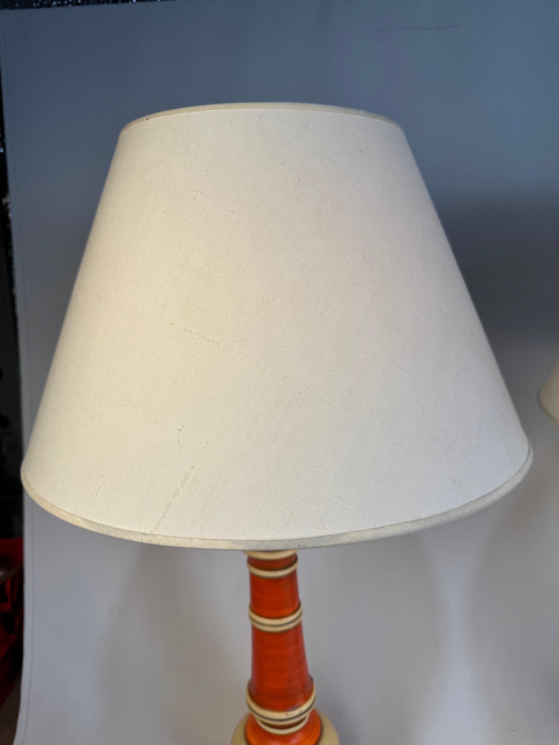 Kitsch Table Lamp. Orange & Beige Ceramic Spindle with Tapered Empire Shade.