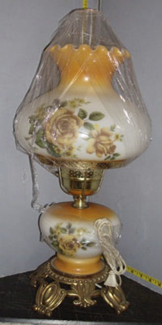White and yellow ceramic painted oil lamp with chimney