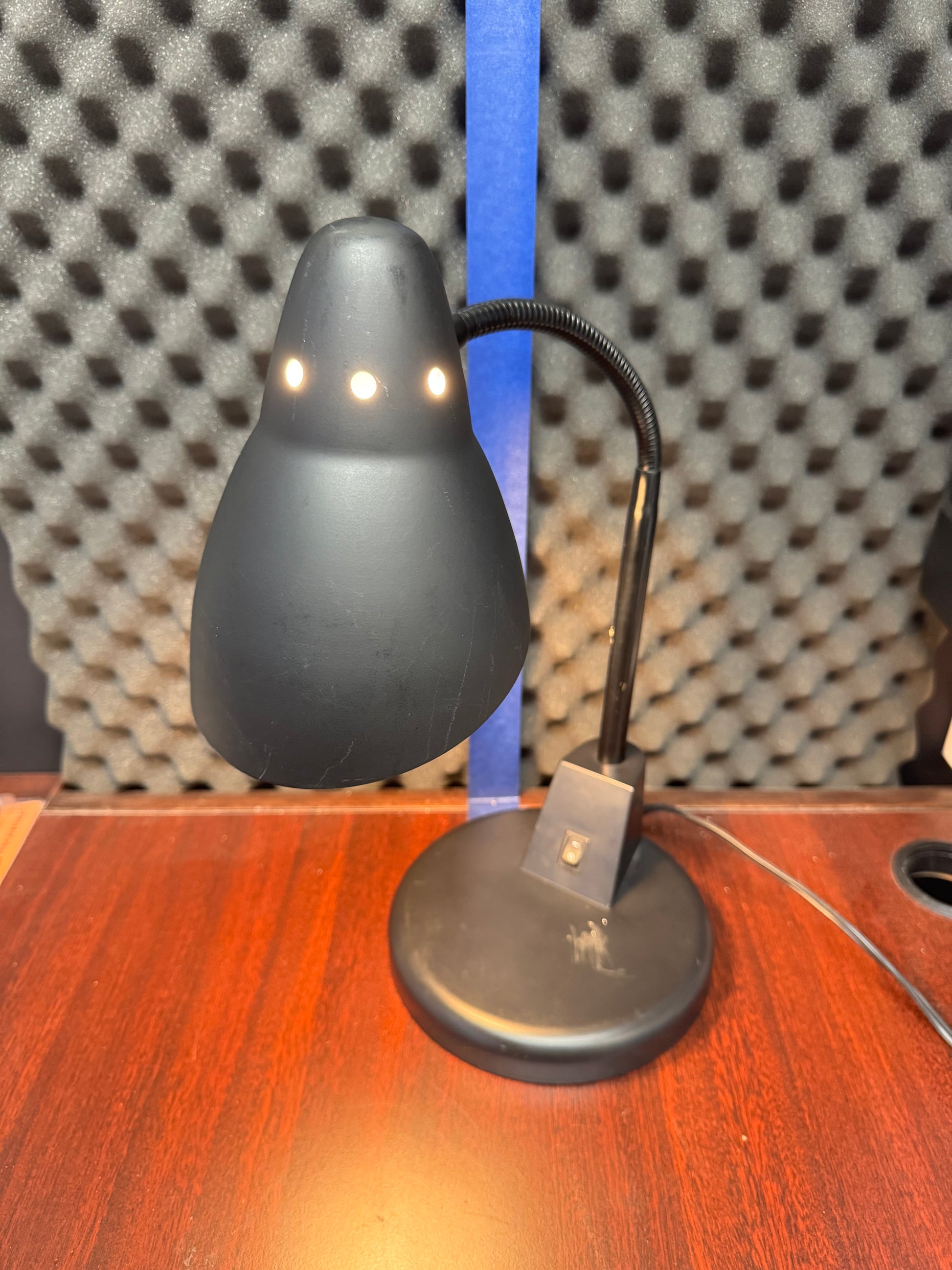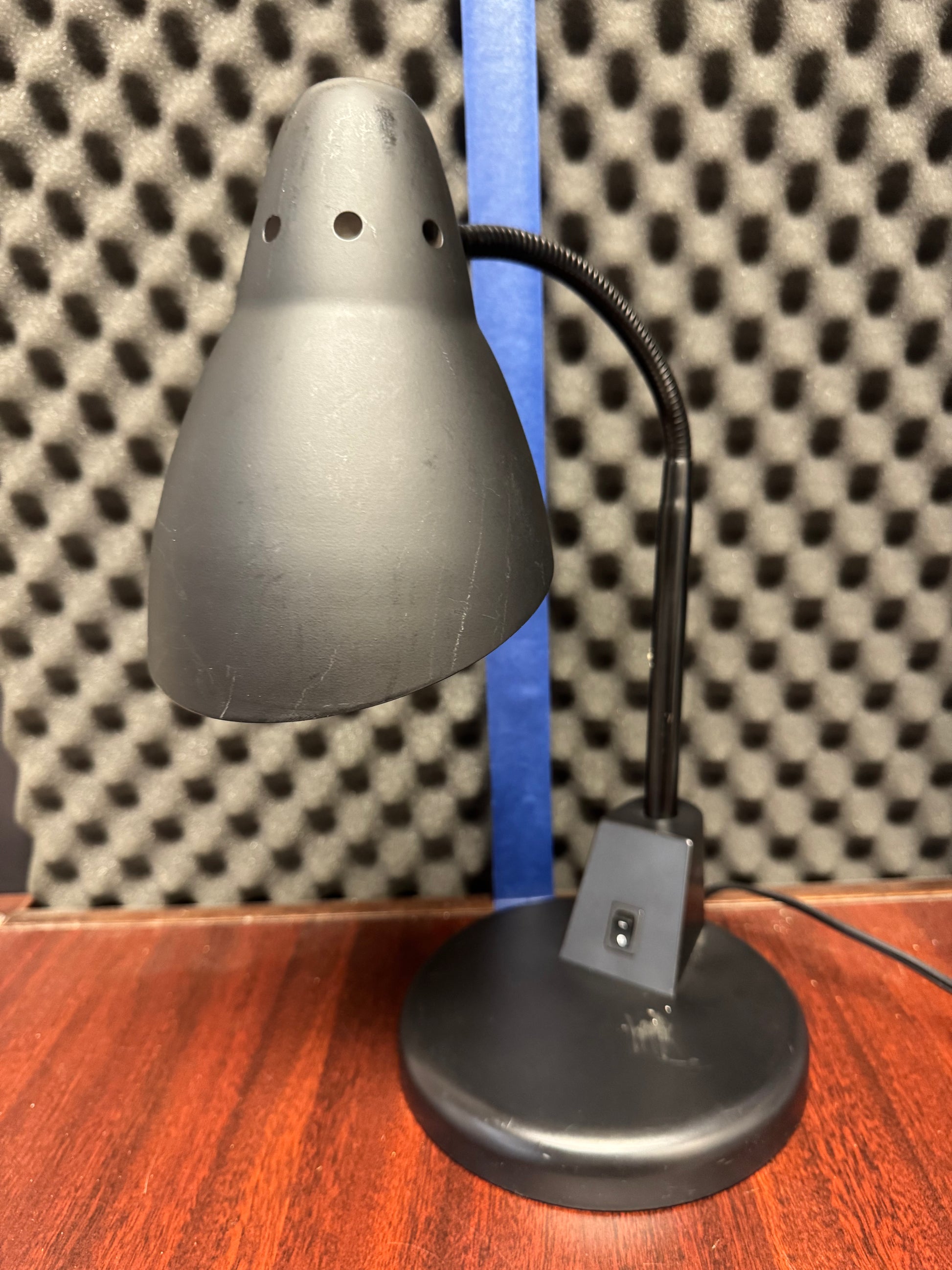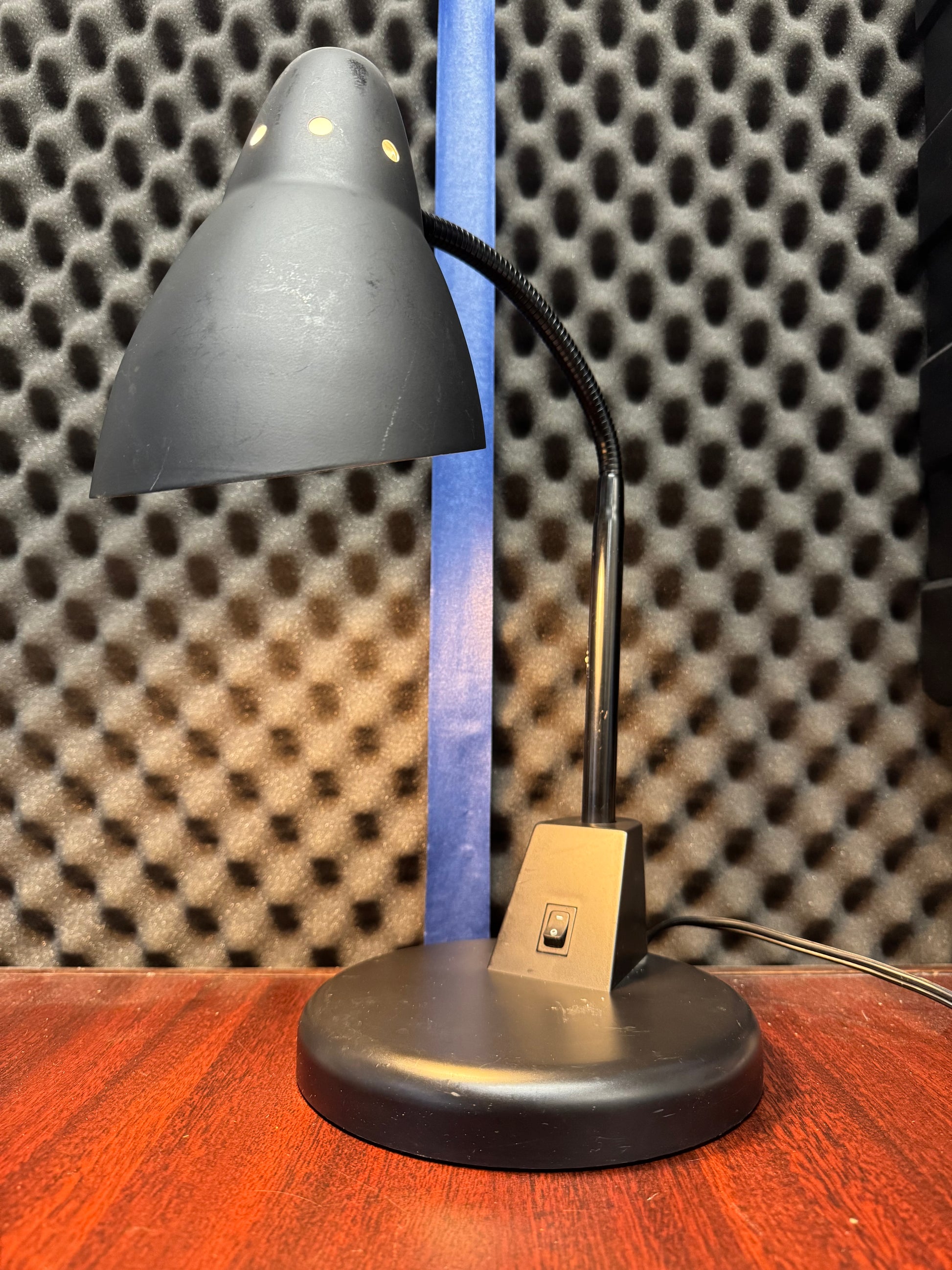 Traditional Black Gooseneck Desk Lamp with perforated top and on off switch.
