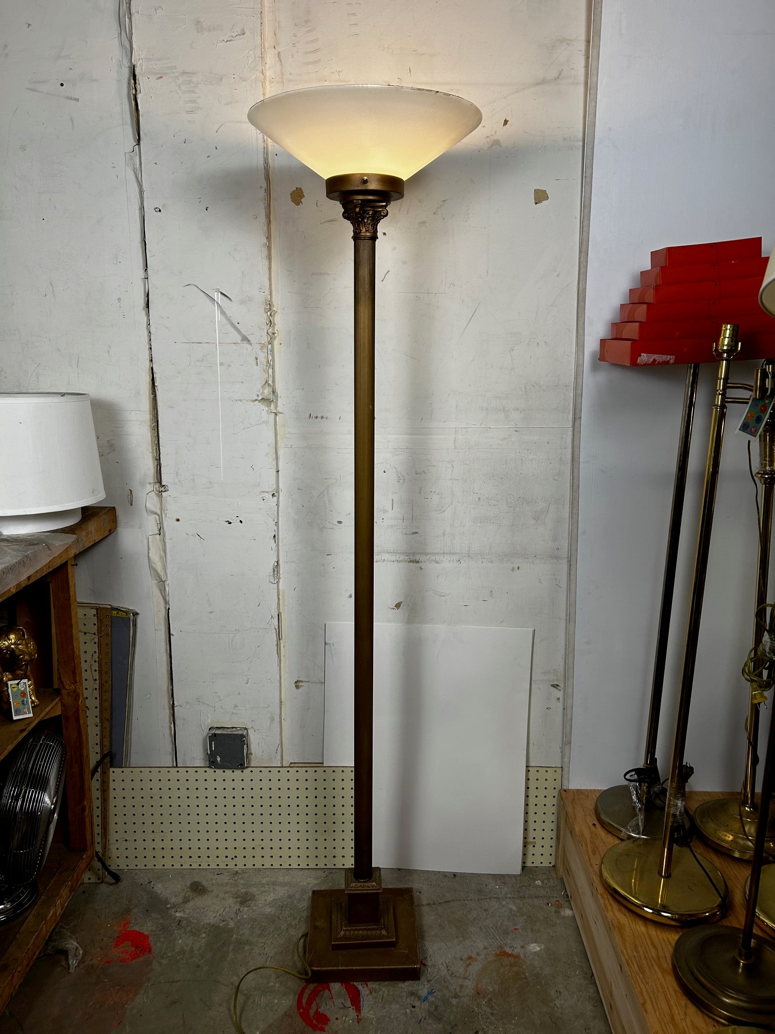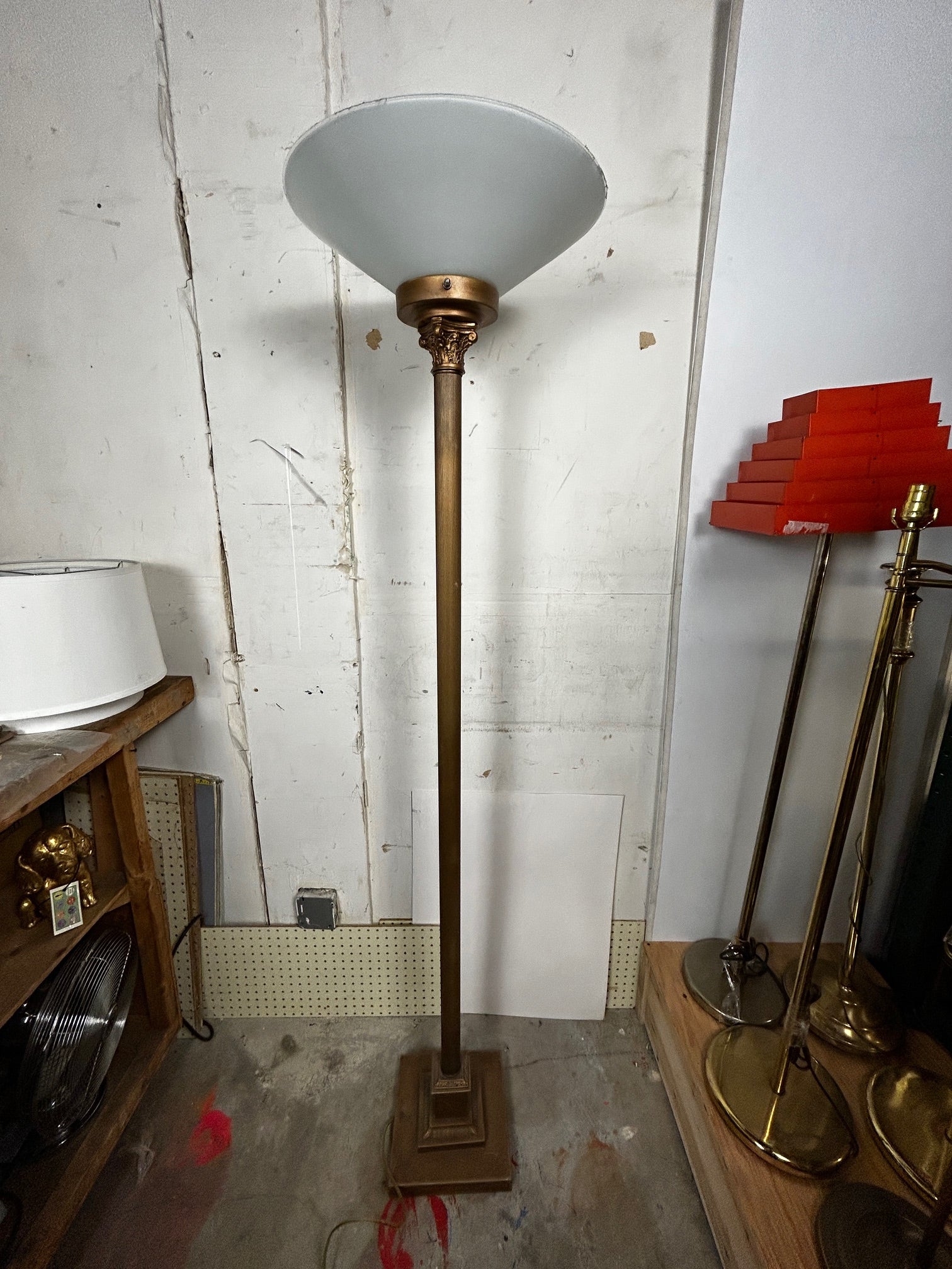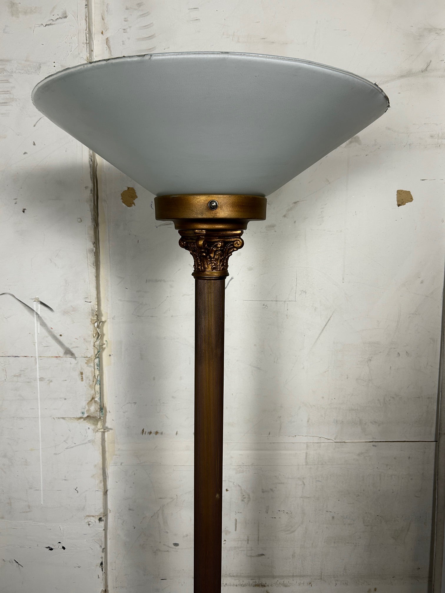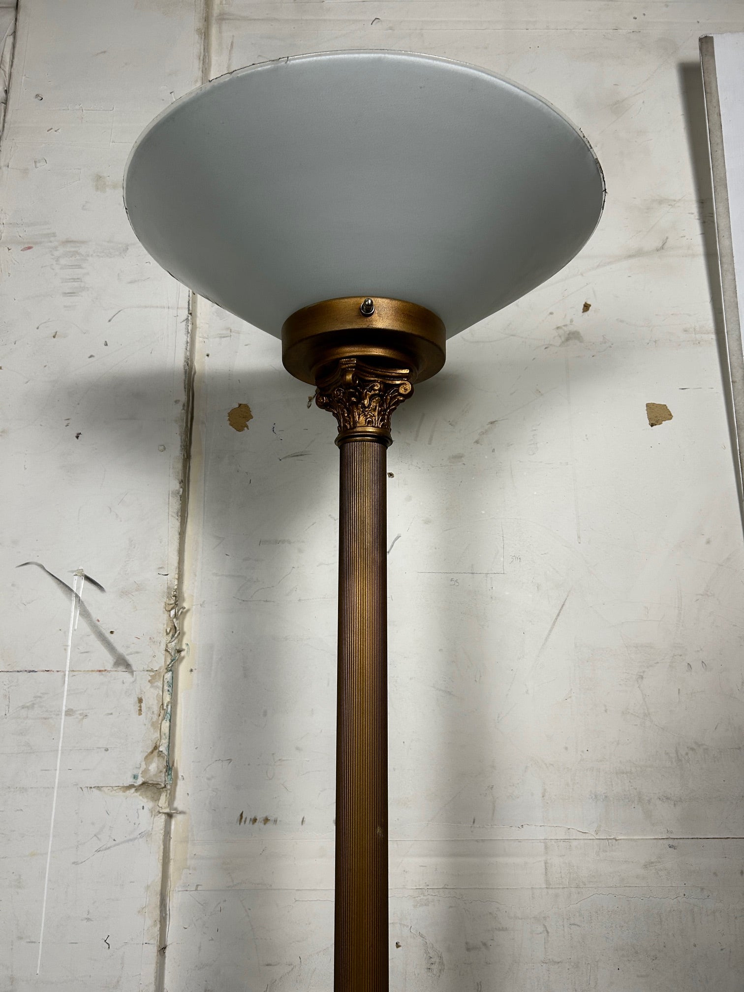 Floor lamp Torchiere Antique gold finish with ribbed pole and with Frosted glass shade NOTE GLASS IS VERY FRAGILE AND NOT REPLACEABLE