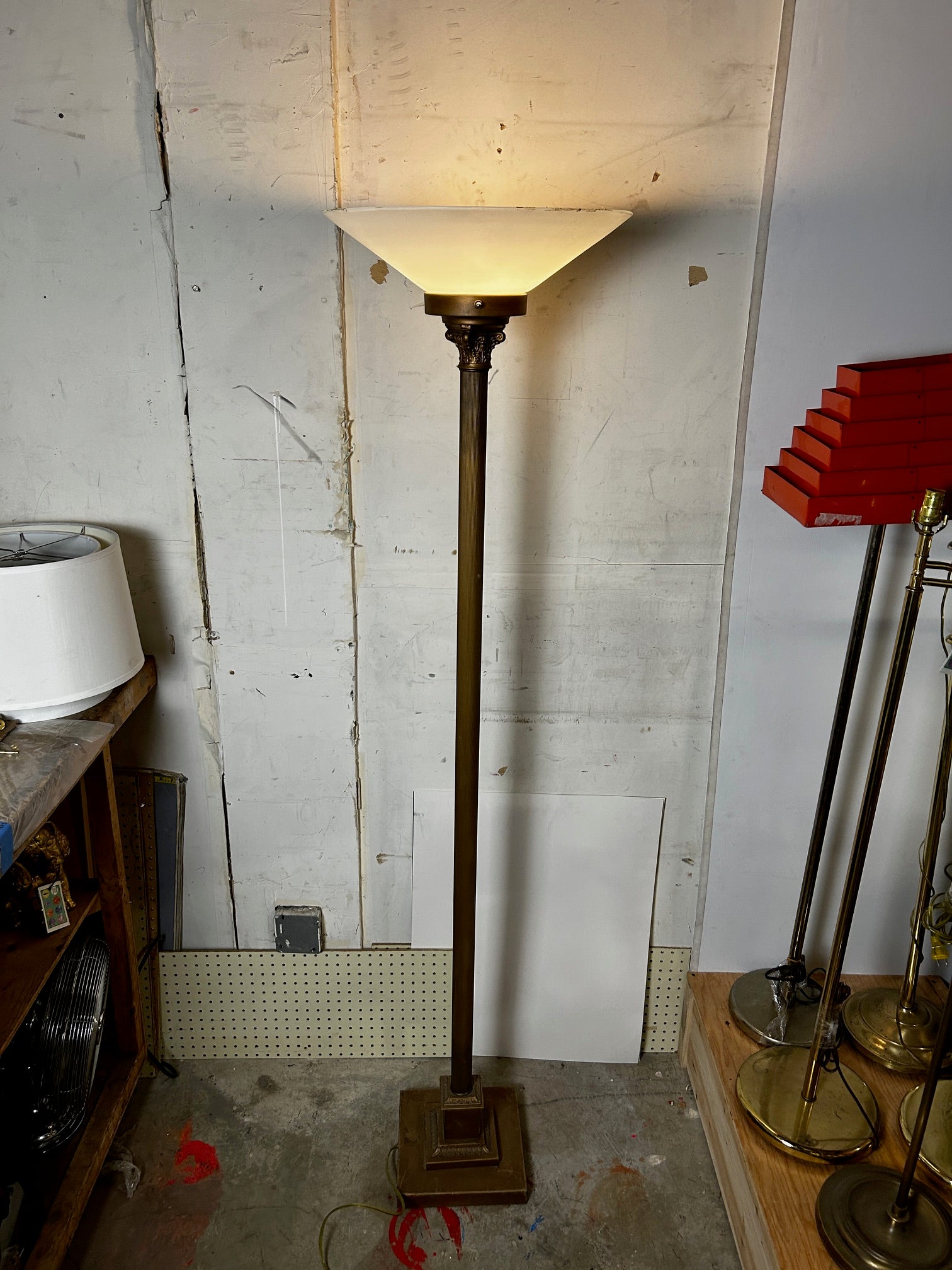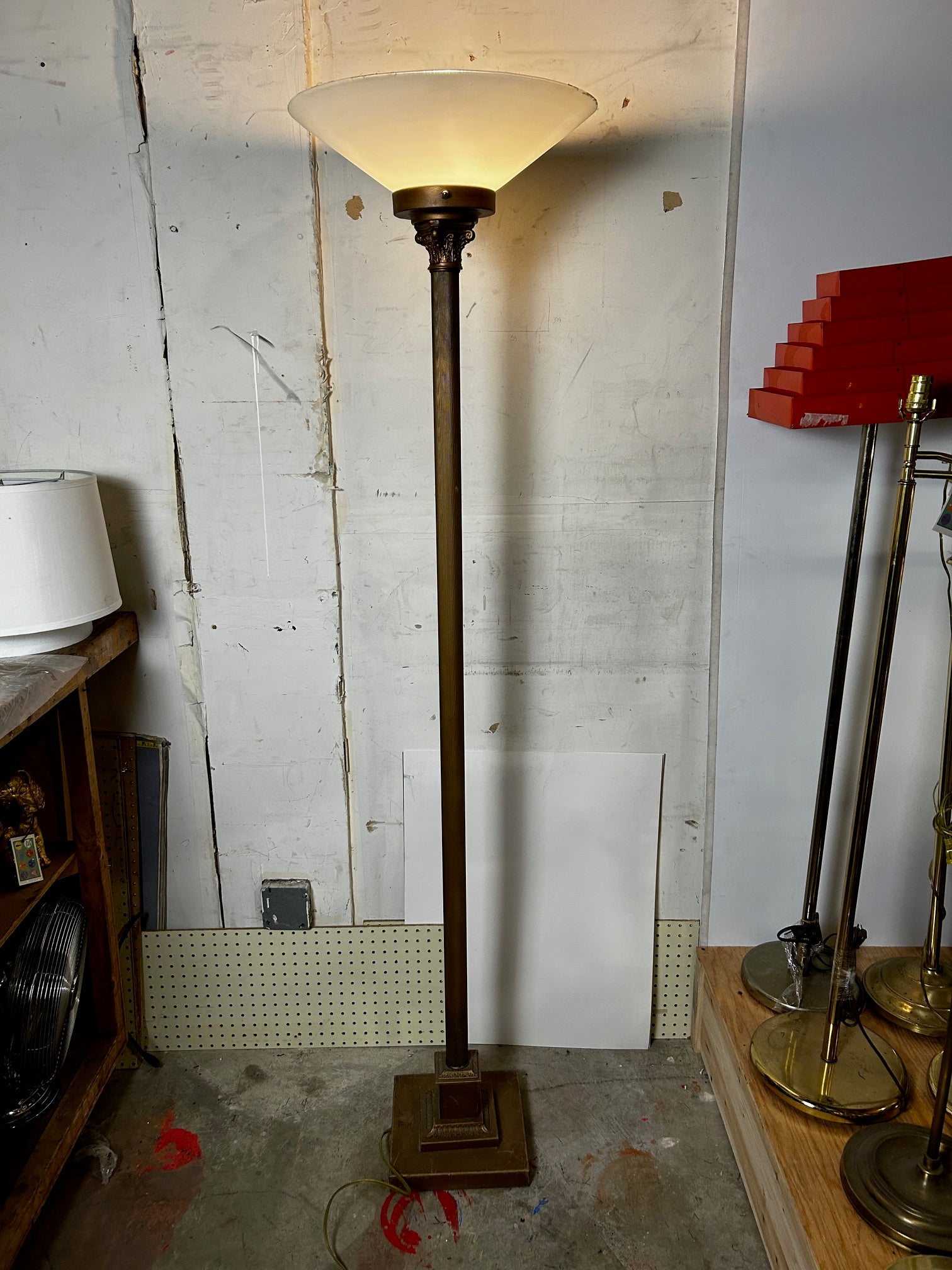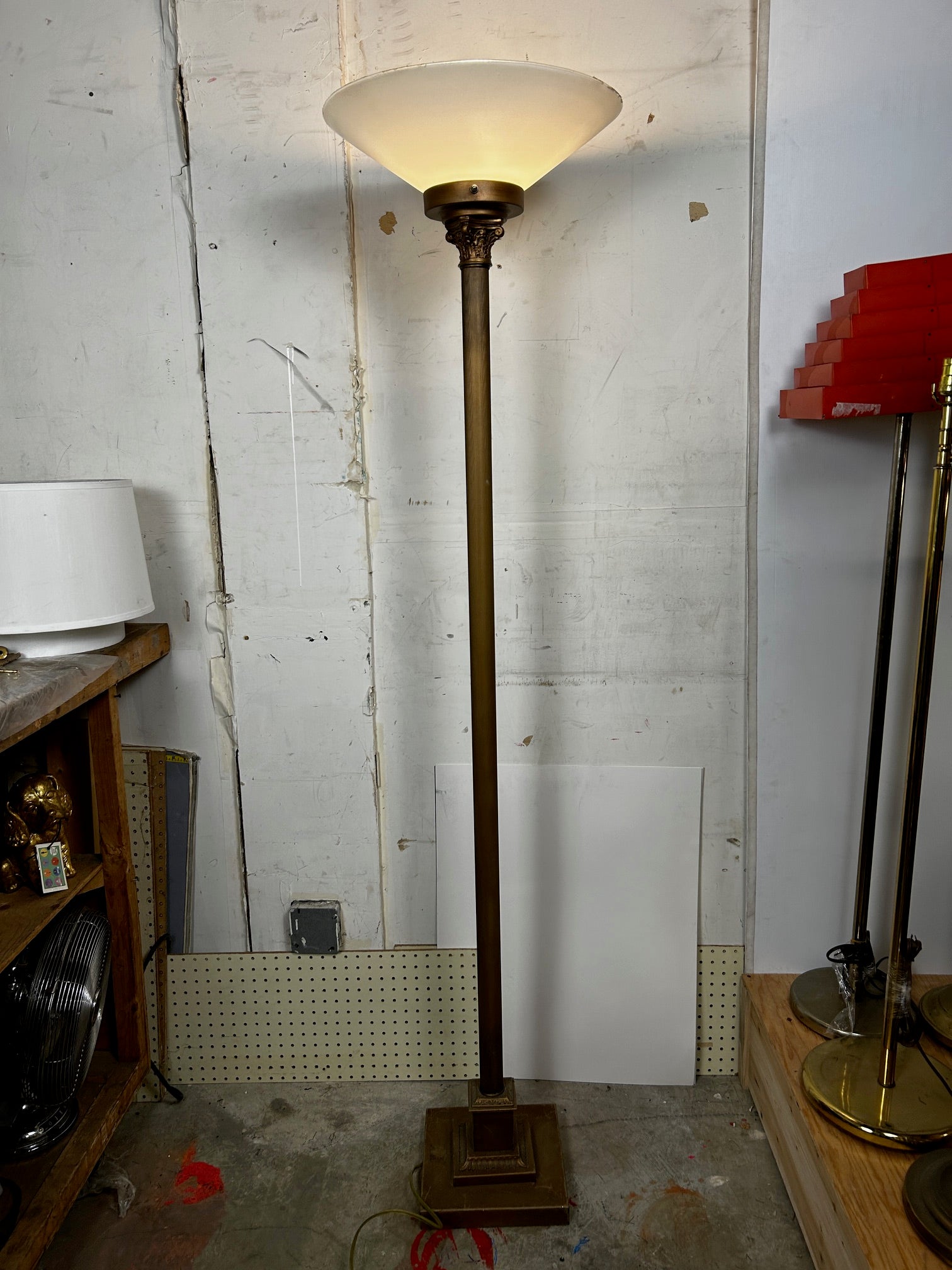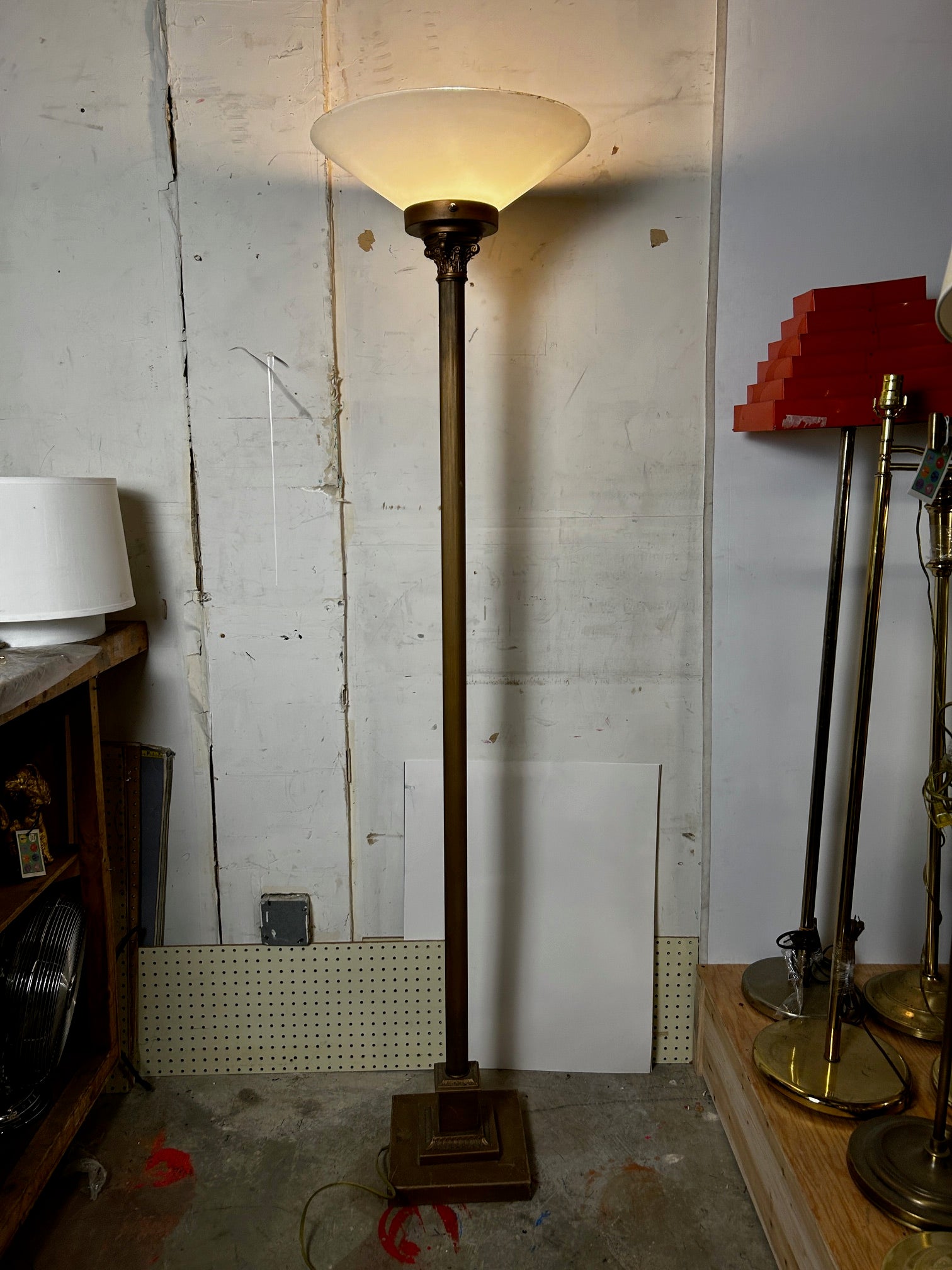 Floor lamp Torchiere Antique gold finish with ribbed pole and with Frosted glass shade NOTE GLASS IS VERY FRAGILE AND NOT REPLACEABLE