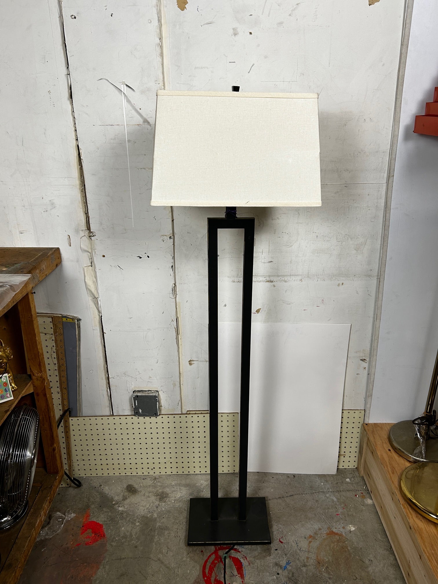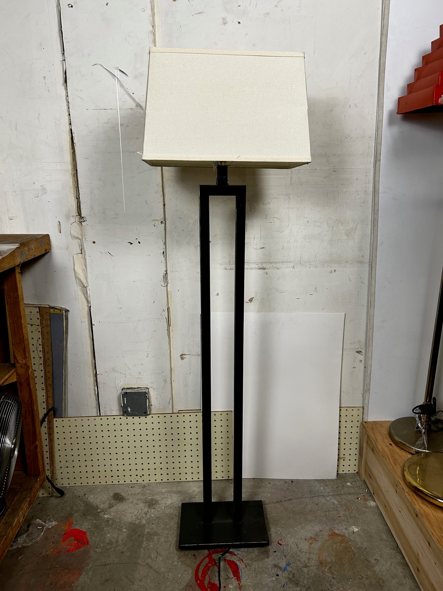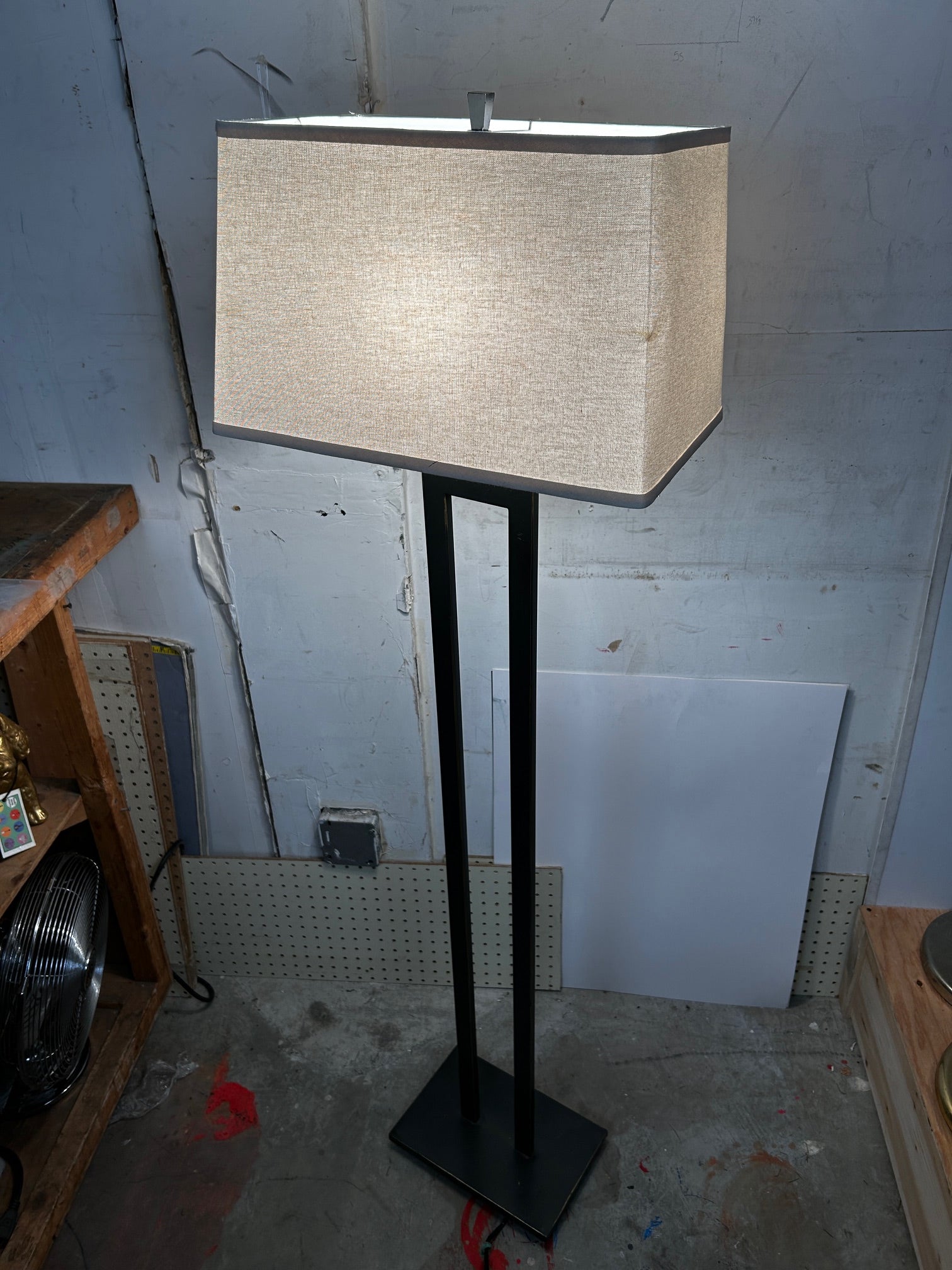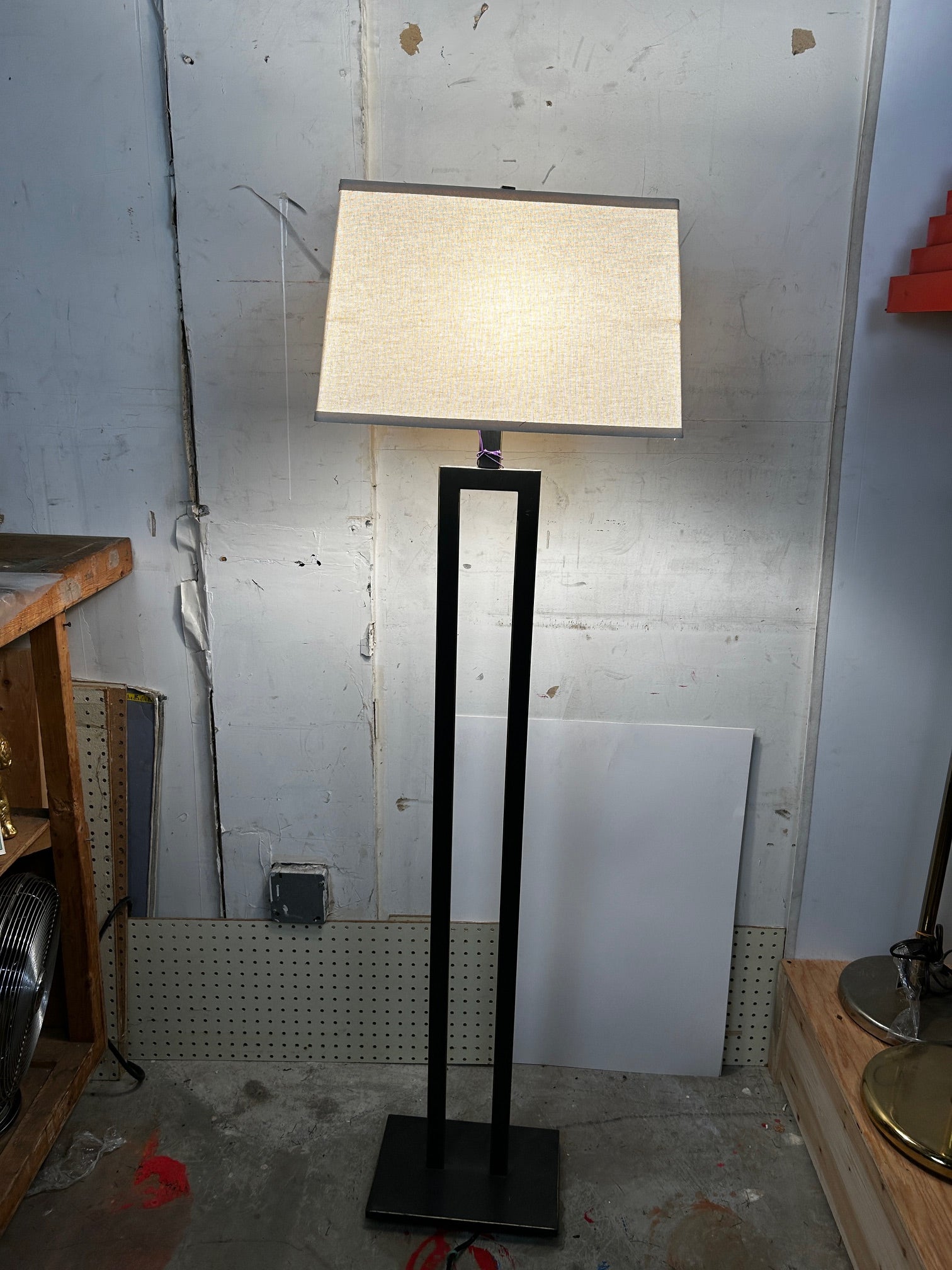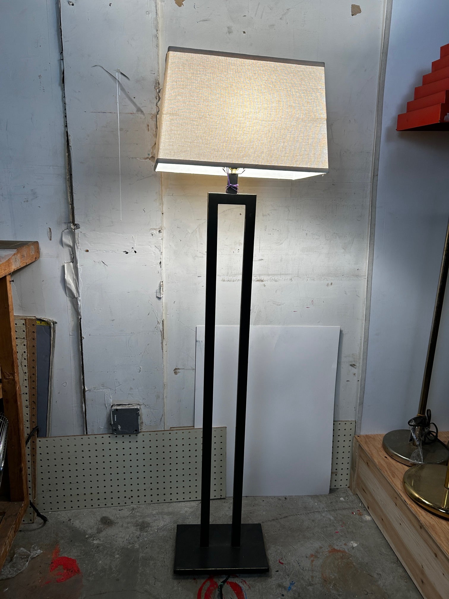 Floor Lamp Bronze finish metal bases with antique gold rub on edges with rectangle shade in ivory linen.