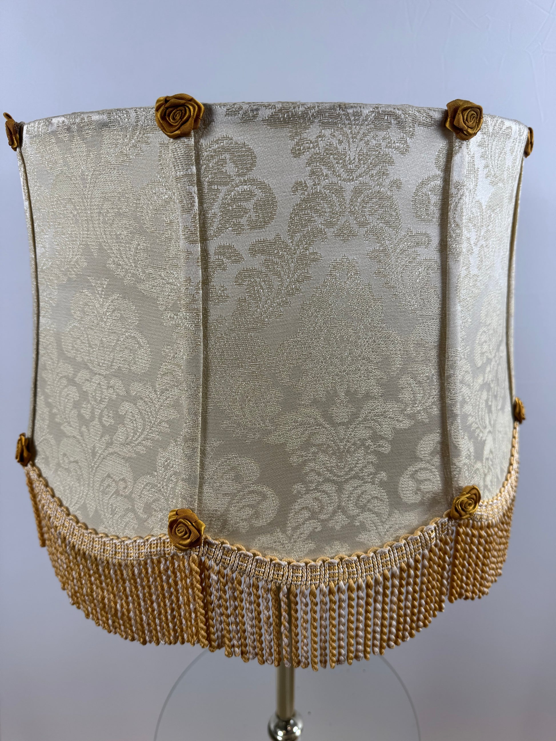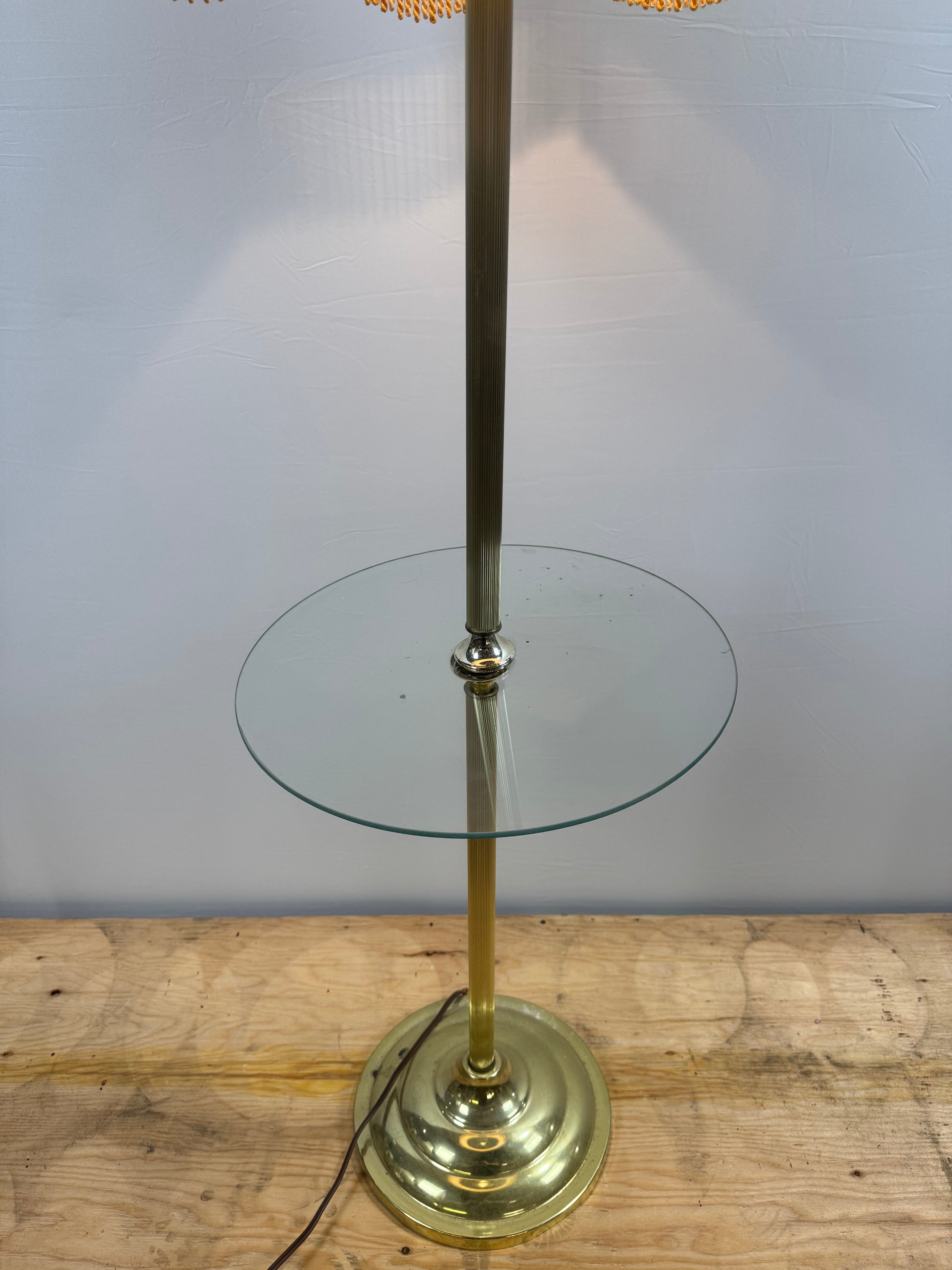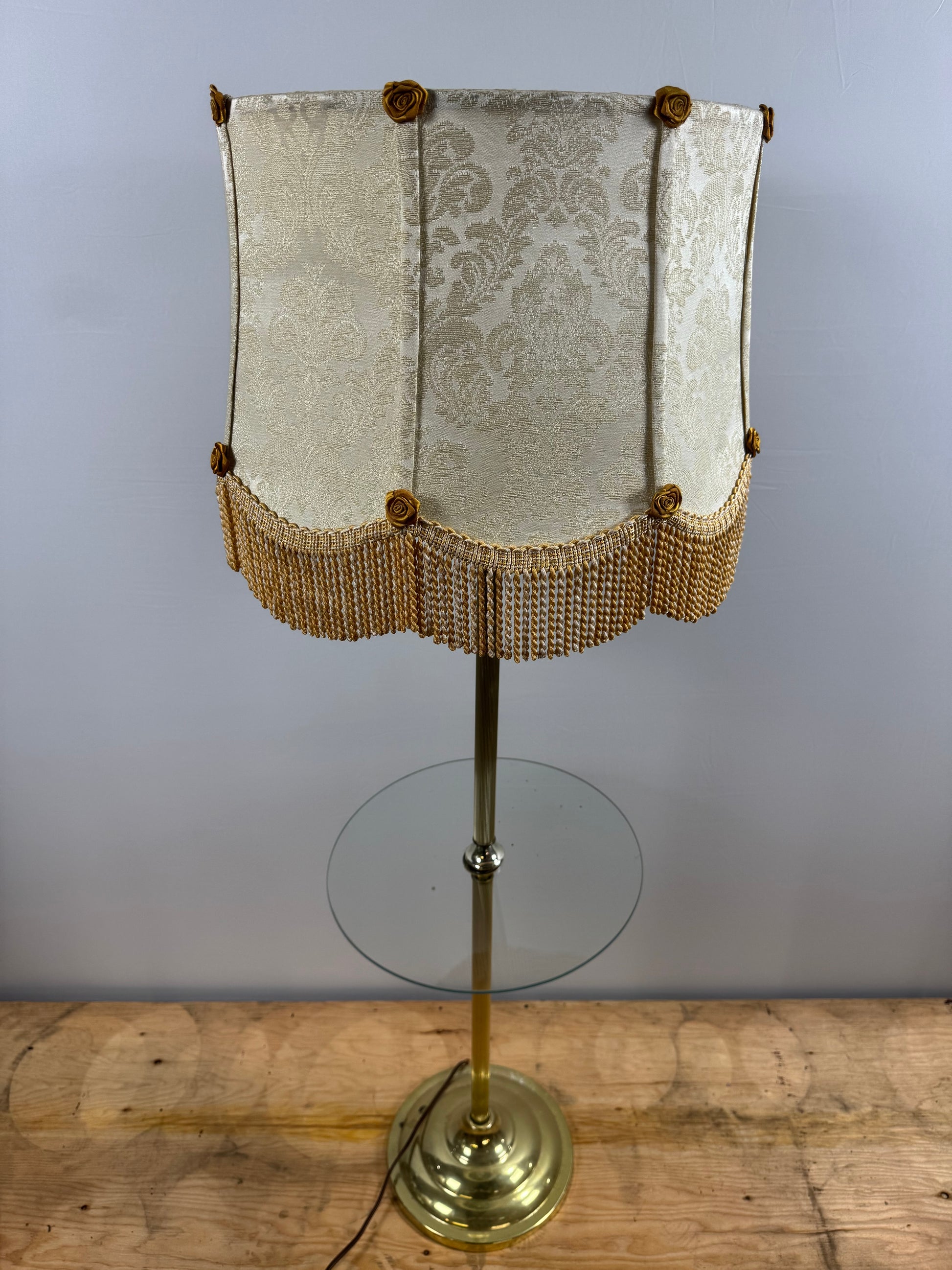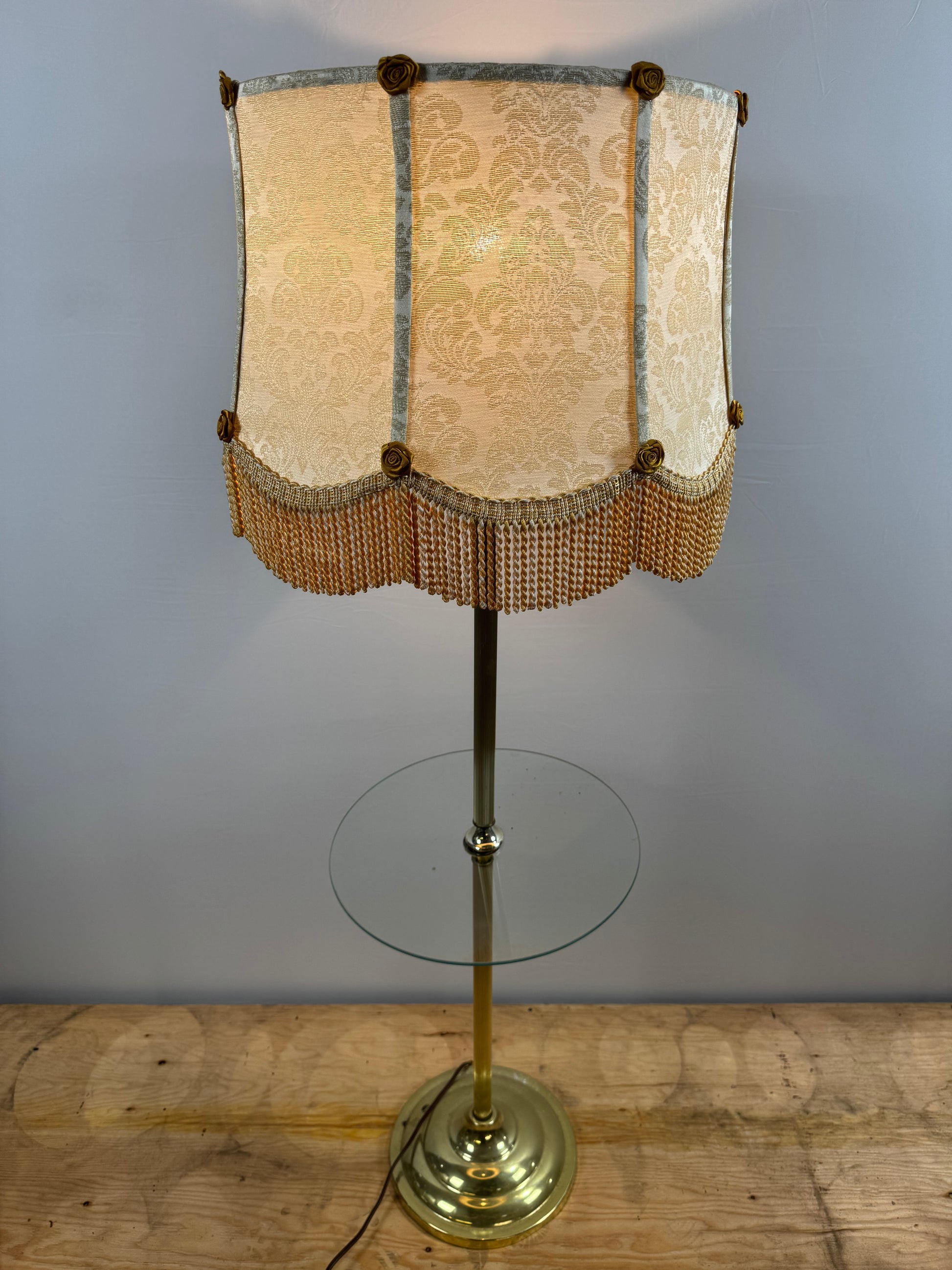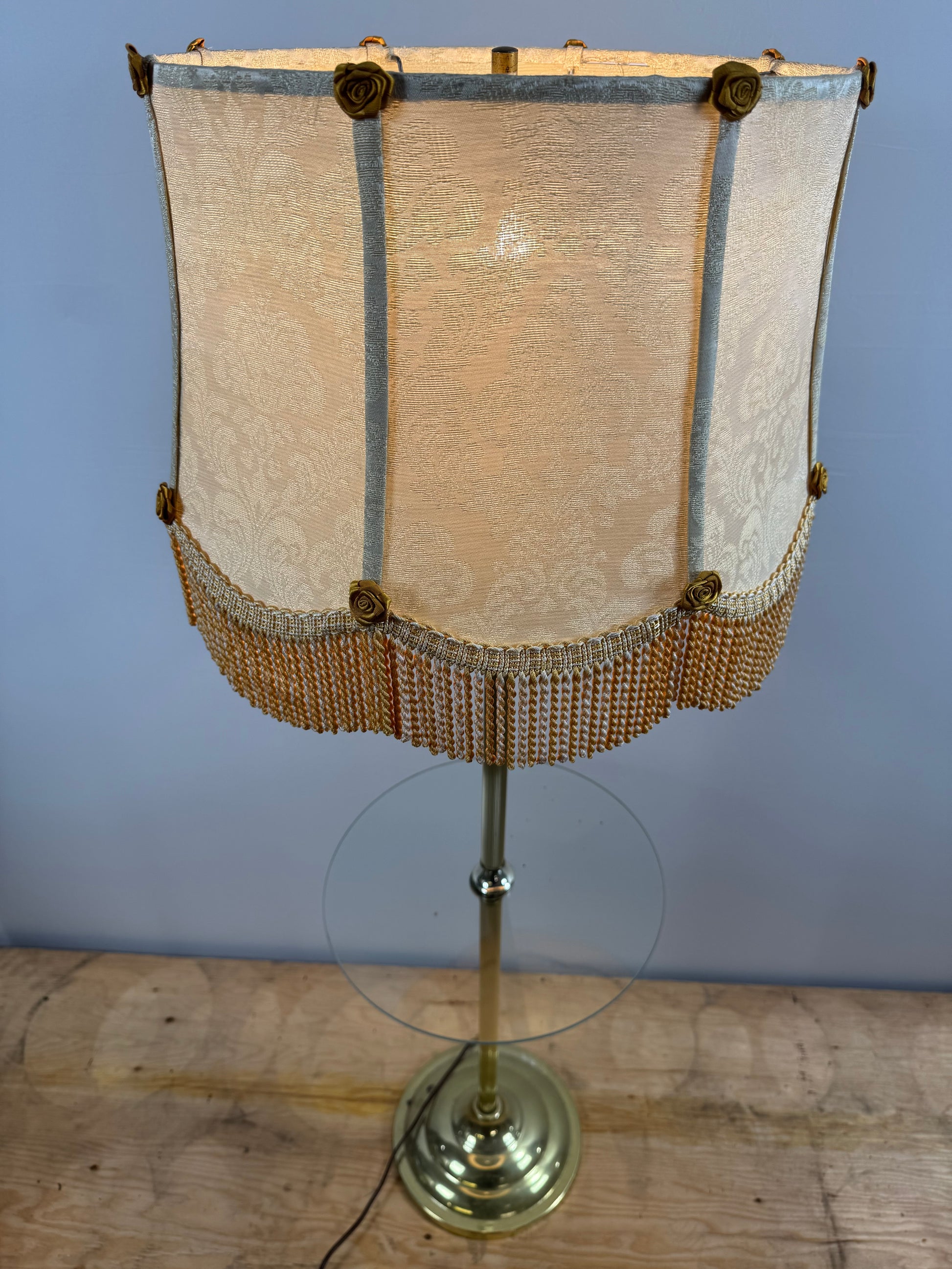 Vintage Floor Lamp Brass with Ribbed Neck Clear Glass Table & Silk Shade.