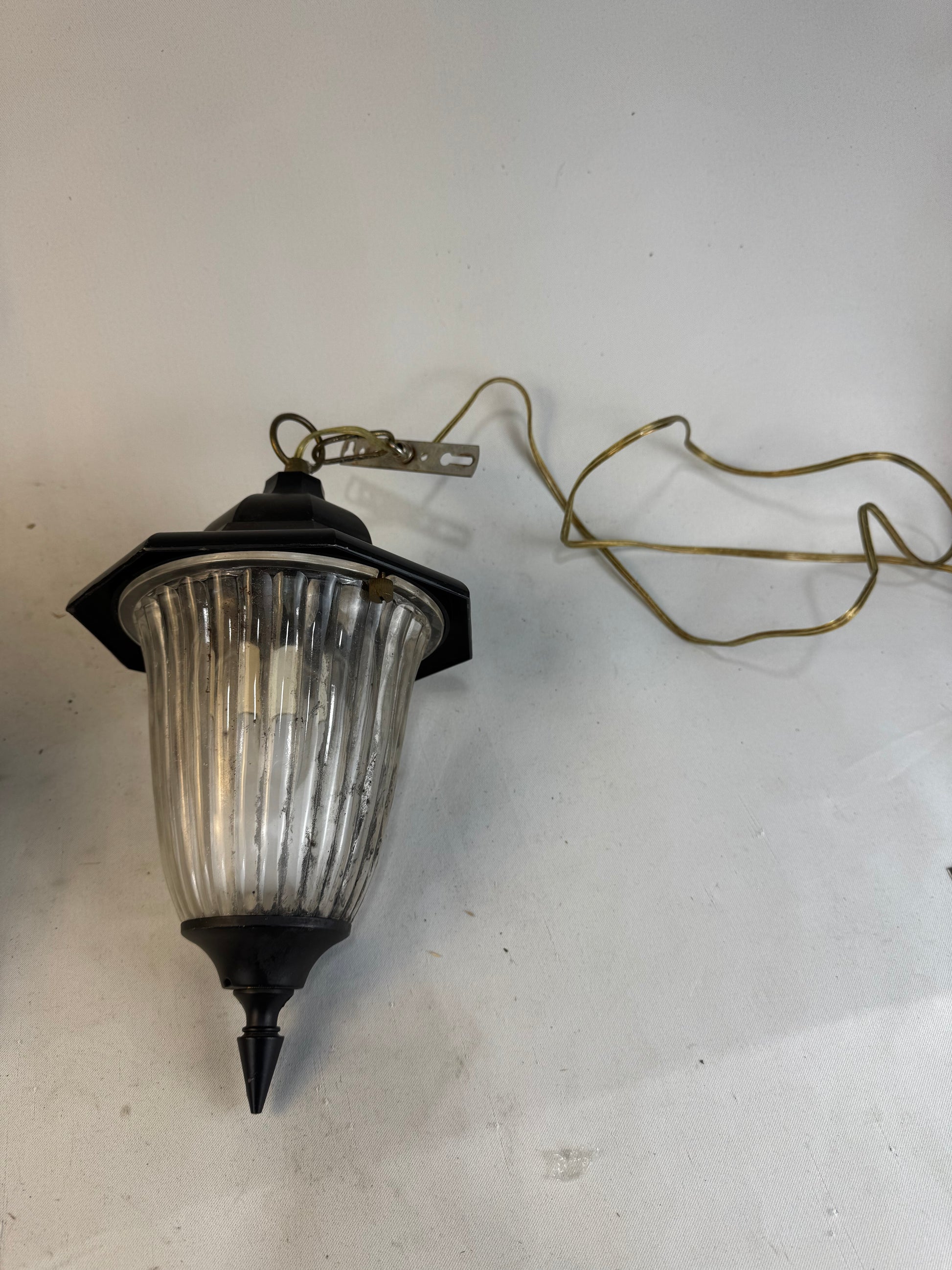 Ext: Porch light hanging black with ribbed glass Wired with Tail & plug. Price is to purchase X2.