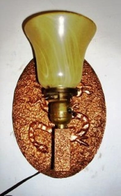 Wall mount Sconce Copper with embedded snake on wood and faux alabaster glass shade