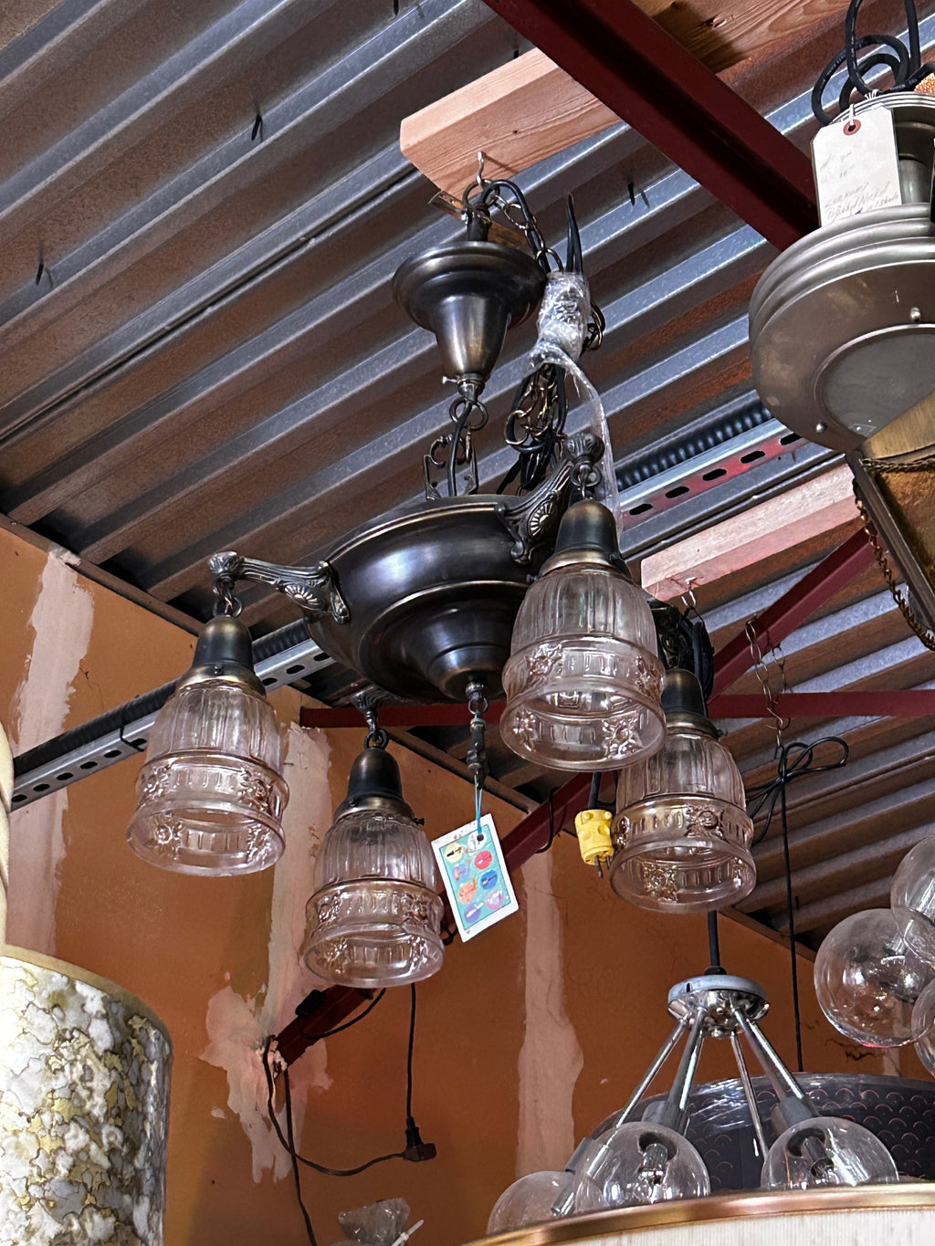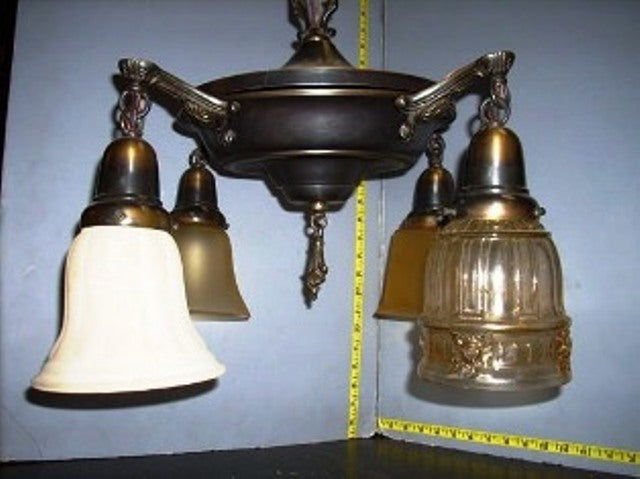 Large Colonial Revival Single-Chain Chandelier 4arms with Neoclassic Amber tinted glass shade