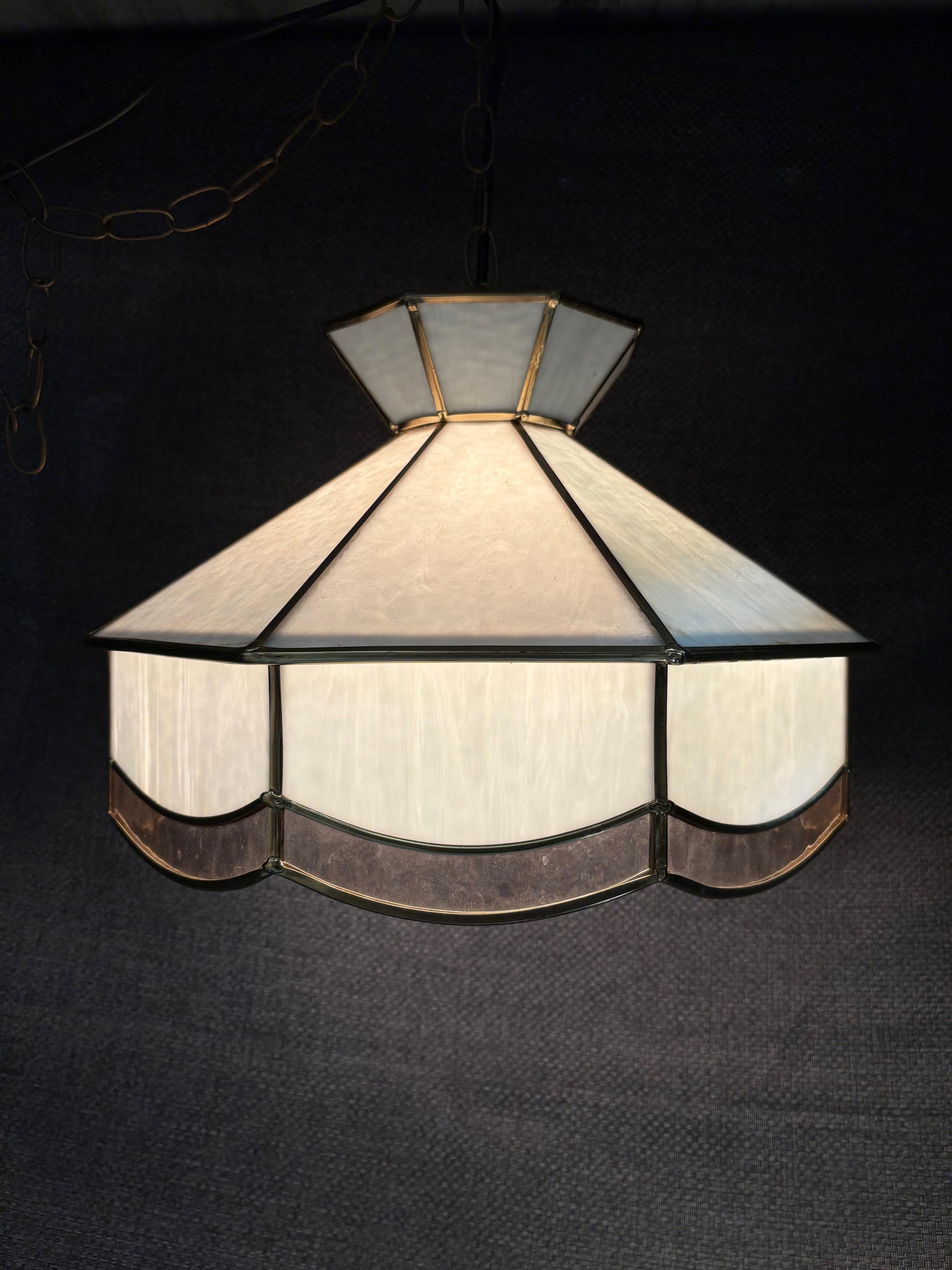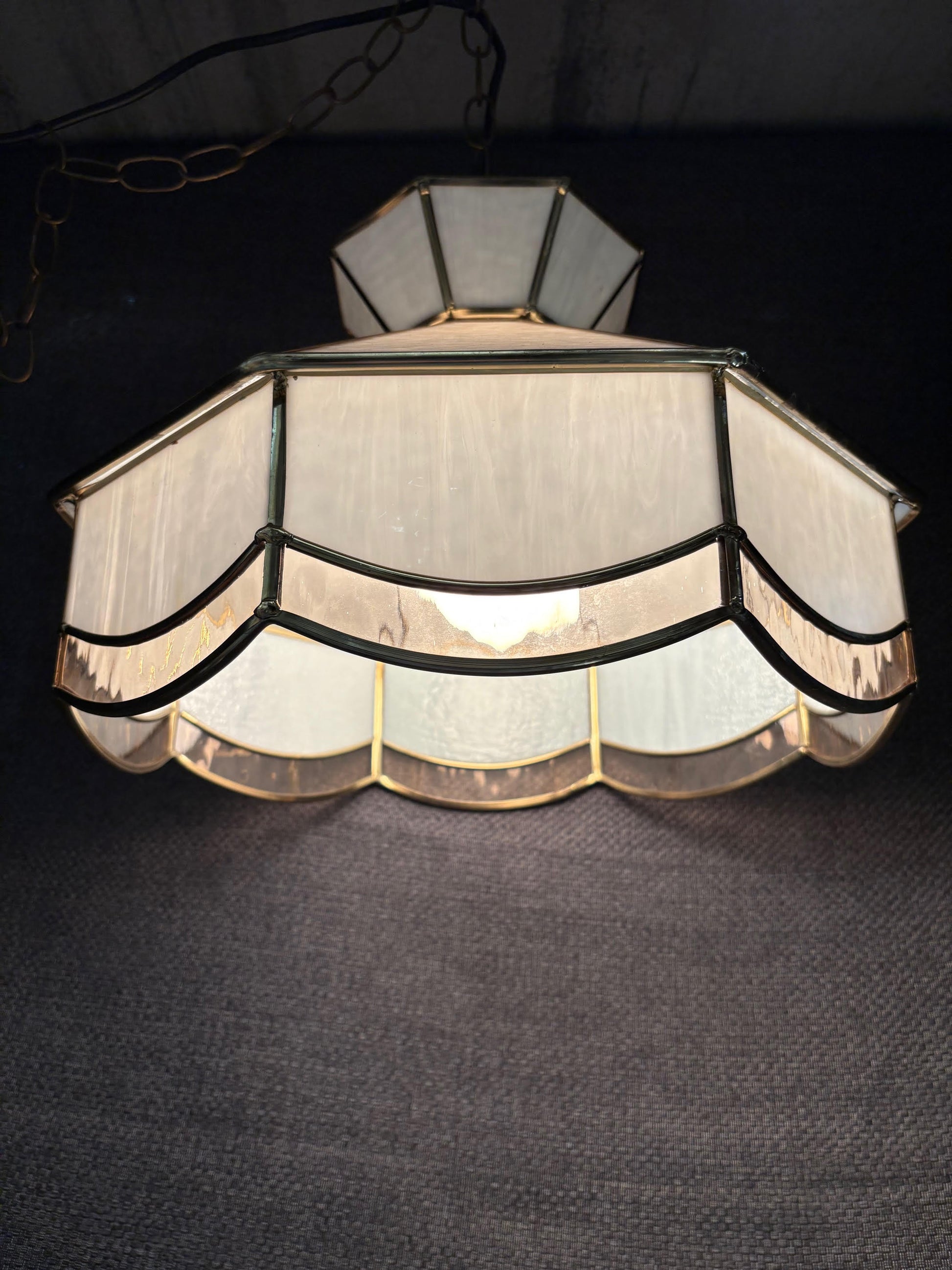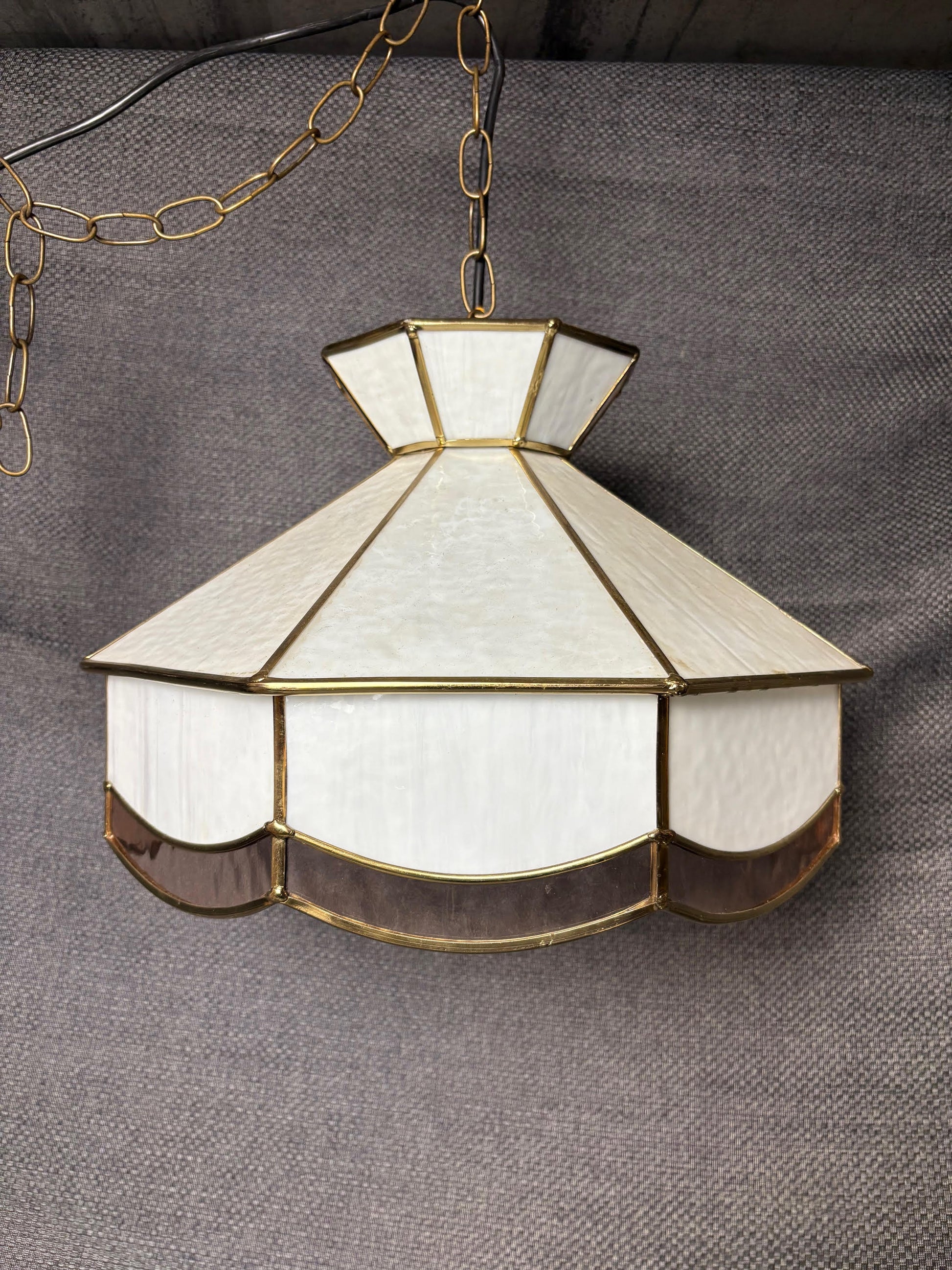 Vintage 70's Retro Stained leaded glass hanging slag lamp White glass