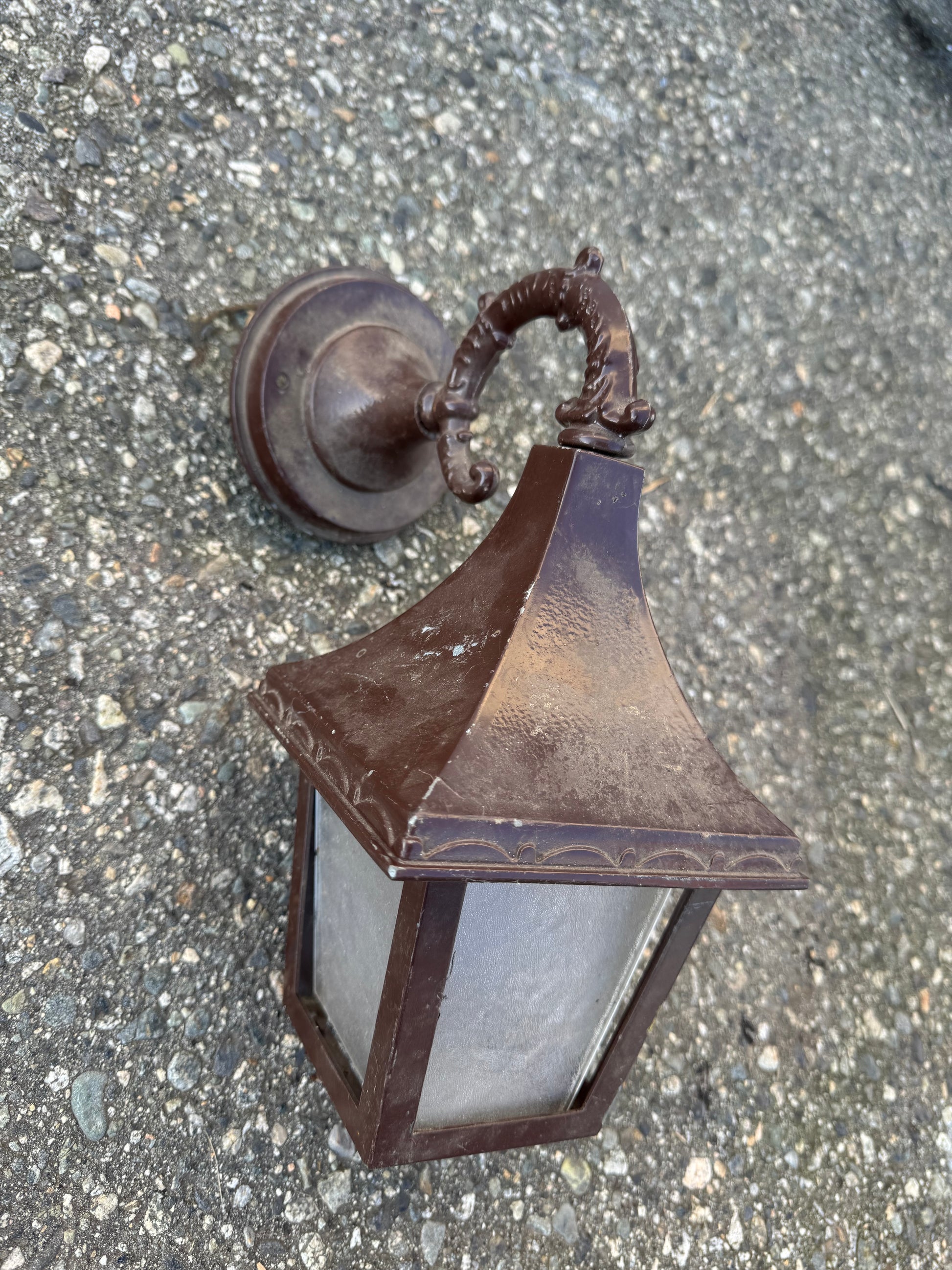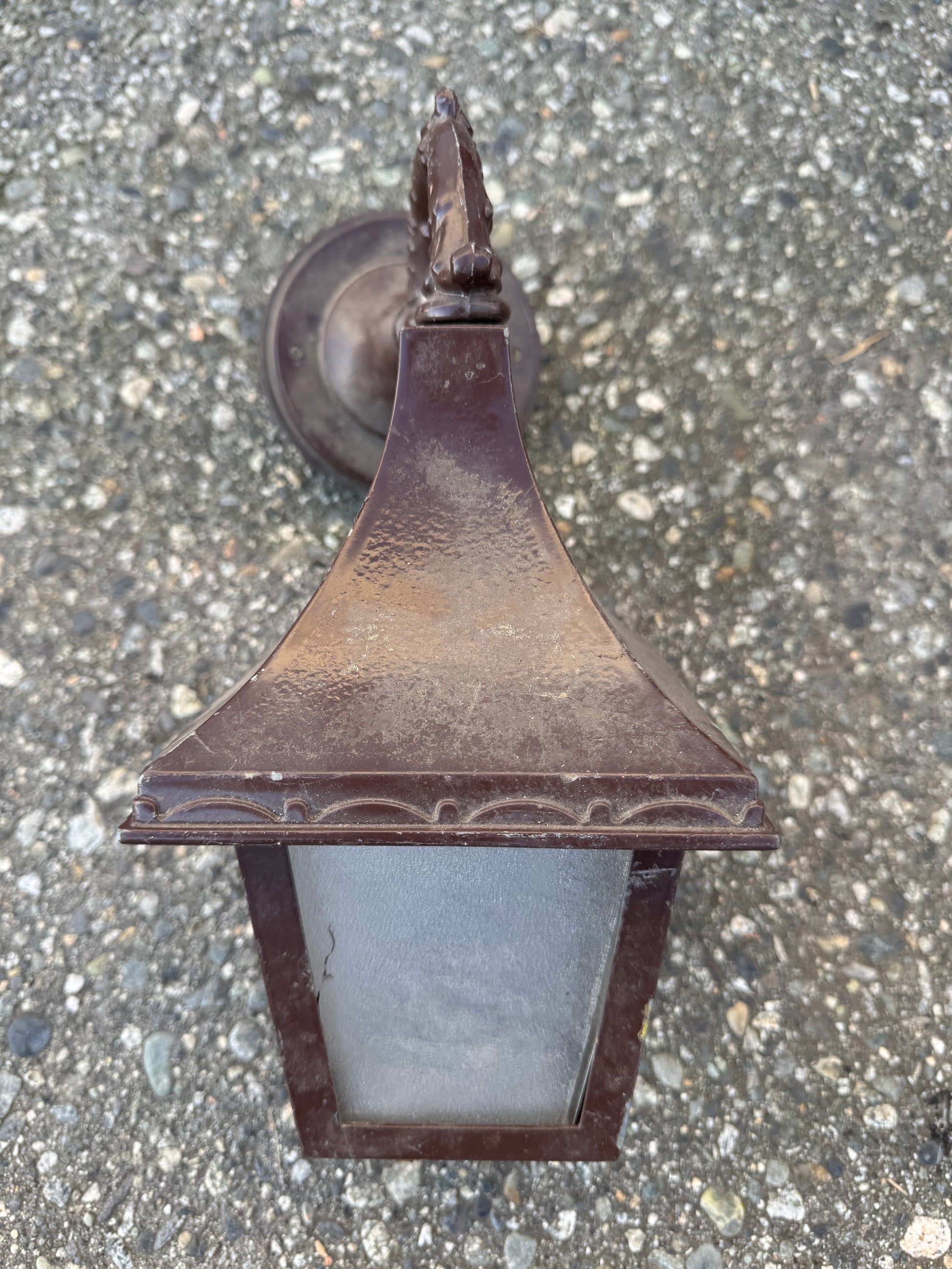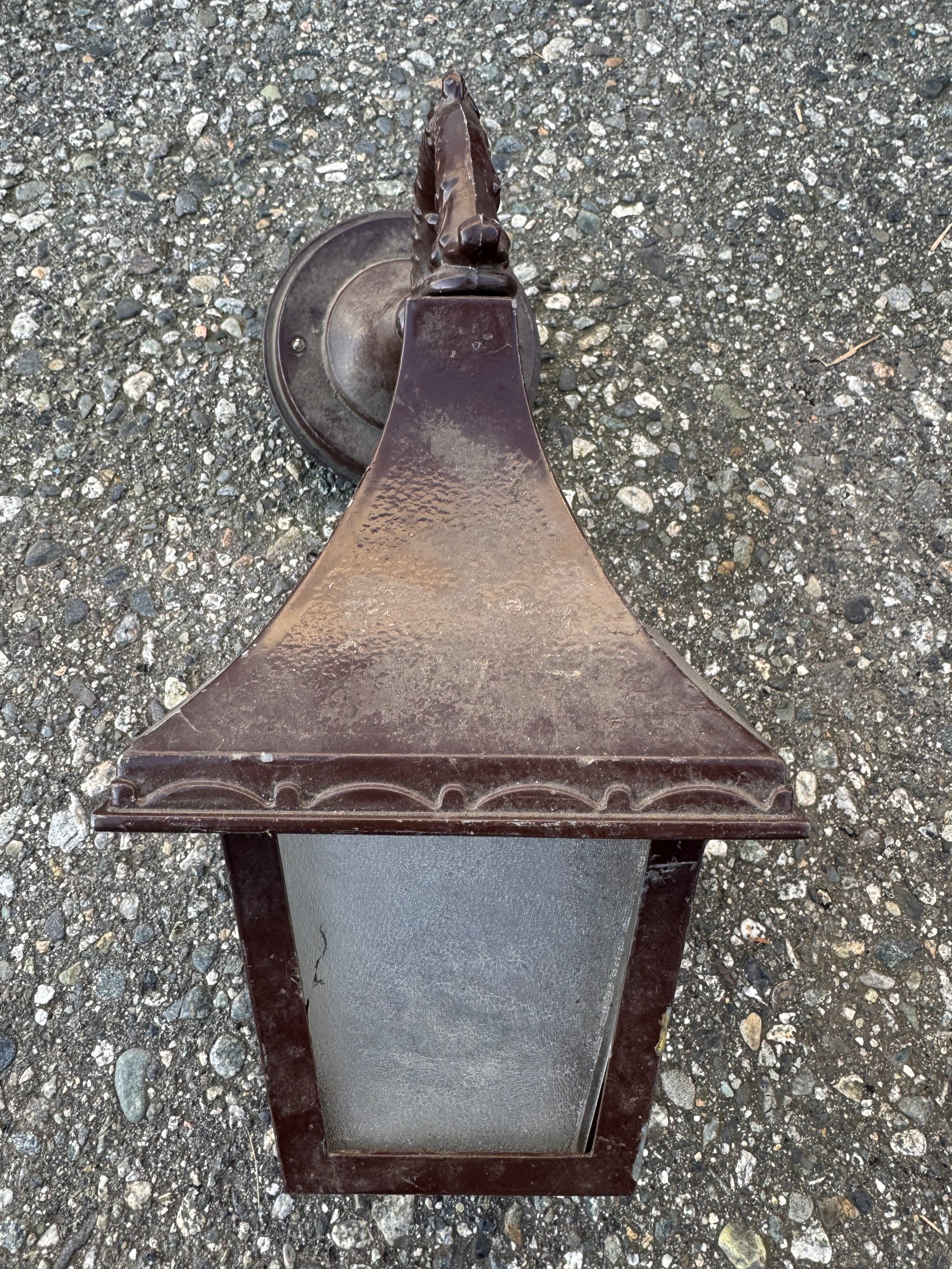 Bronze Wall Sconce with Frosted Glass Panels. One Panel is missing.