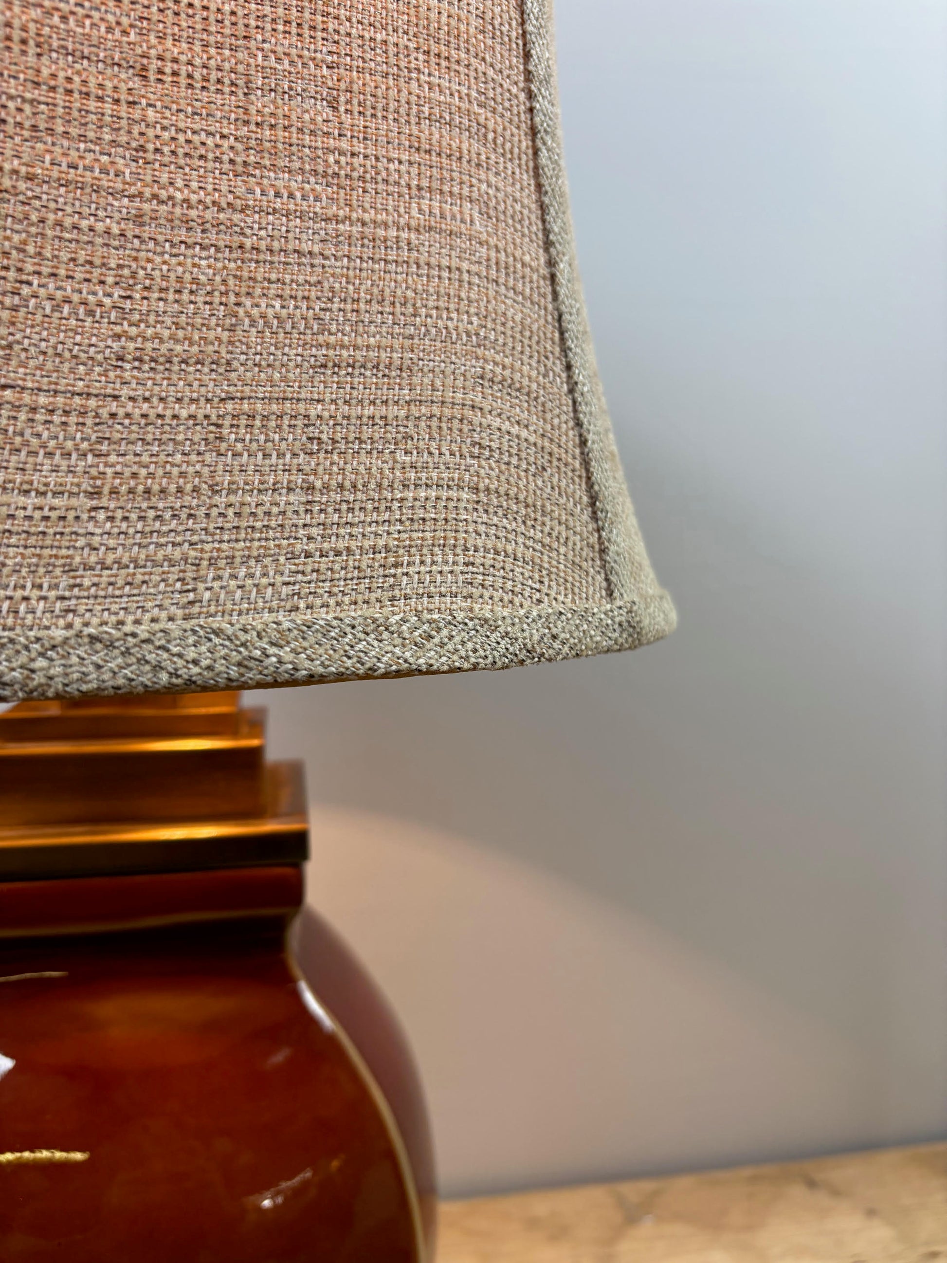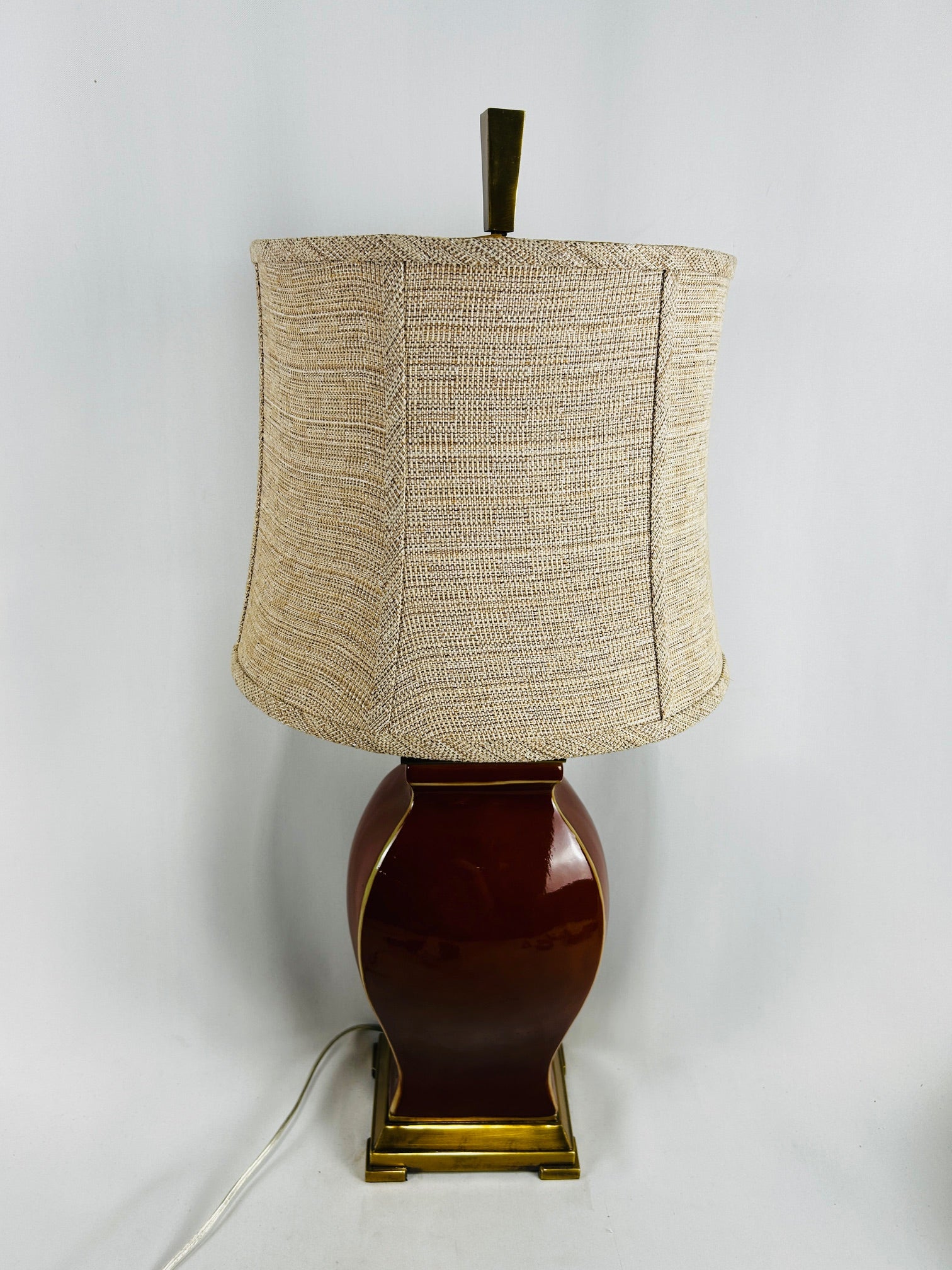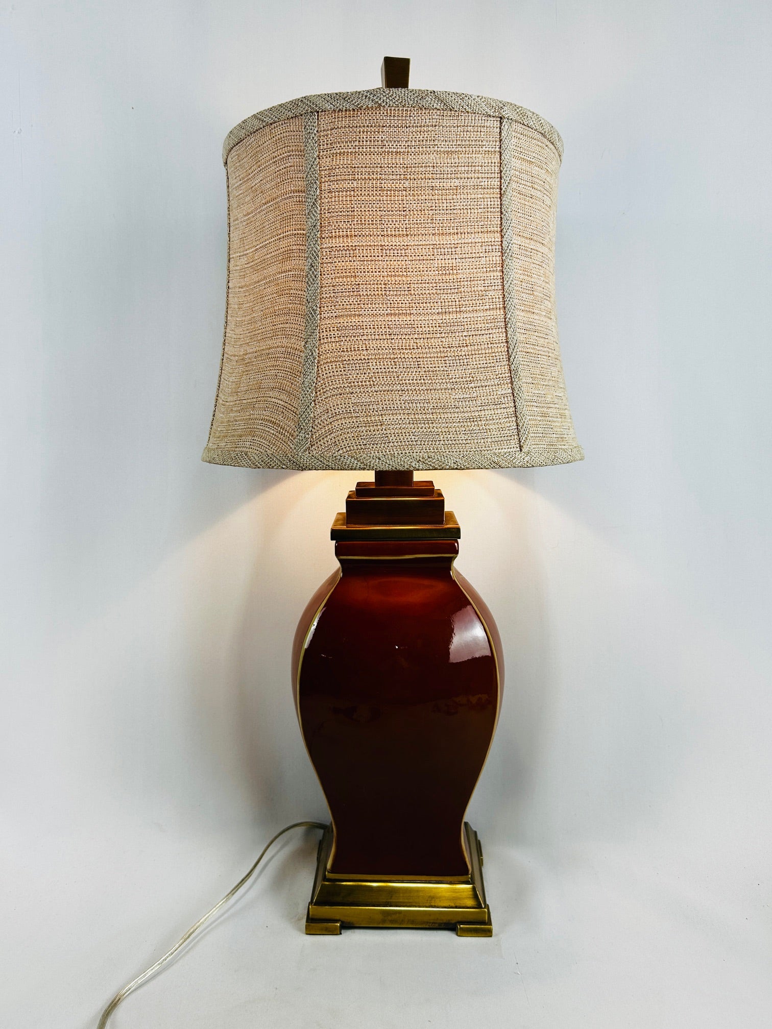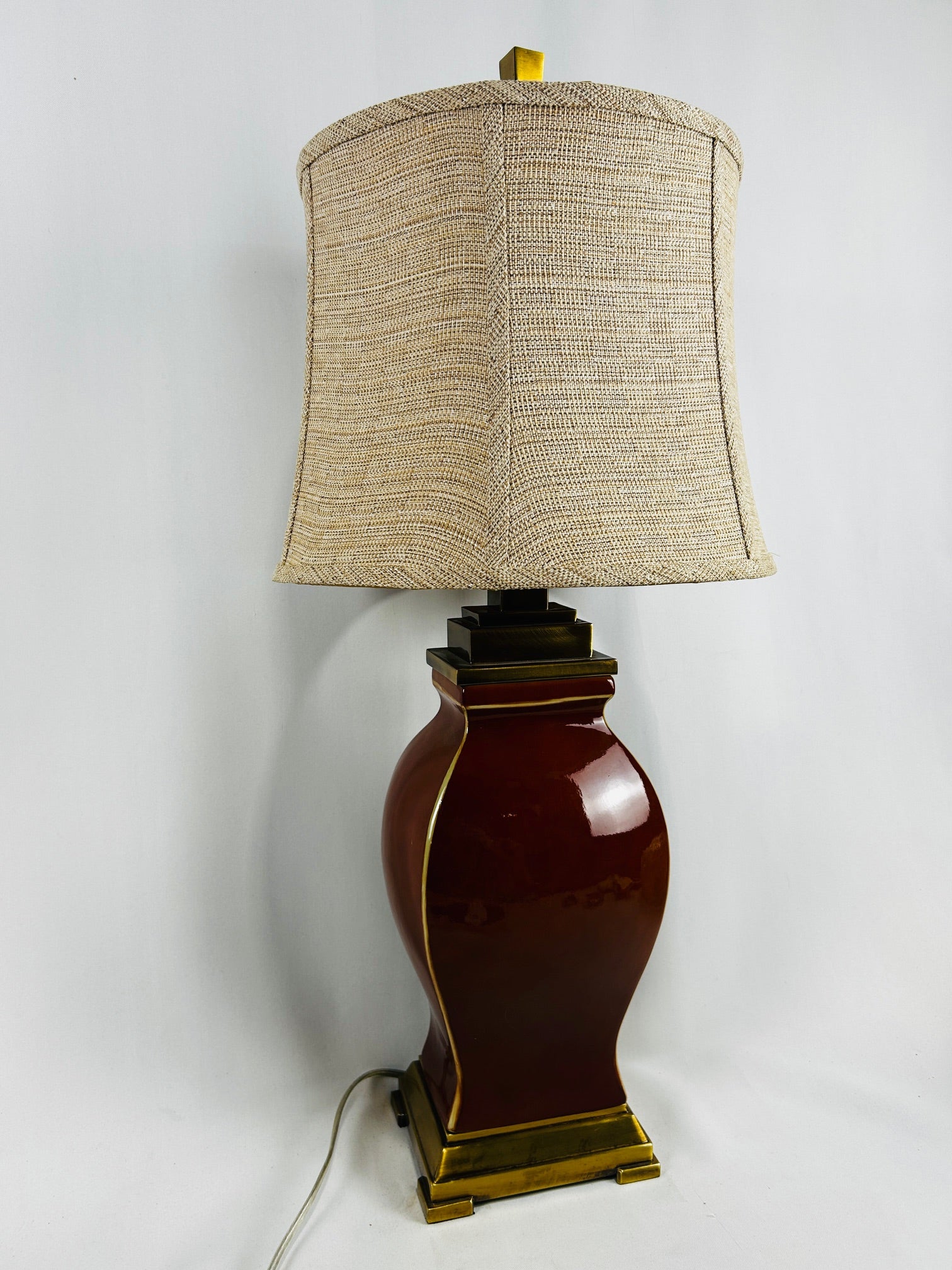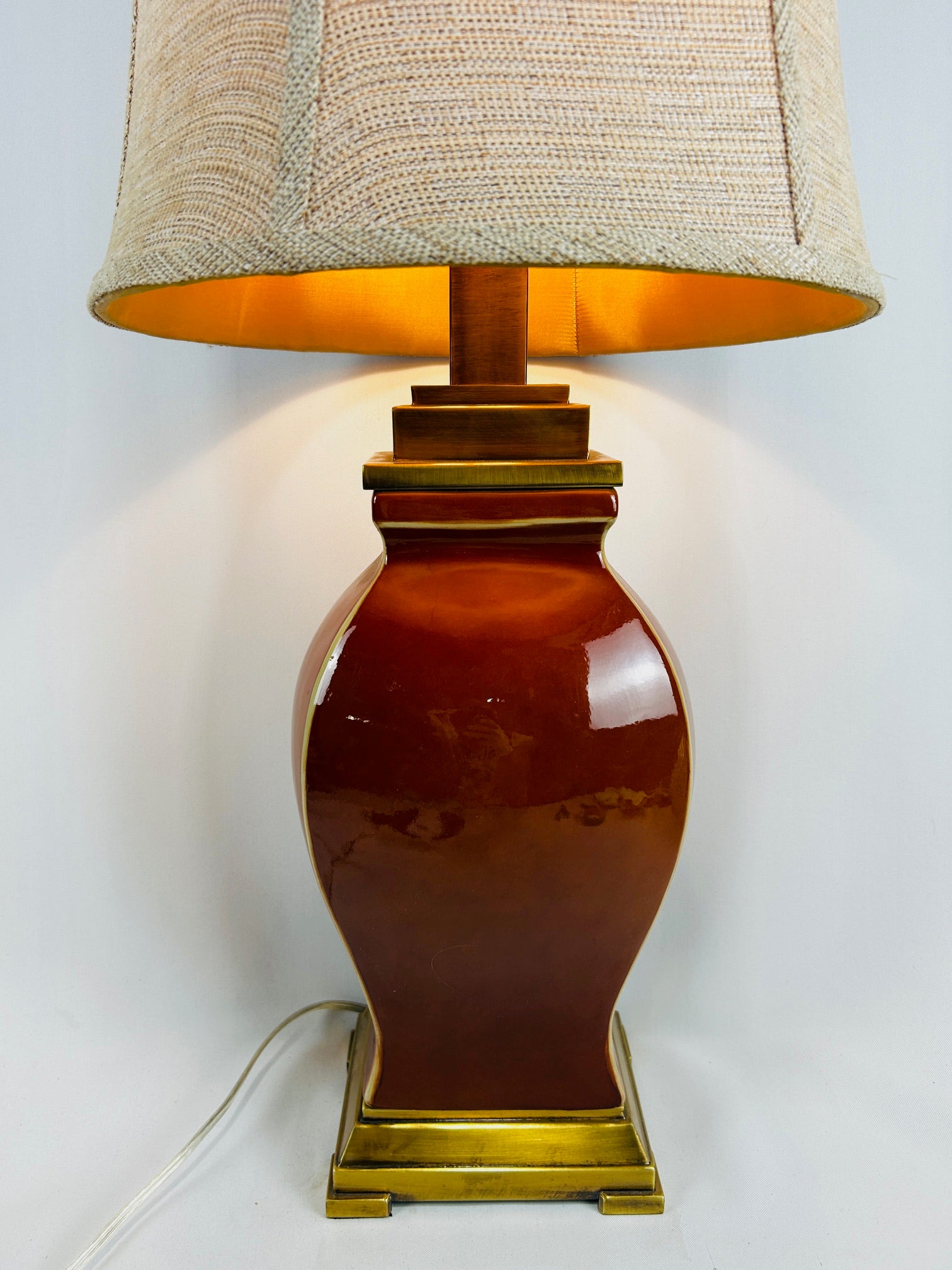 table lamp red ceramic shiny glaze with gold sqaure base and top with shade