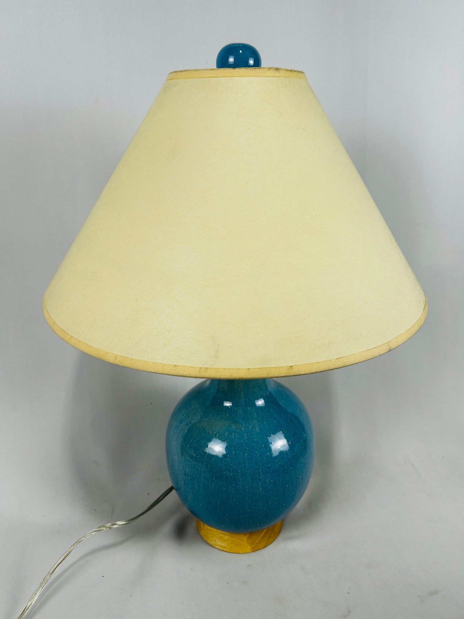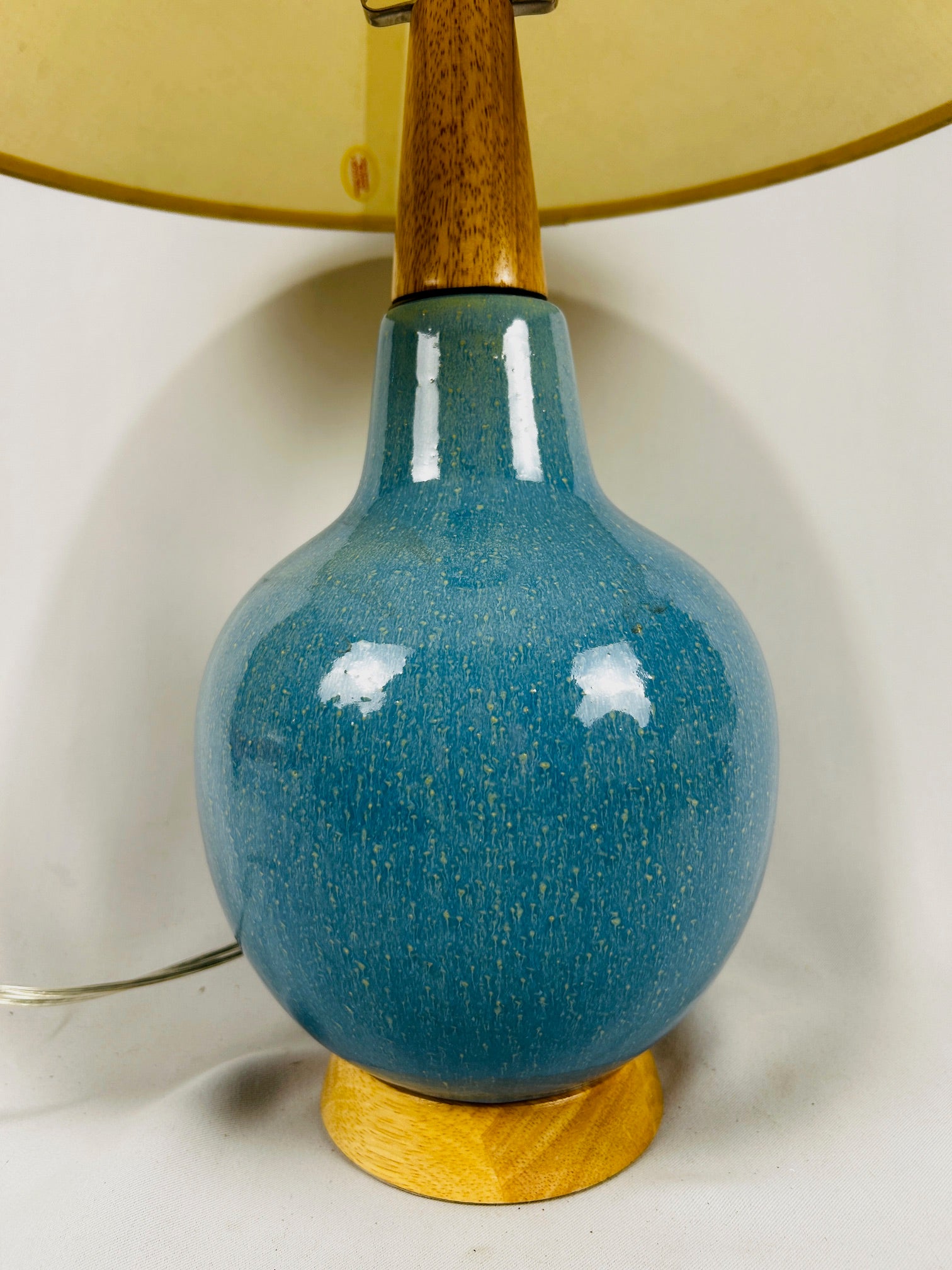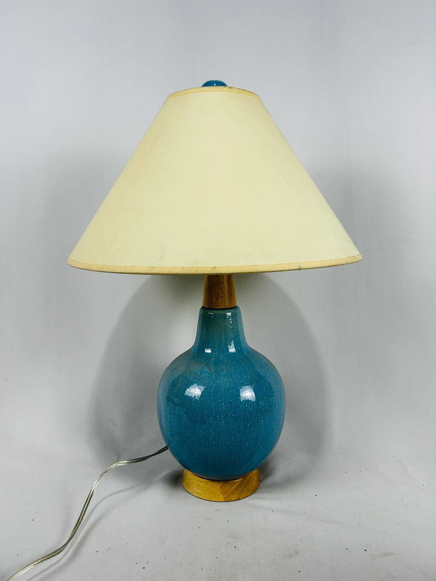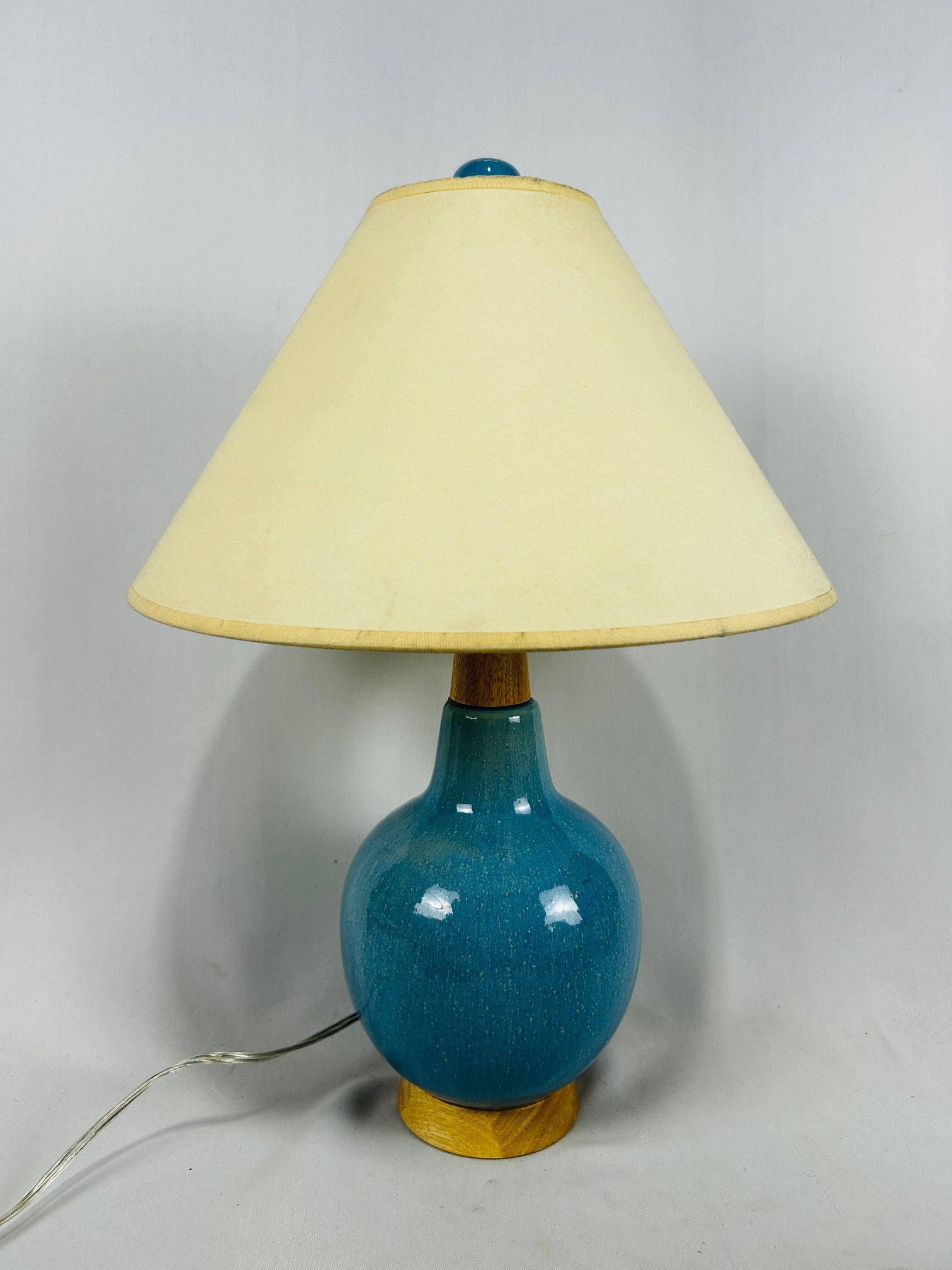 Table Lamp Blue ceramic with natural wood break and finial to match