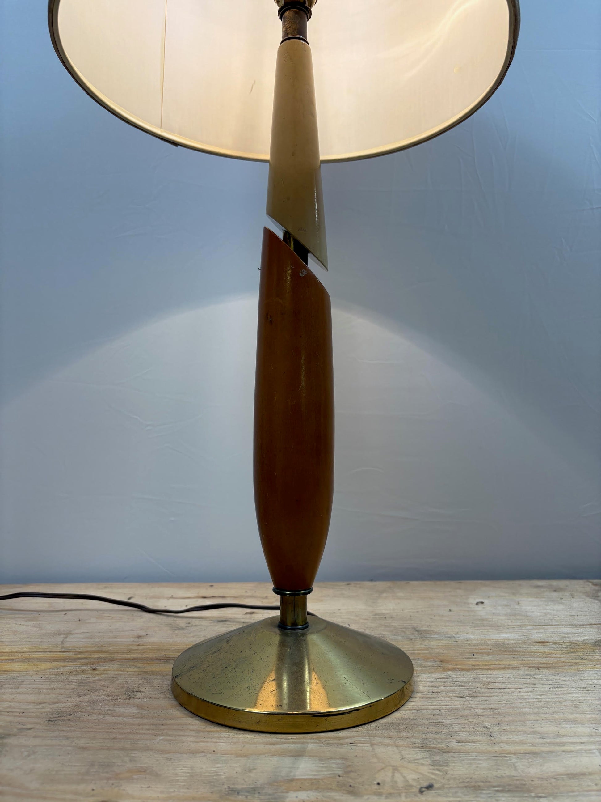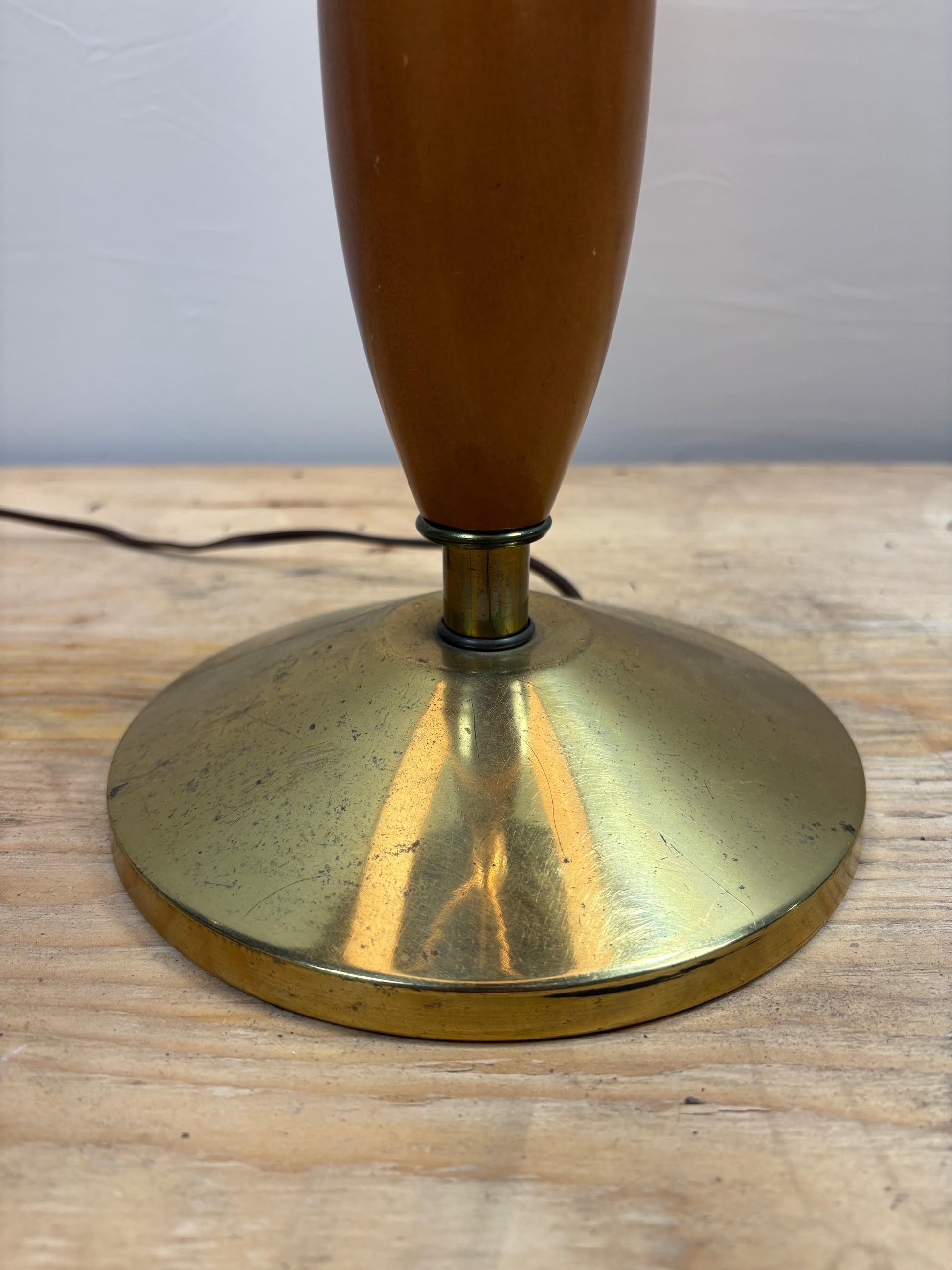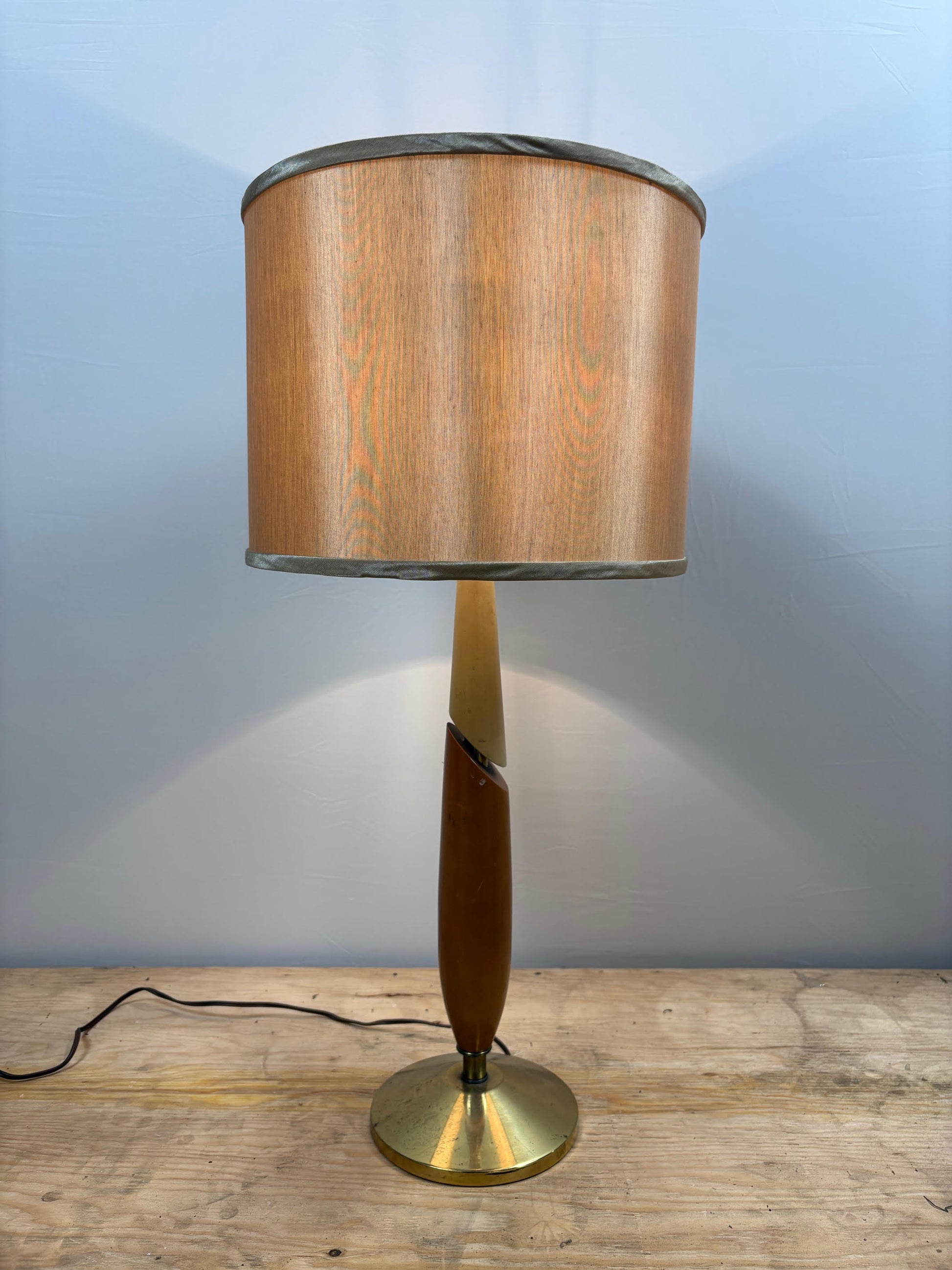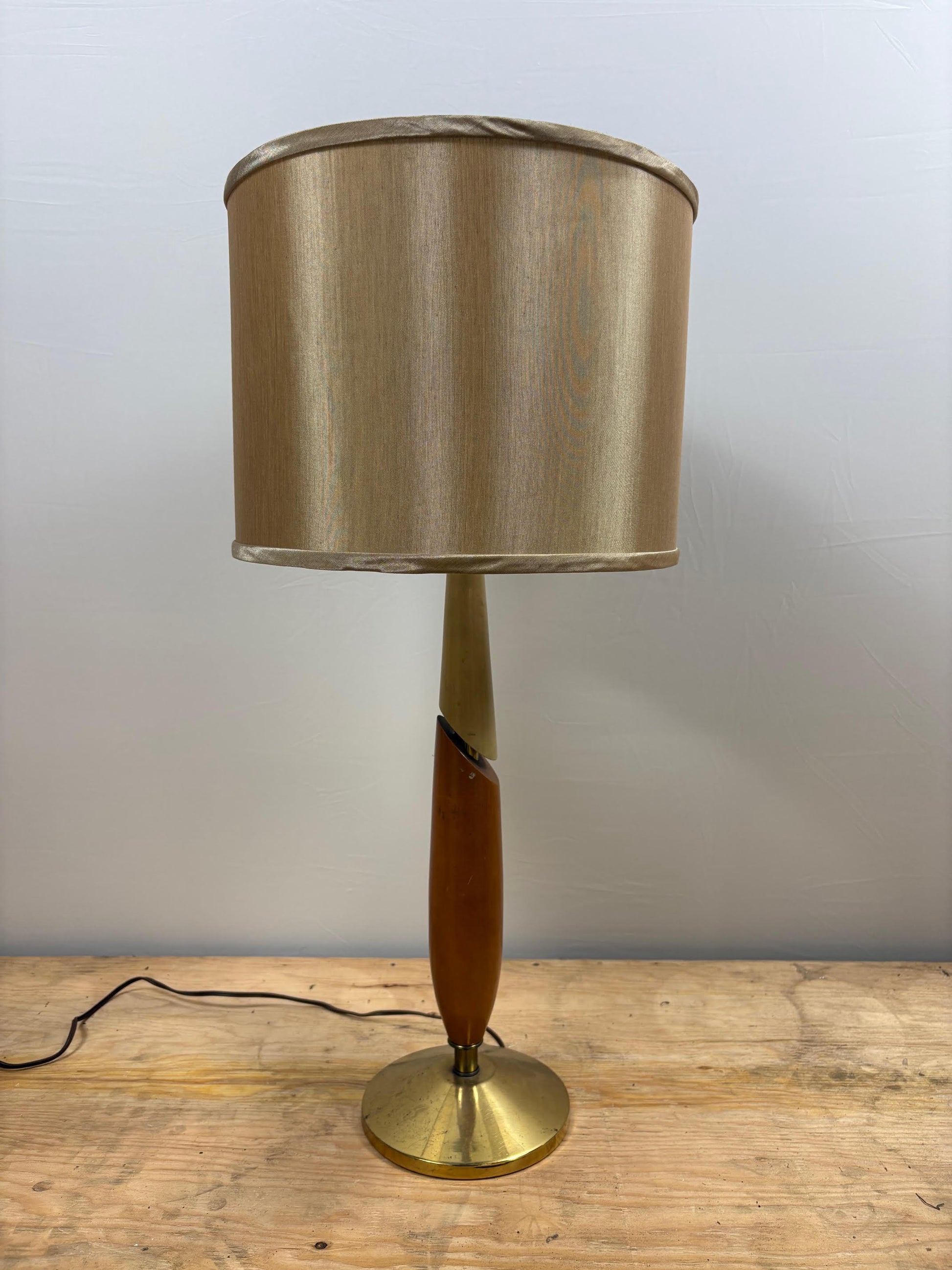 Light and Warm Coloured Wood Traditional Lamp with Brass detailing and a brushed gold cylinder shade