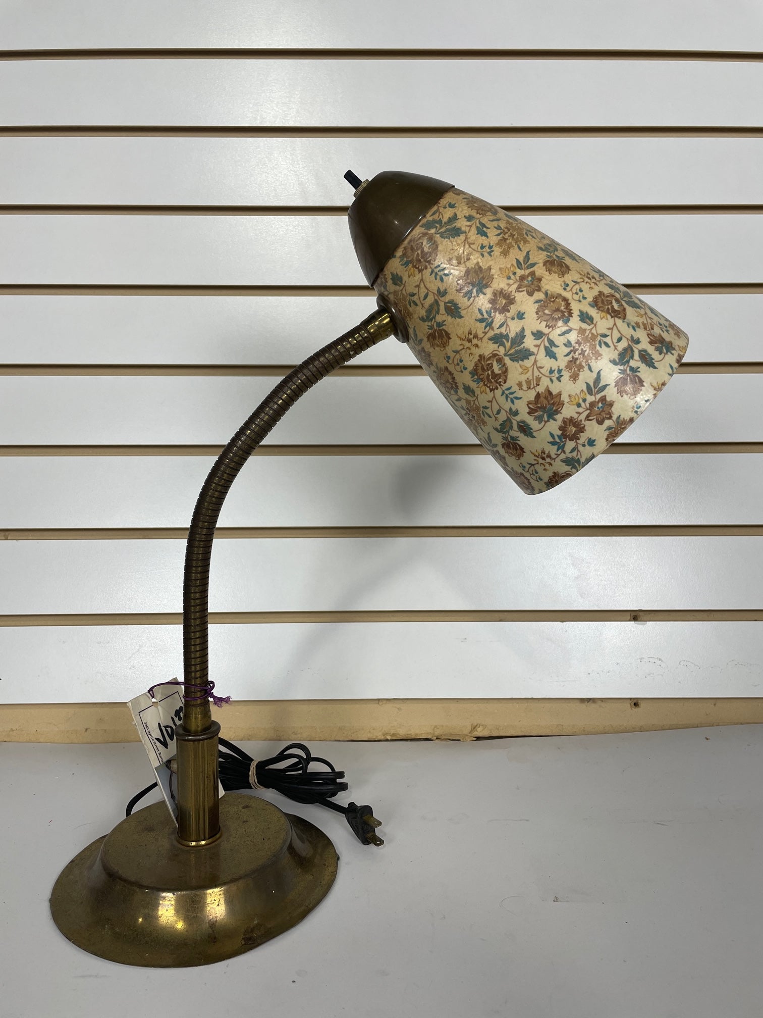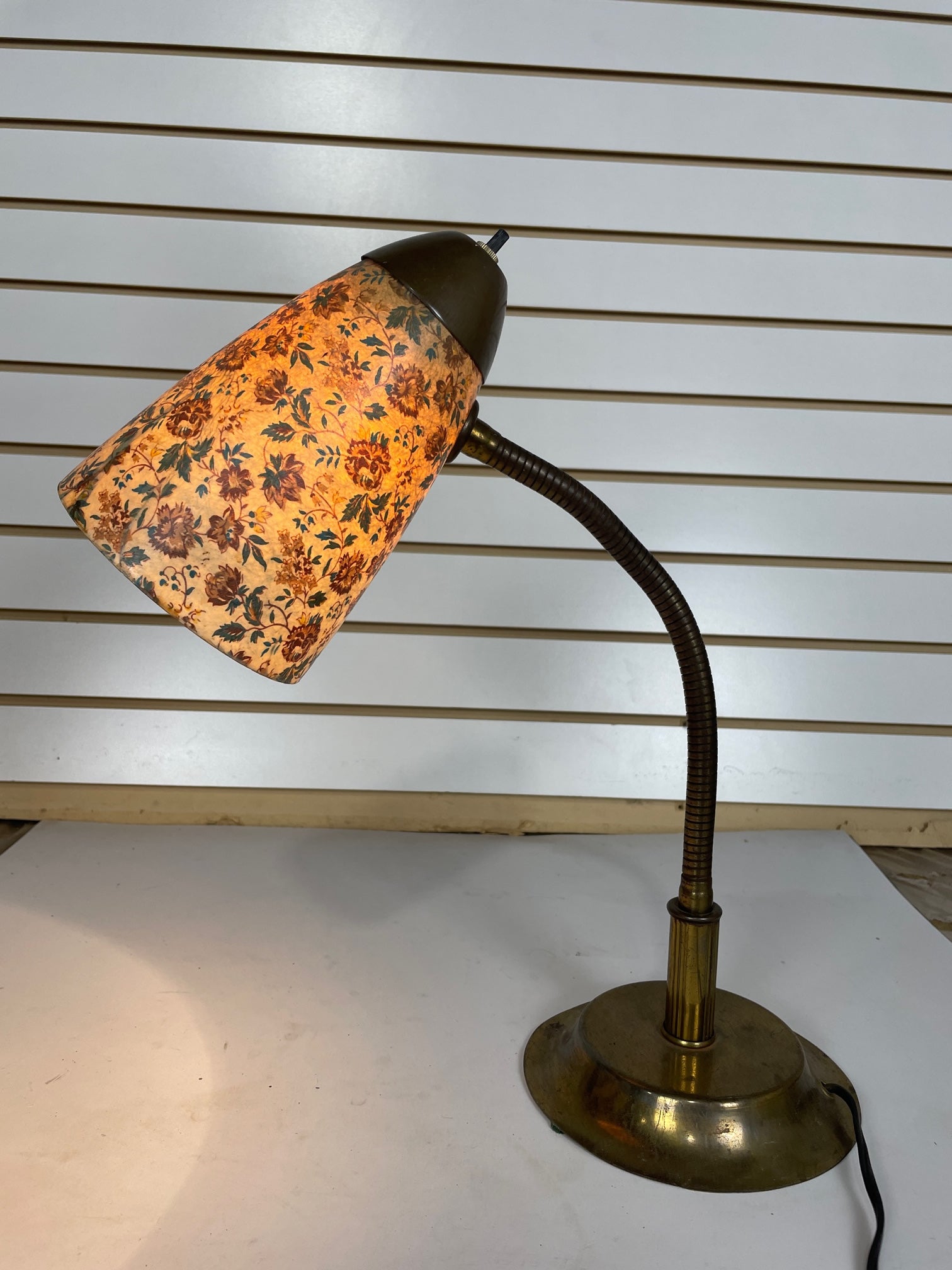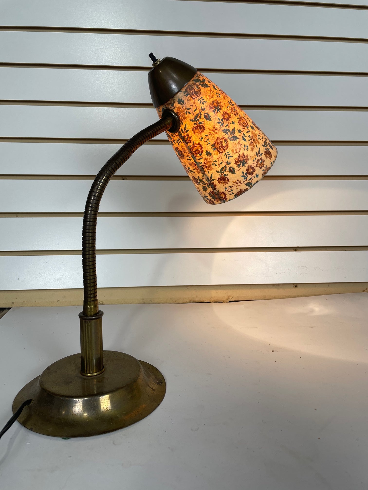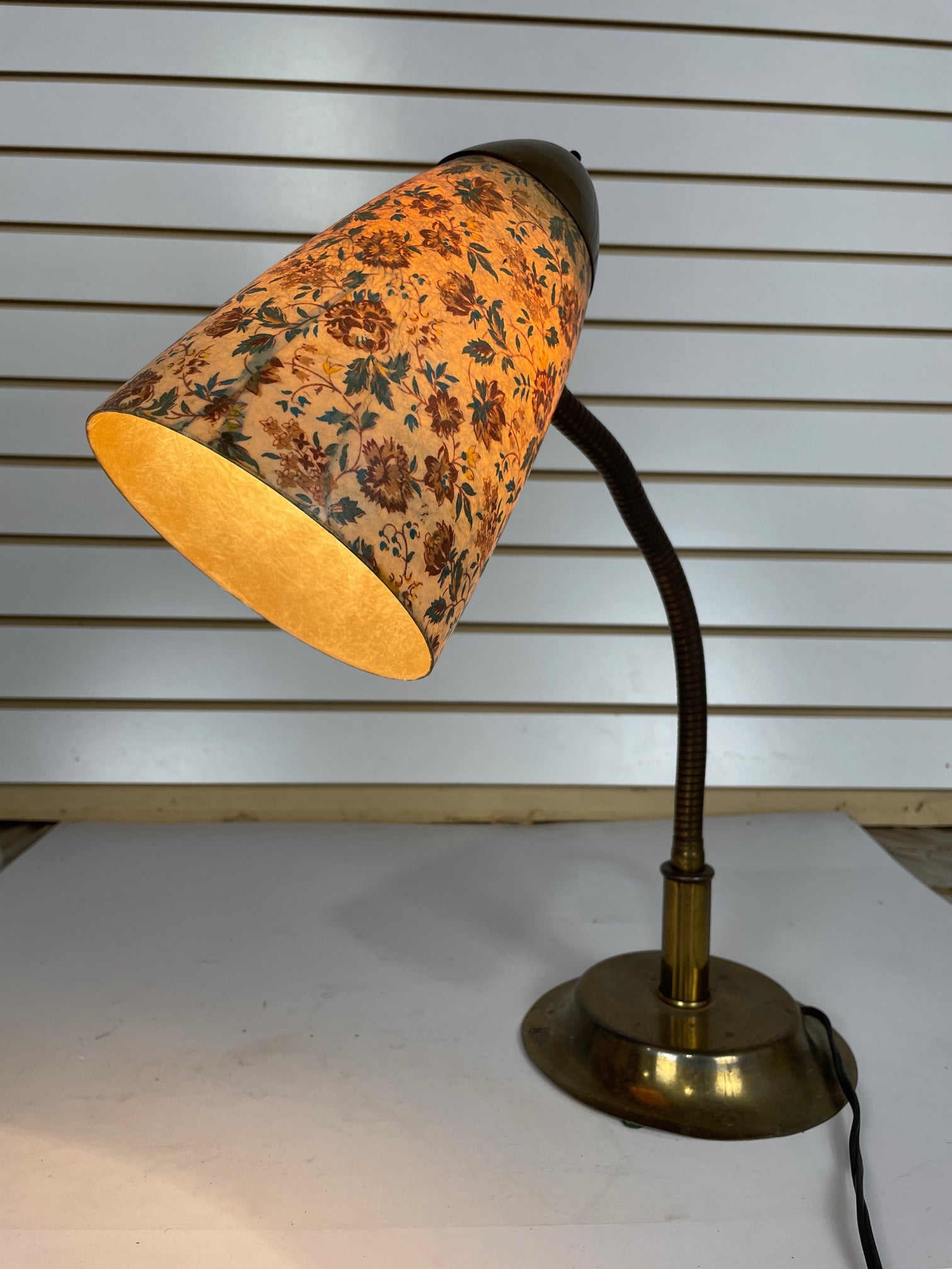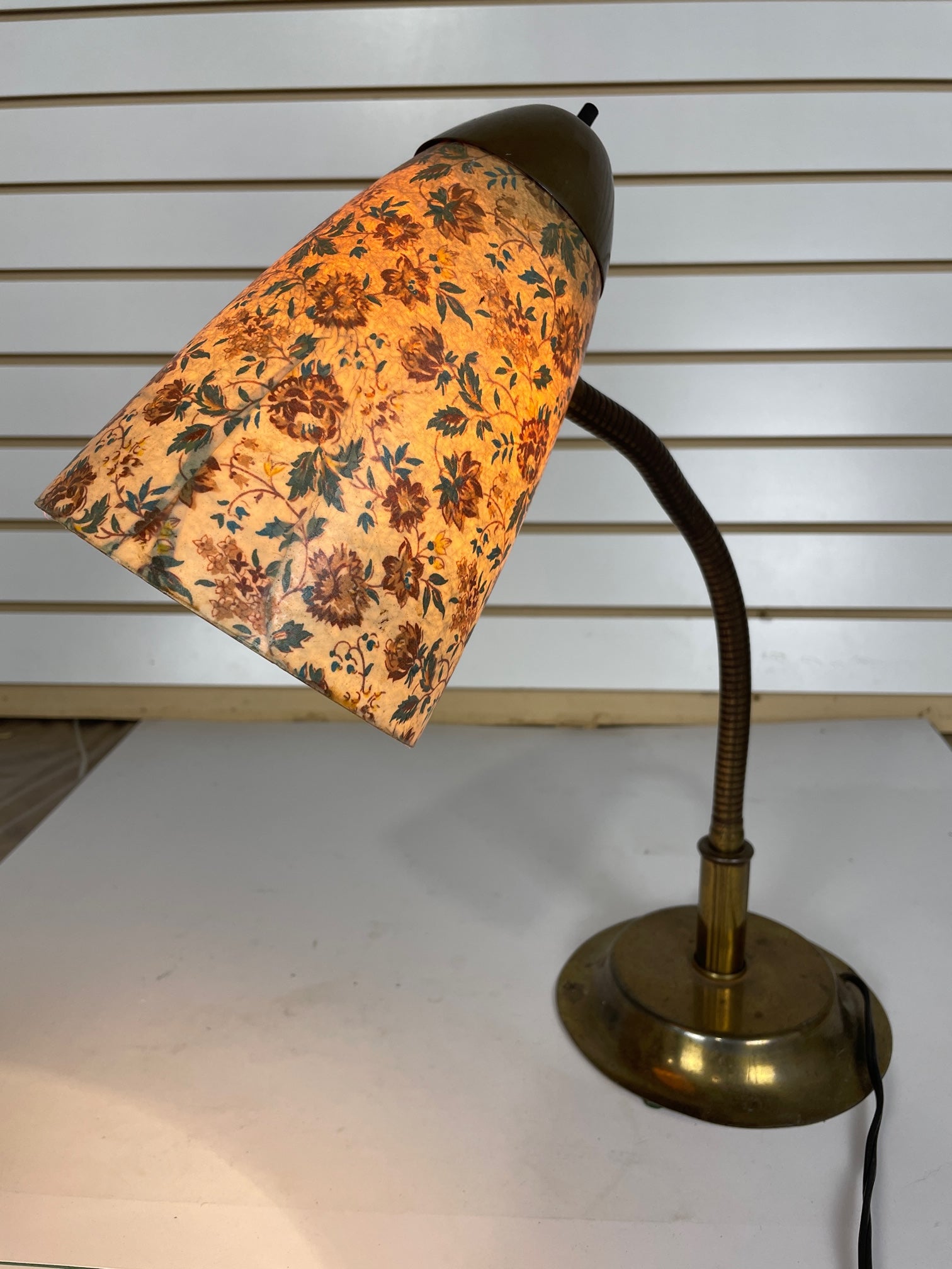 Desk lamp Gooseneck Brass with fiberglass shade with flower print