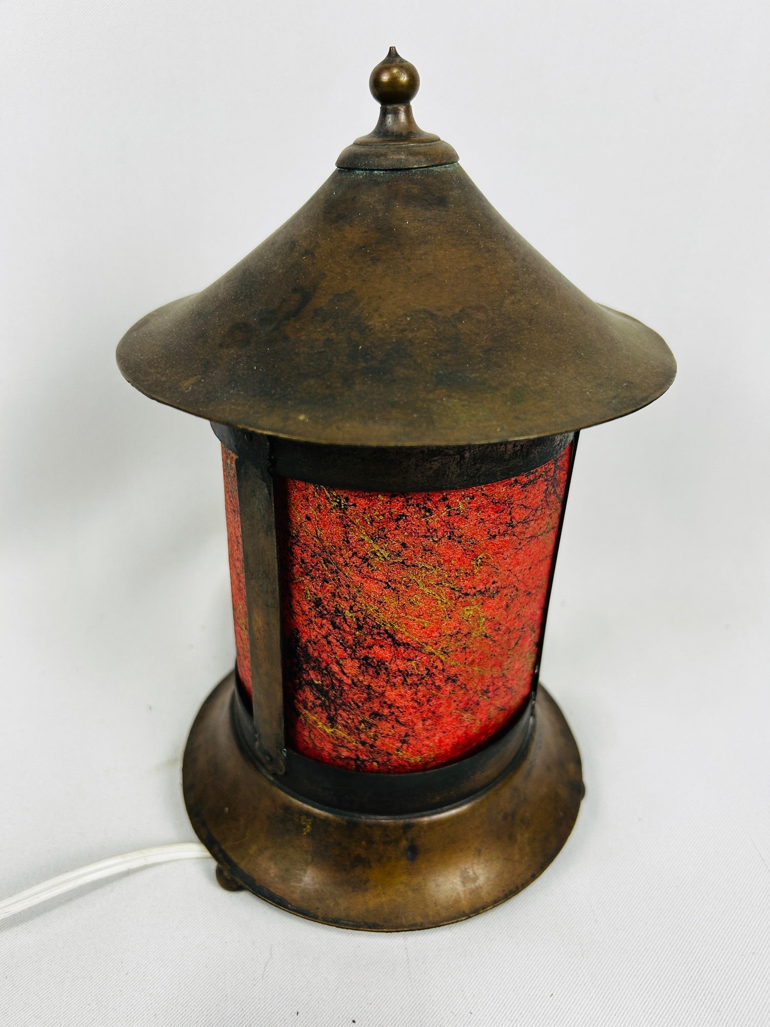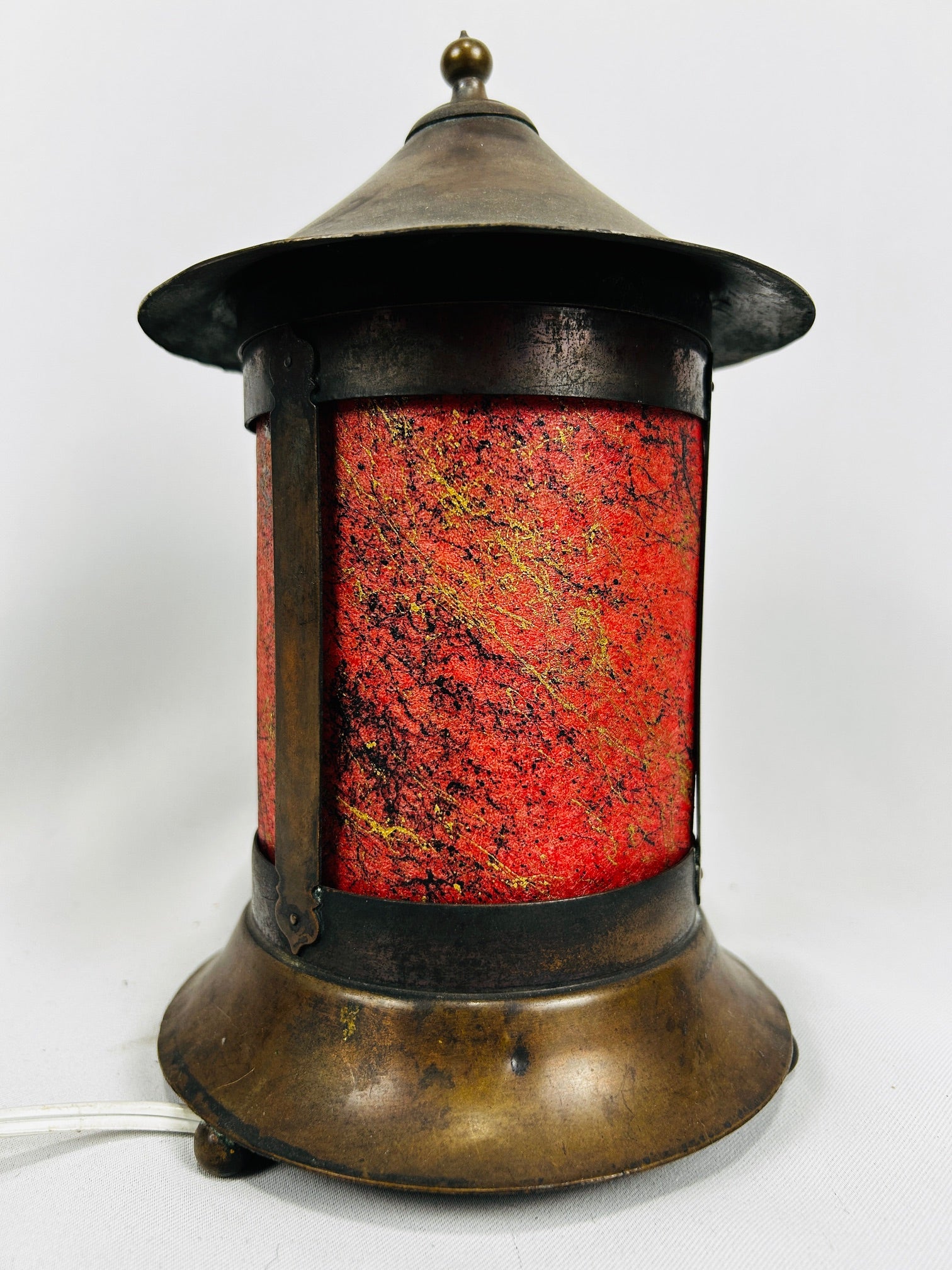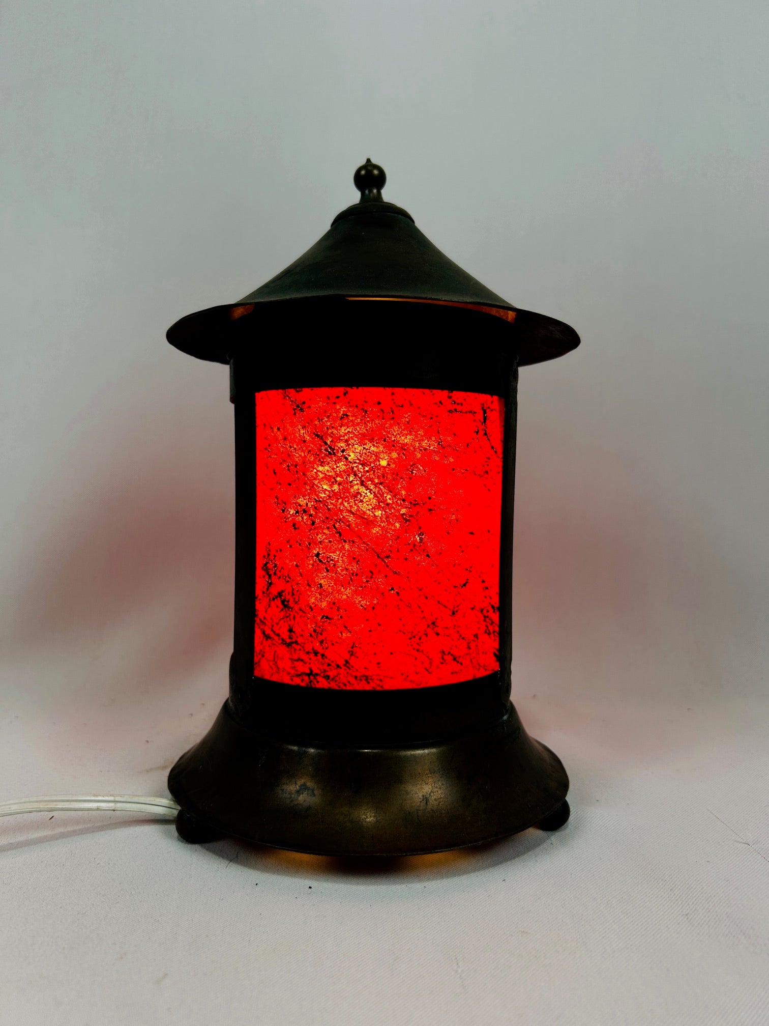 Table lamp Metal cylinder with pointed metal top and red fiberglass diffuser
