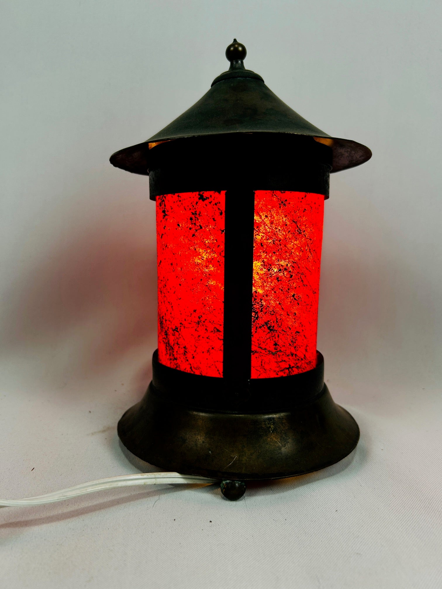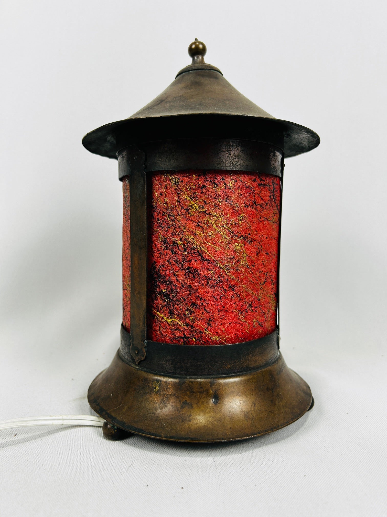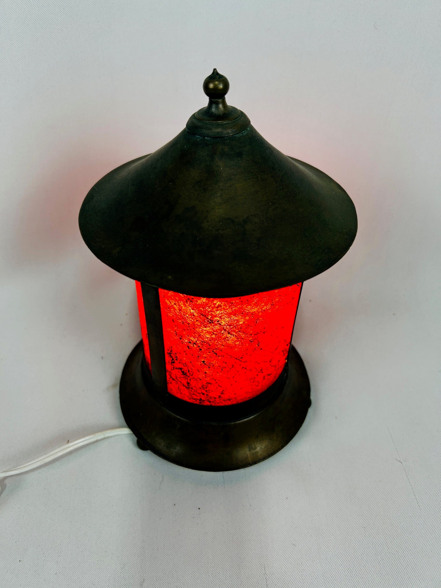 Table lamp Metal cylinder with pointed metal top and red fiberglass diffuser