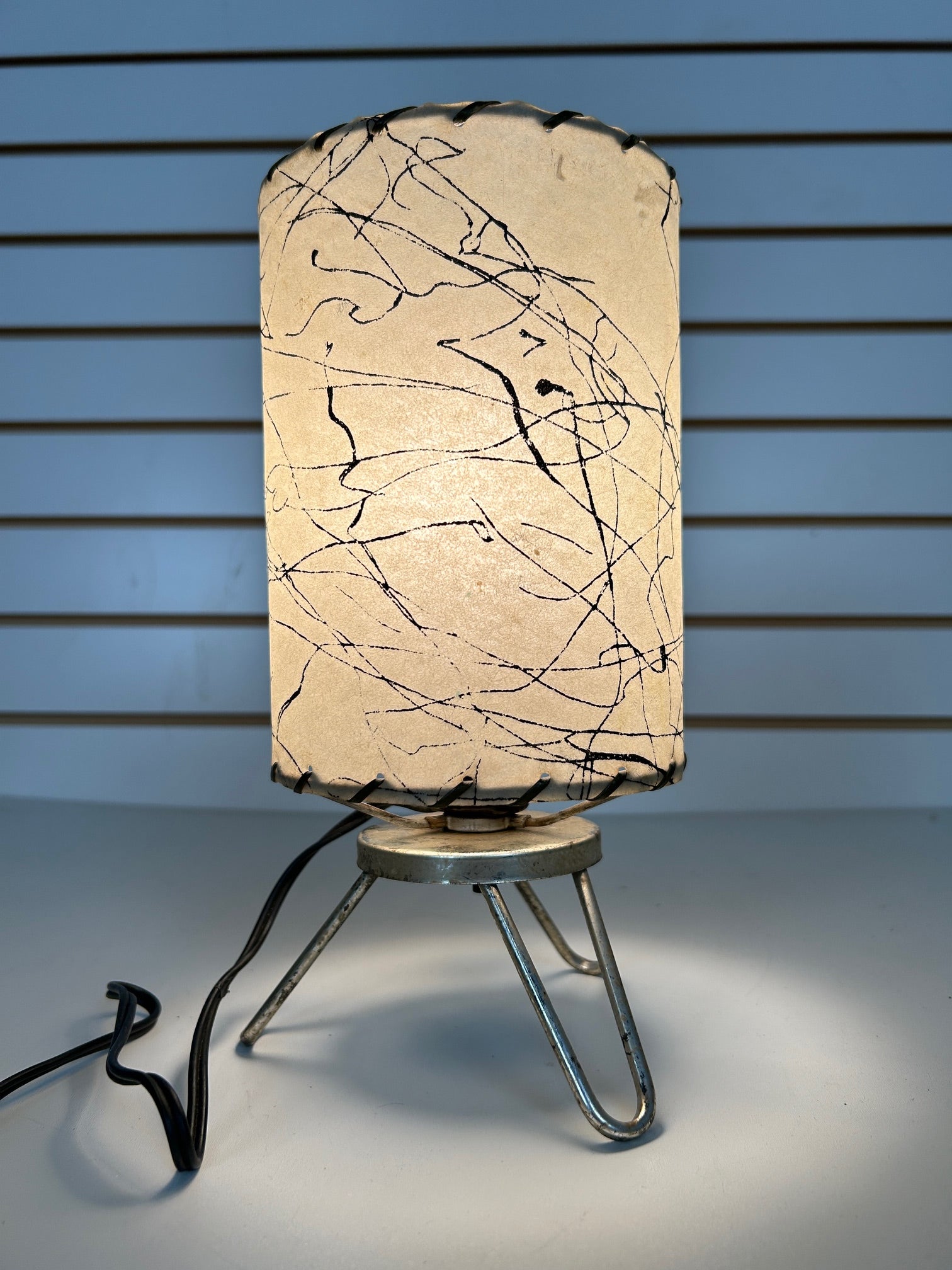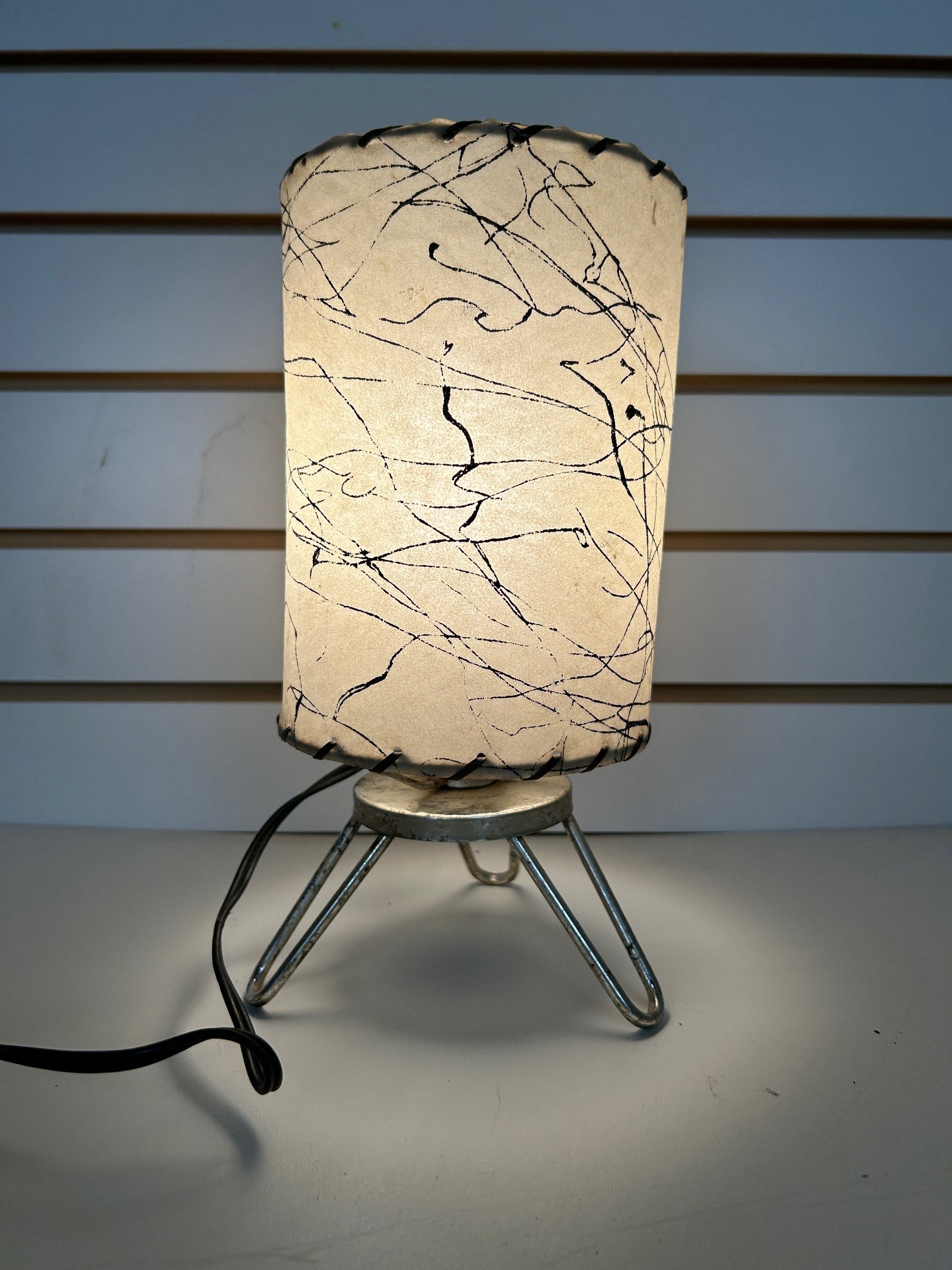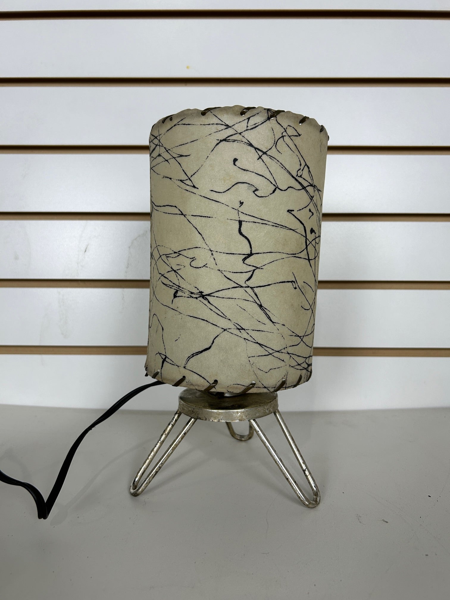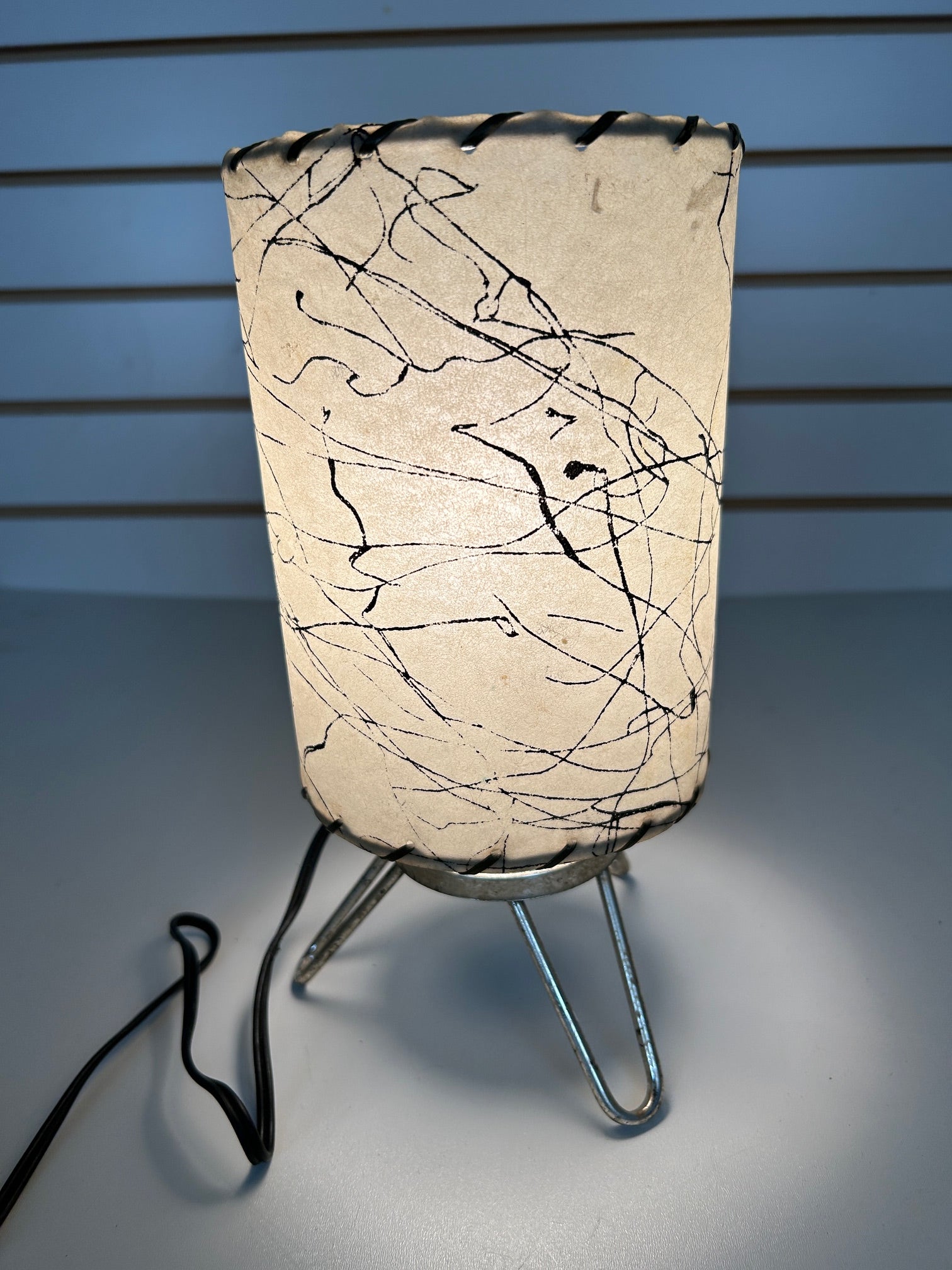 Table lamp retro brass wire frame with fiberglass cylinder diffuser with lacing