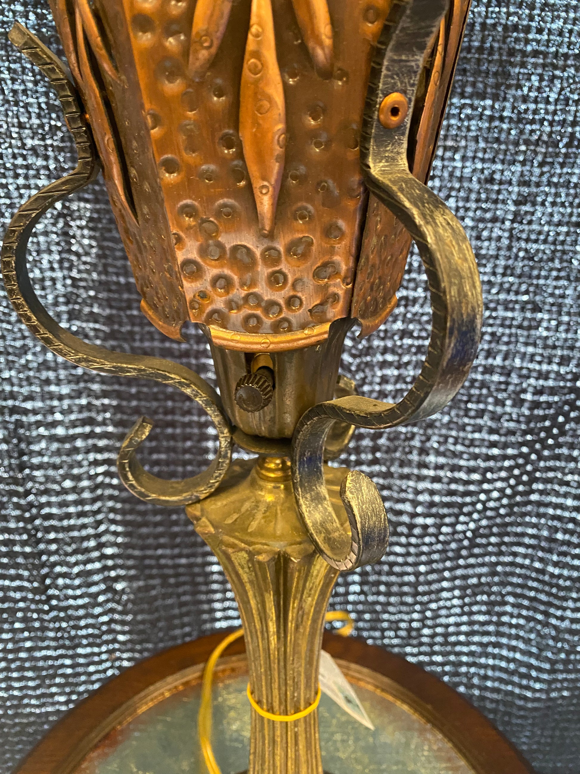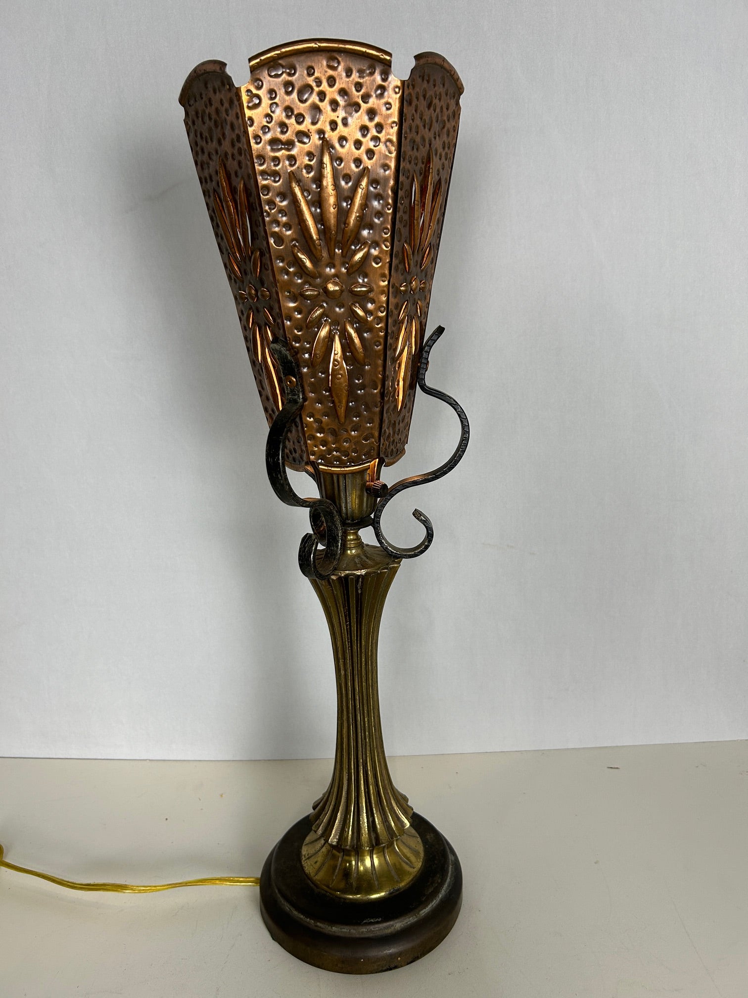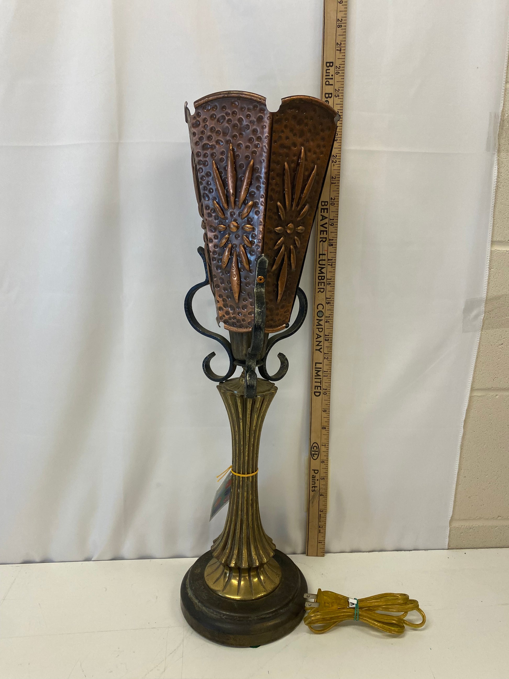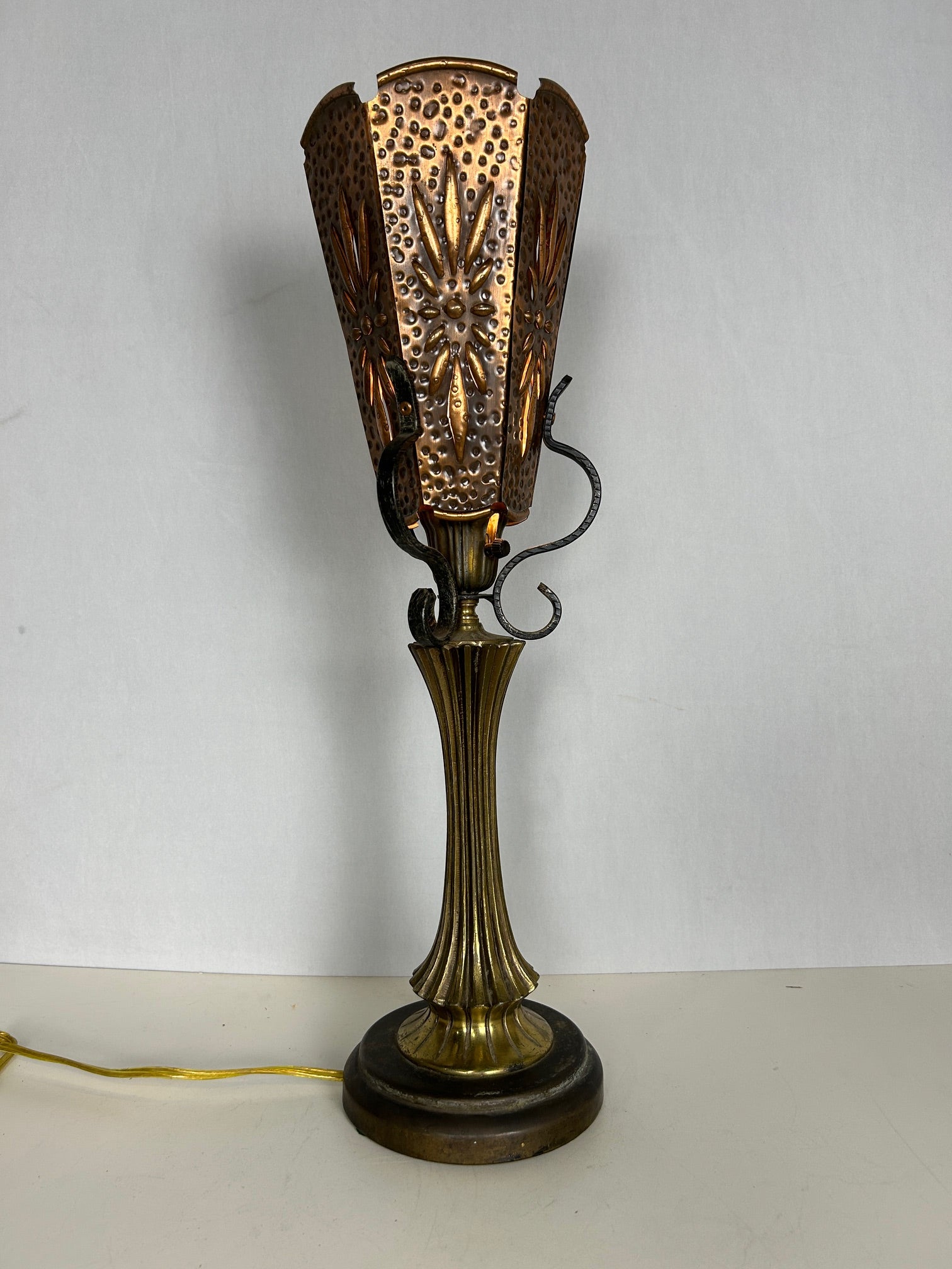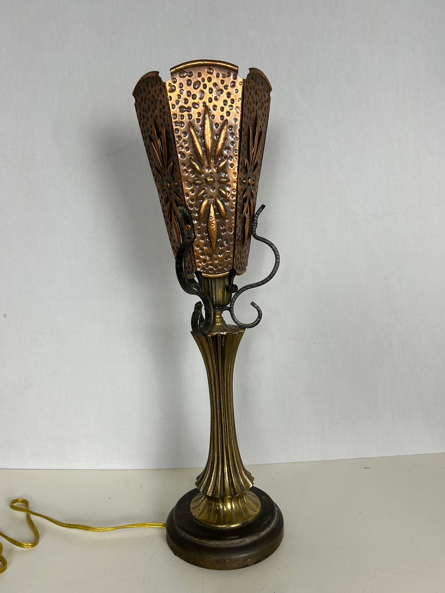 Table Lamp antique cast metal with perforated copper shade upright lighting
