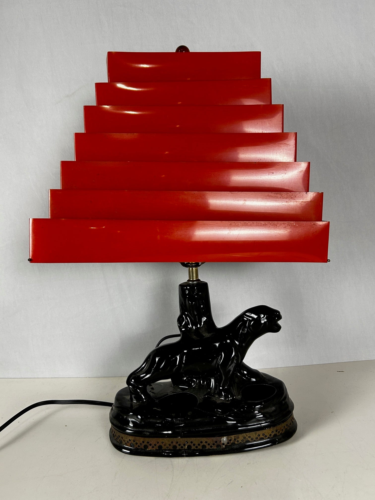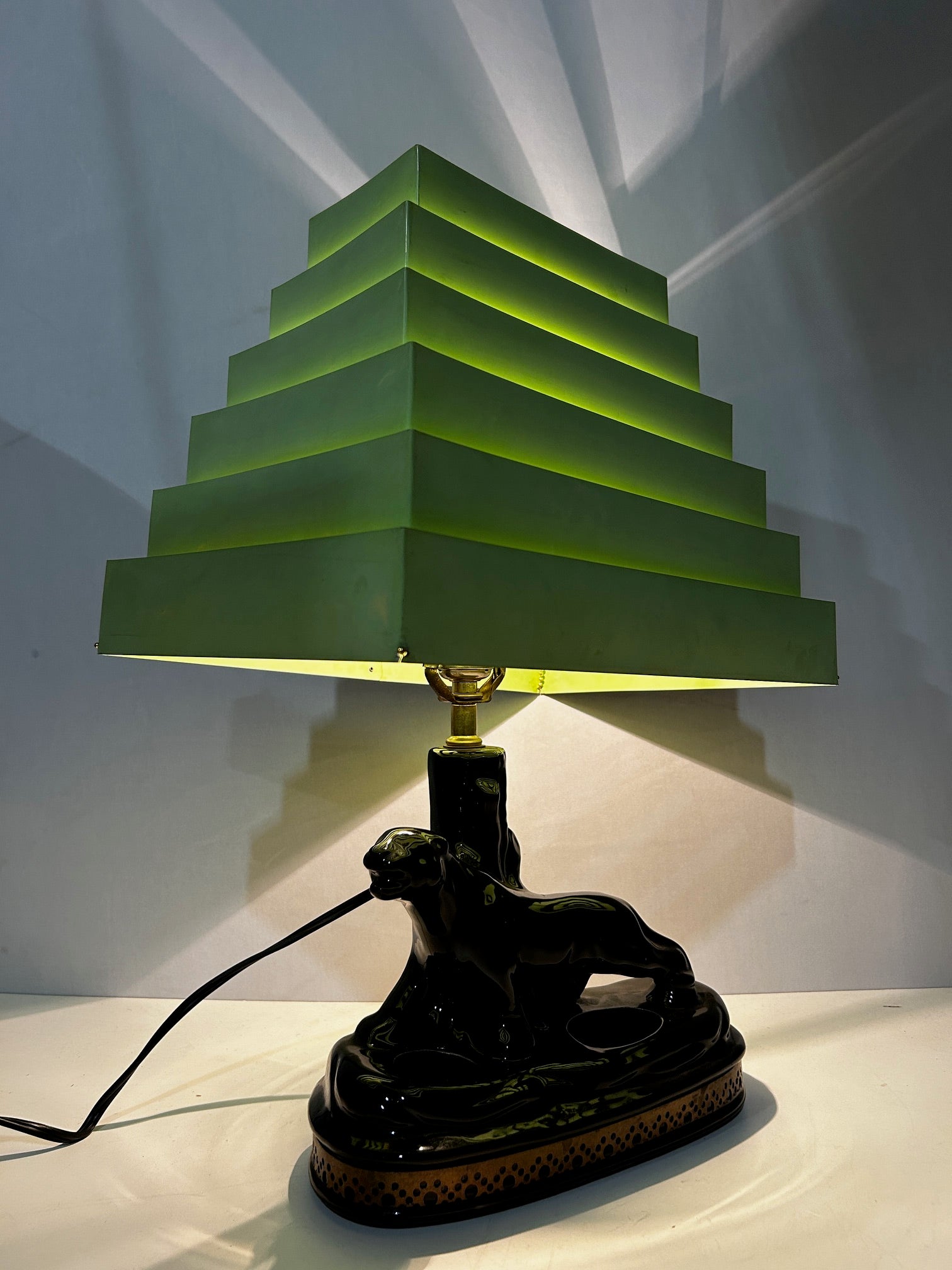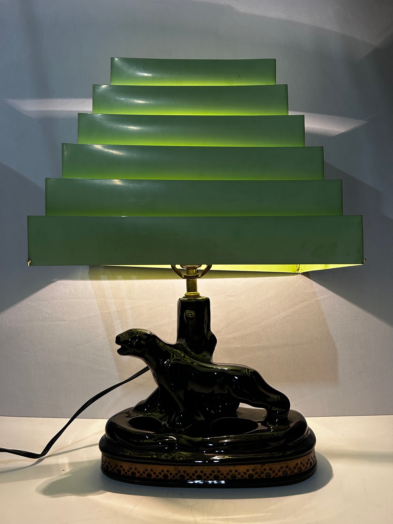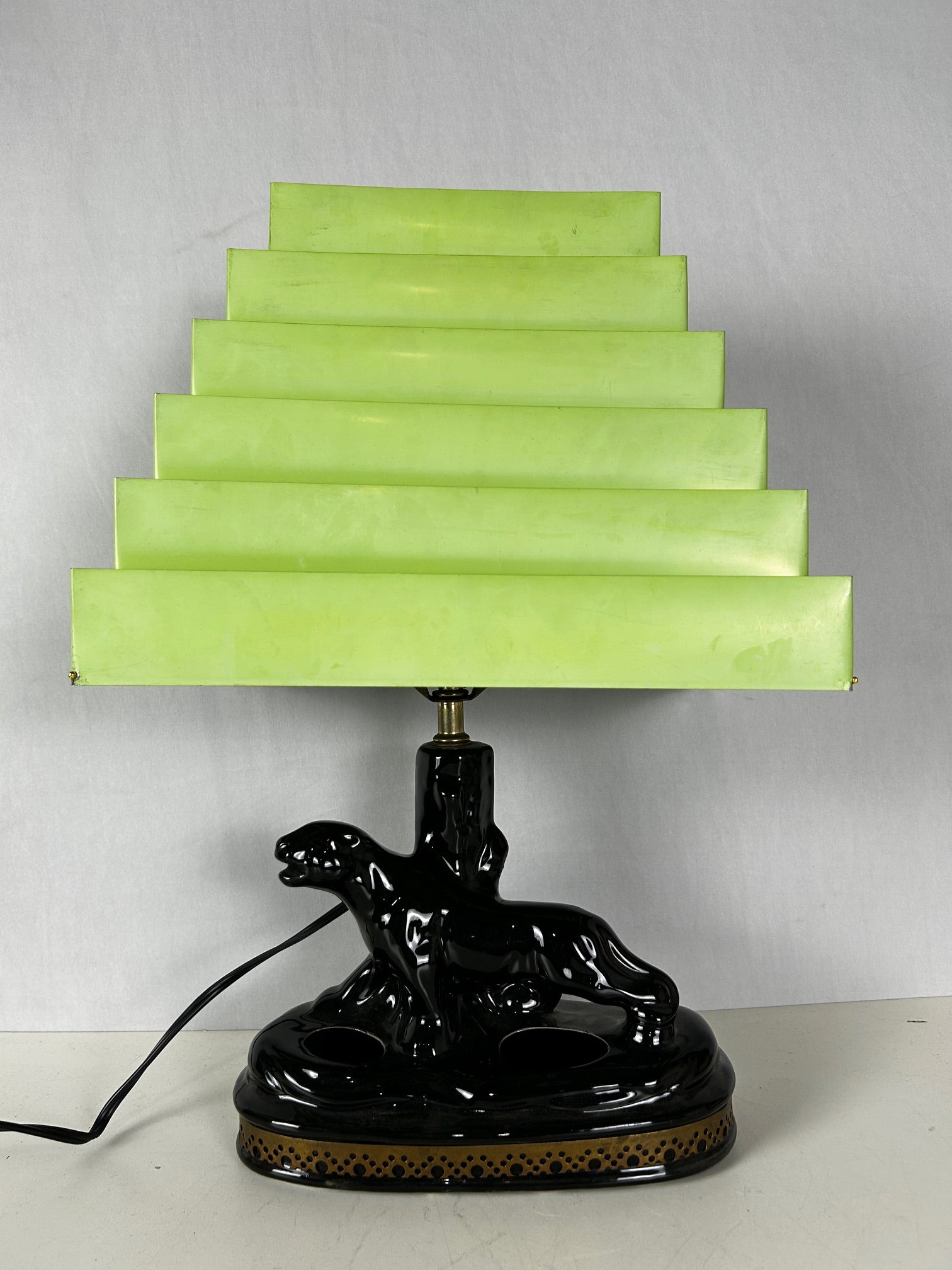 Table lamp Retro Black panther with venetian chartreuse blind shade.