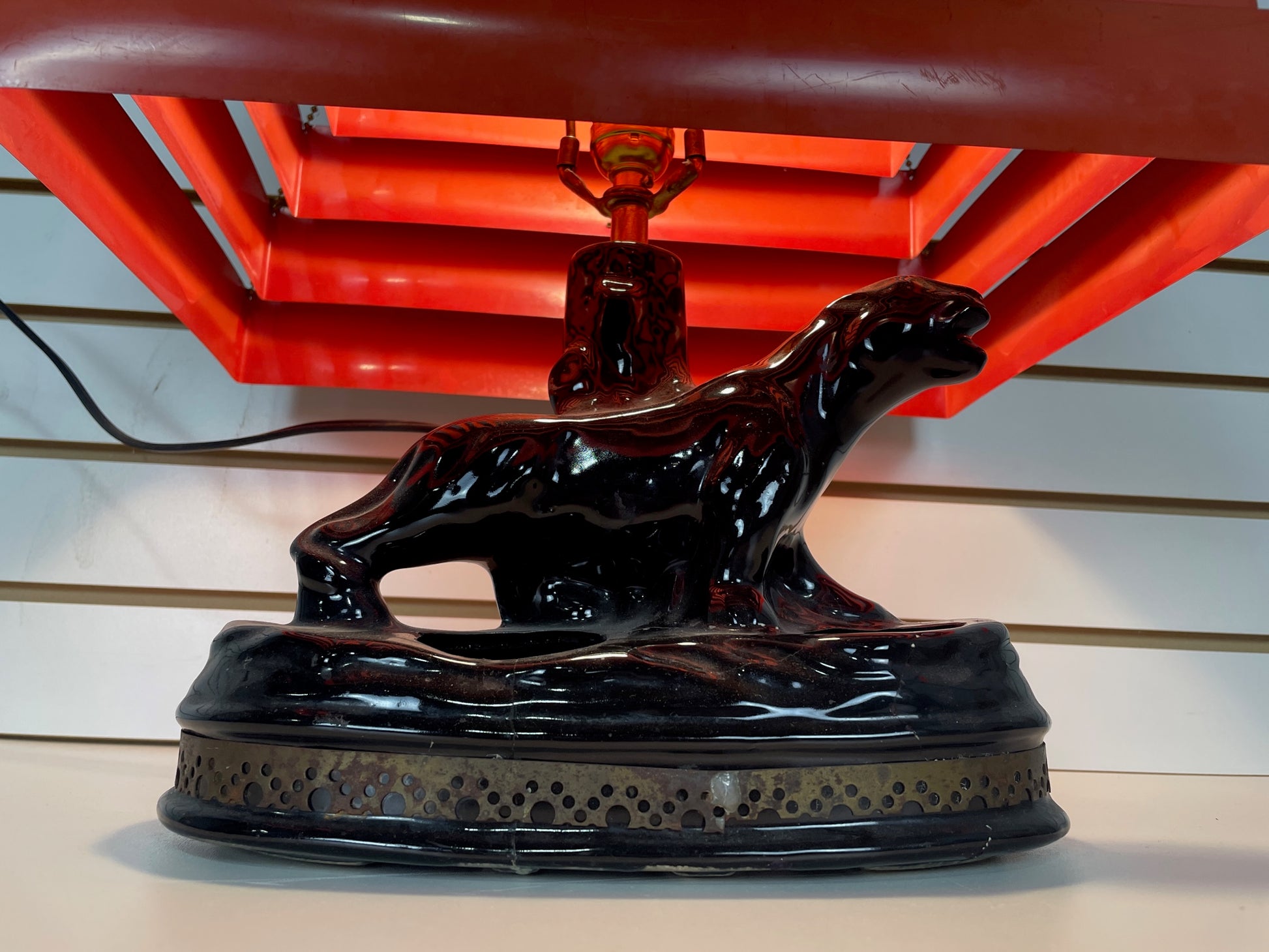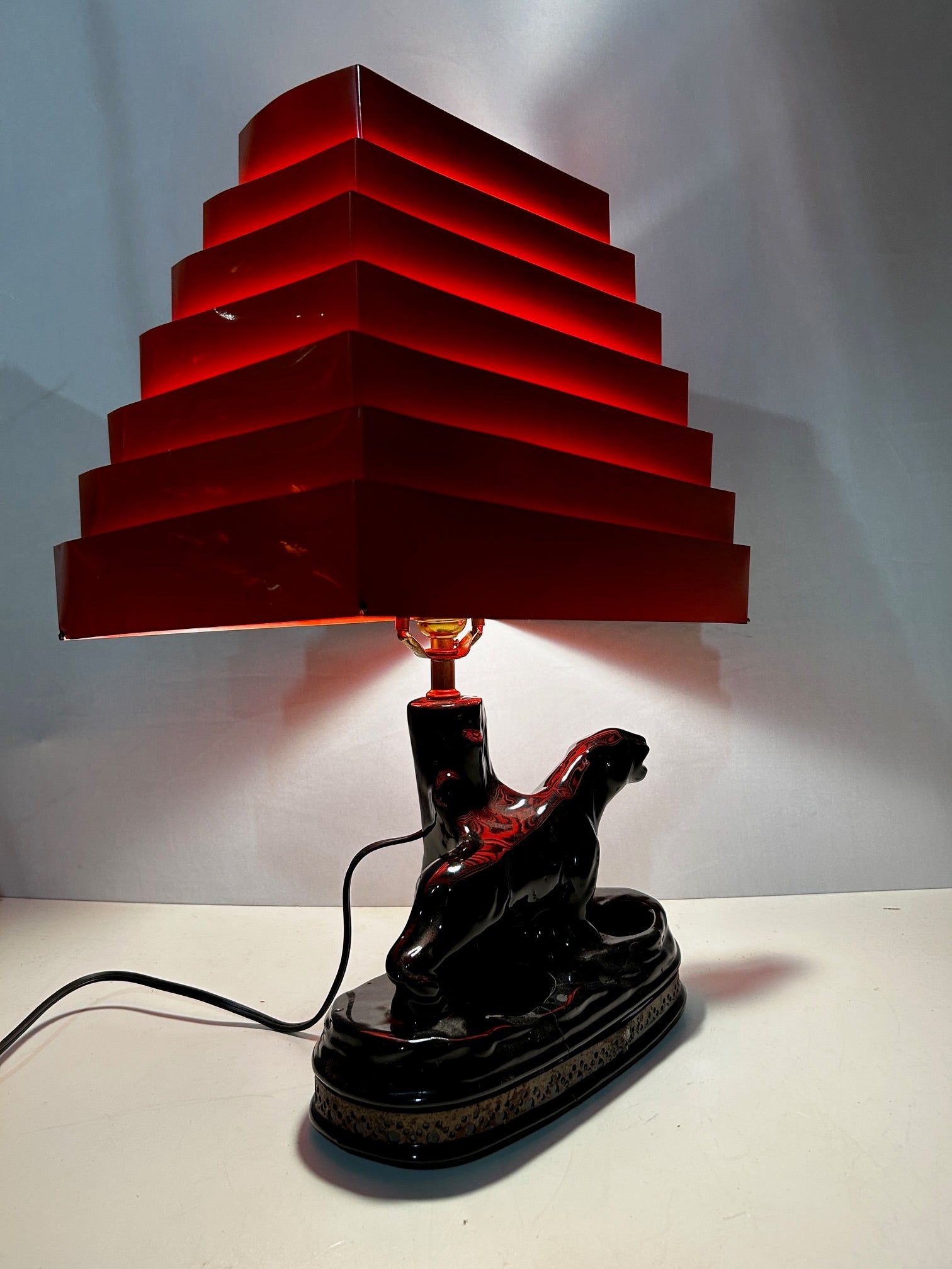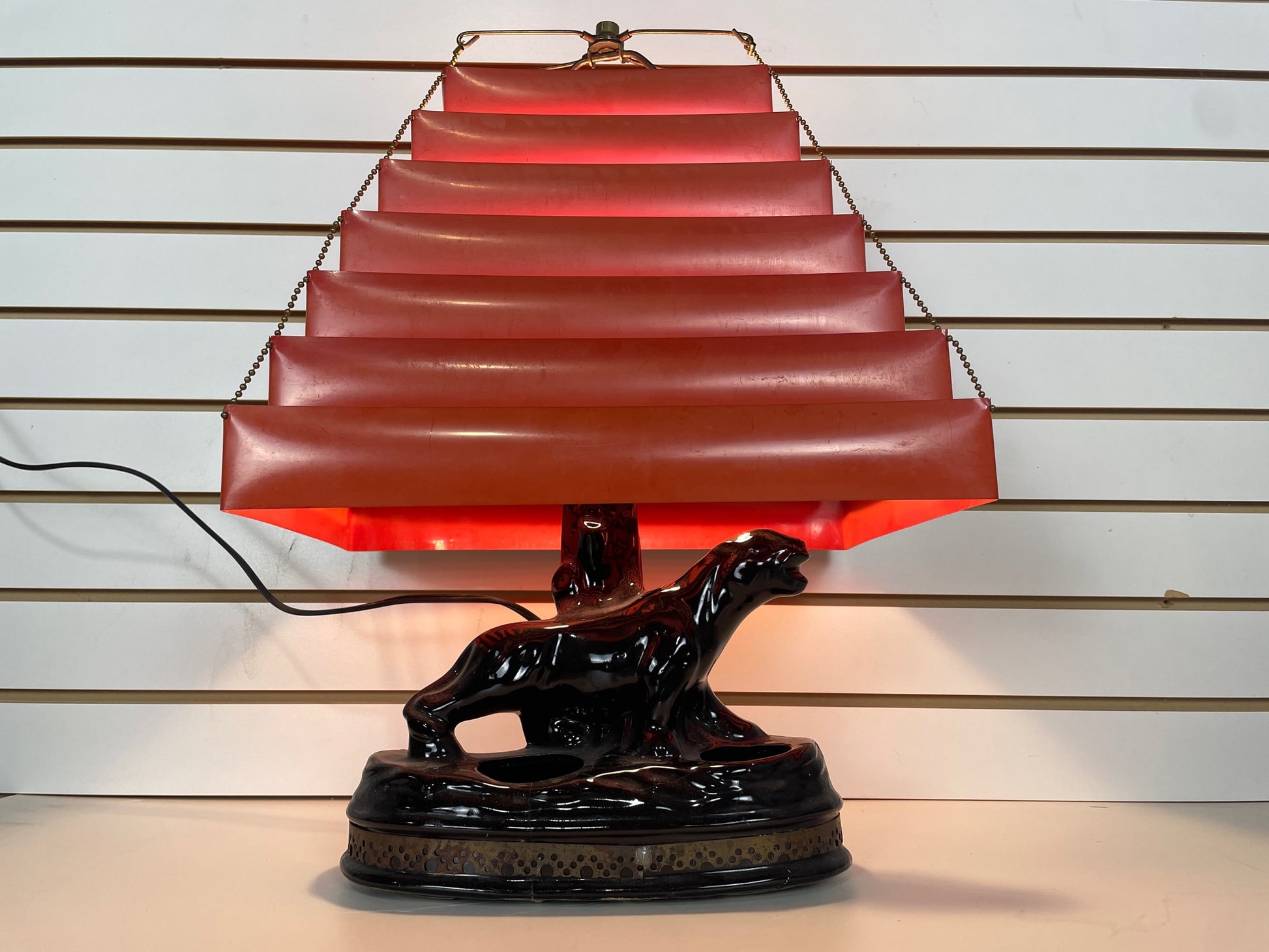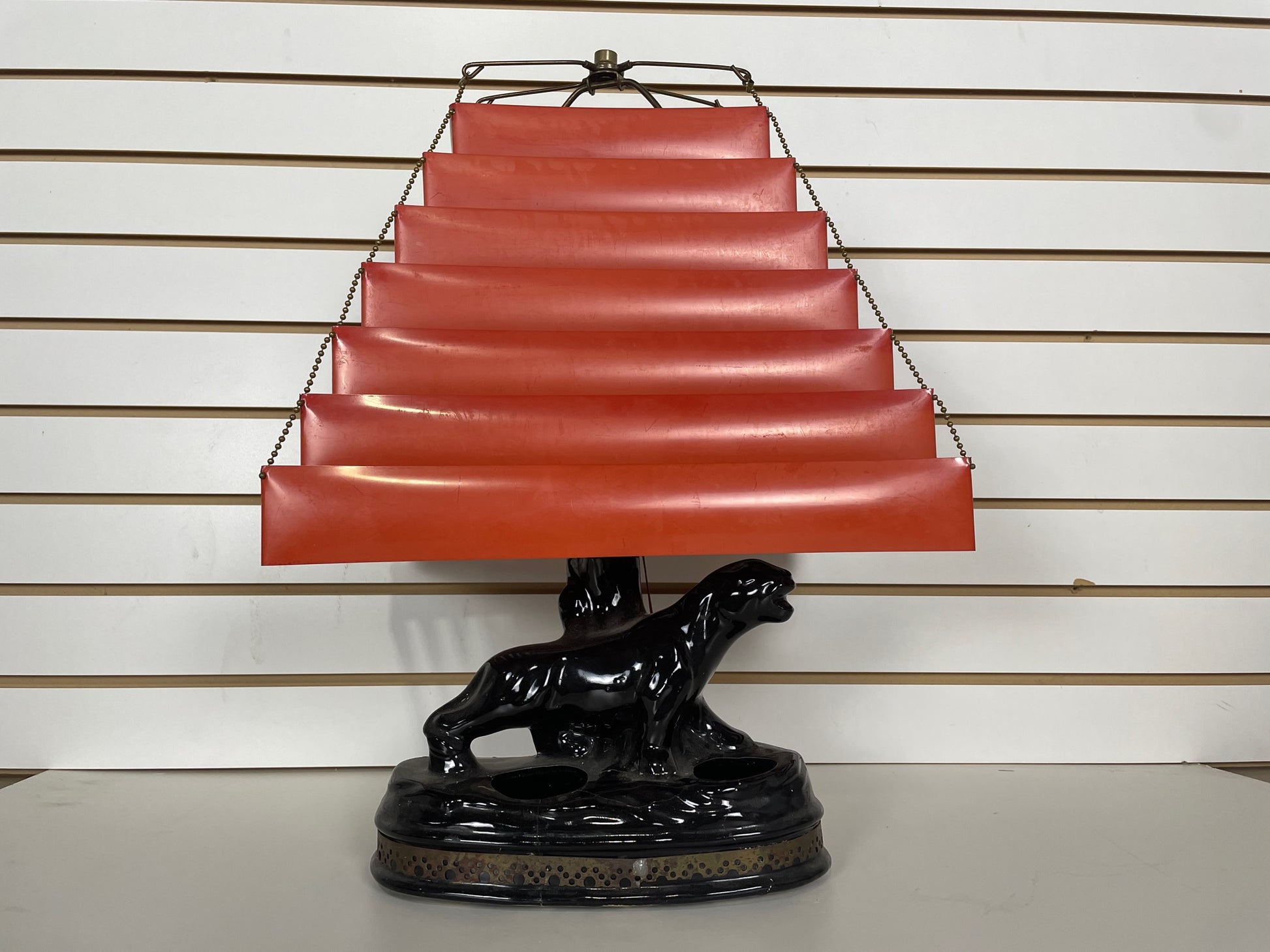 Table lamp Retro Black panther with venetian chartreuse blind shade.