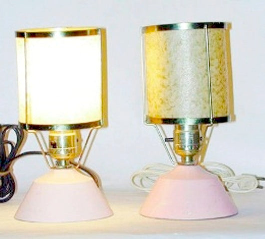 Table lamp small pink base with cylinder fiberglass shade with gold trim top & bottom