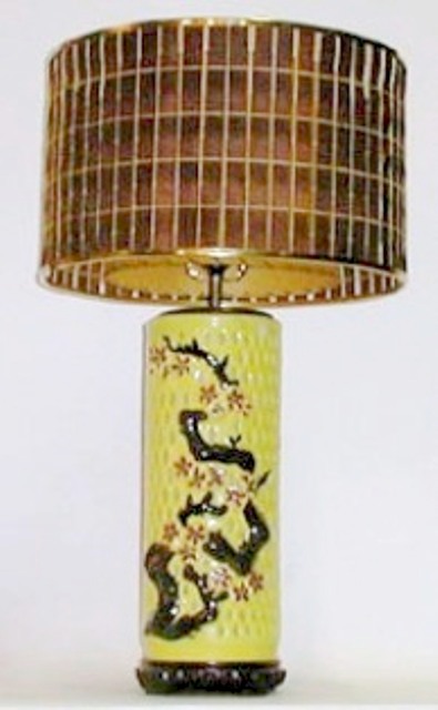 Table lamp Chartreuse ceramic with sherry blossom and with Stain ash veneer shade with insert fiberglass