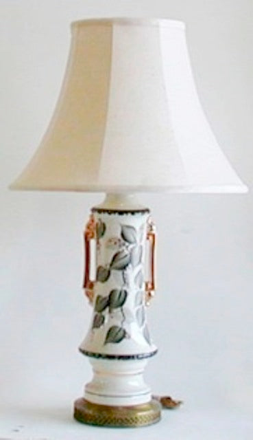Table lamp Porcelaine with green leaf and gold accents and gold handle with Linen shade