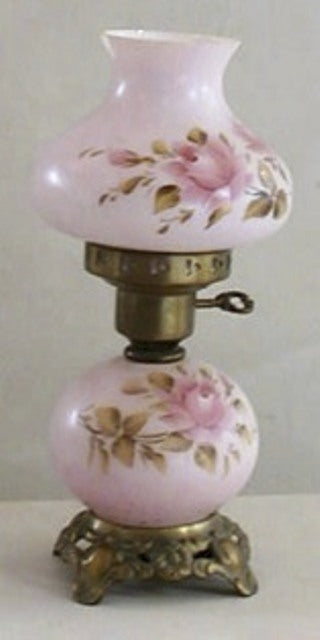 Table lamp Brass base with pink porcelaine with painted flower and glass chimney