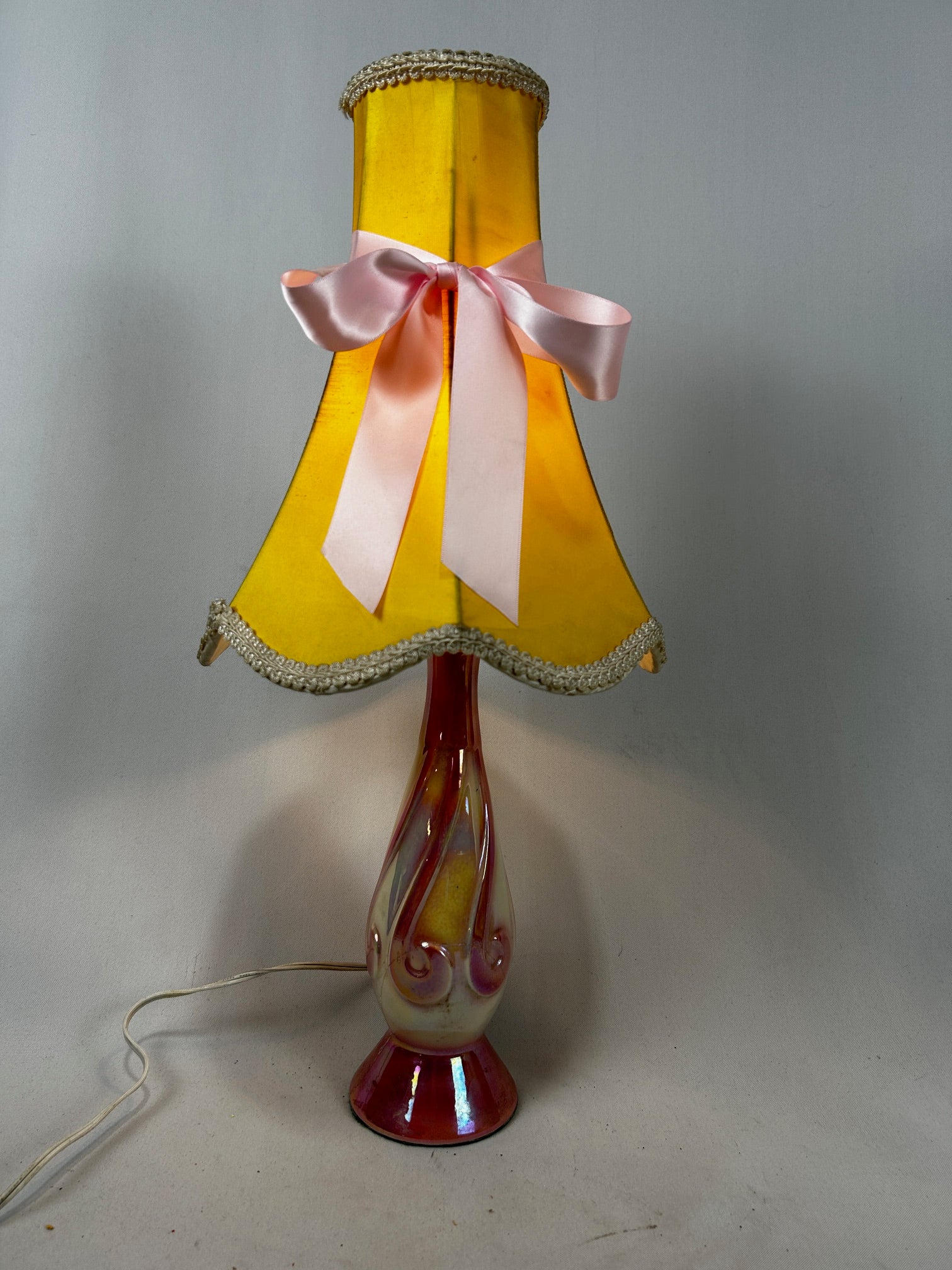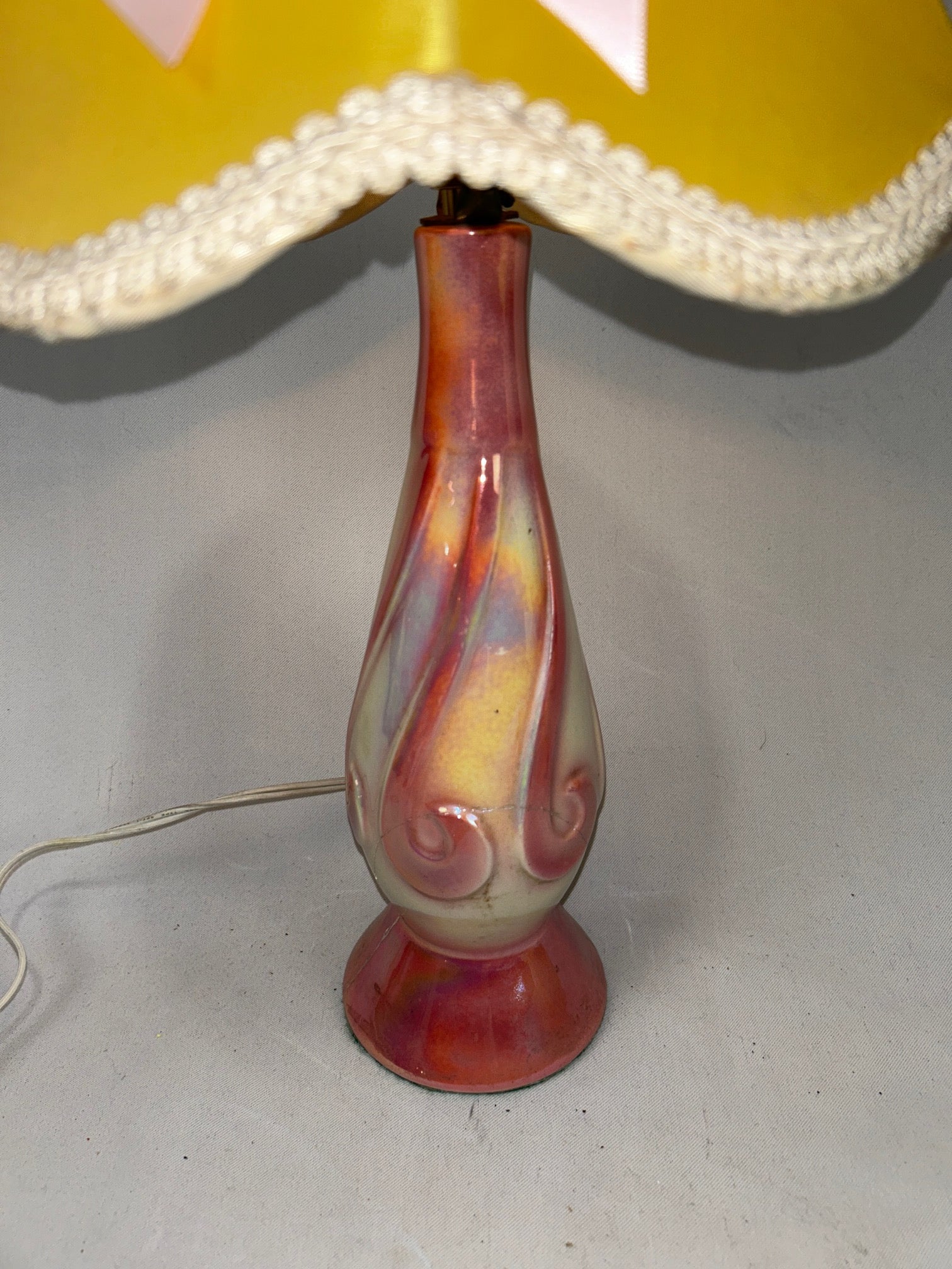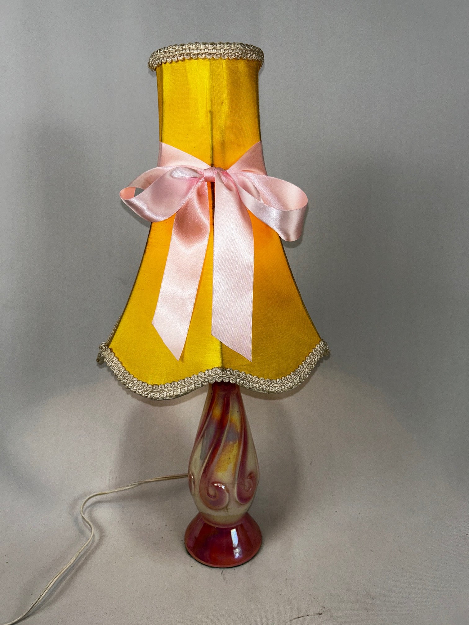 Table lamp Pink Porcelaine swirl finish with yellow silk shade with braid