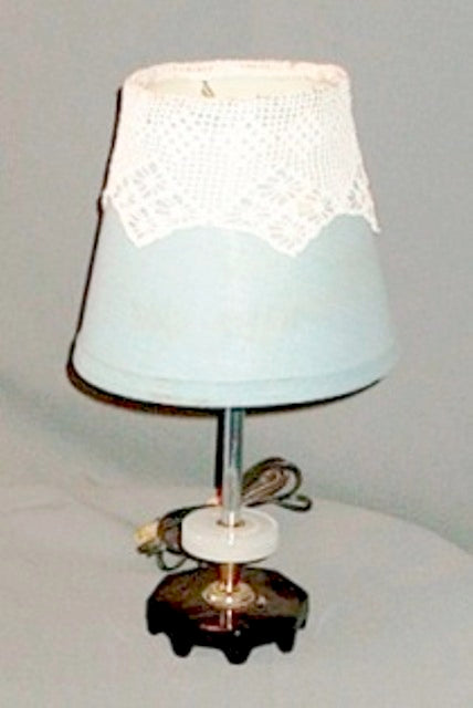 Table lamp Black & white acrylic base with blue fabric shade with lace on top