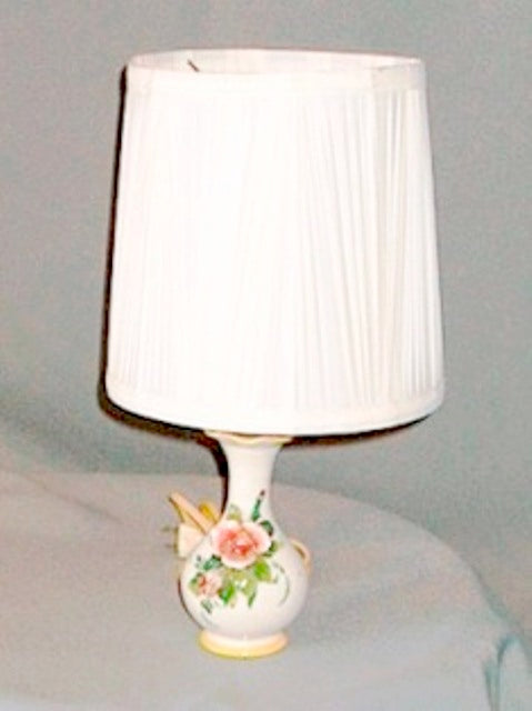 Porcelaine vase painted with flower arrangment and white pleated shade