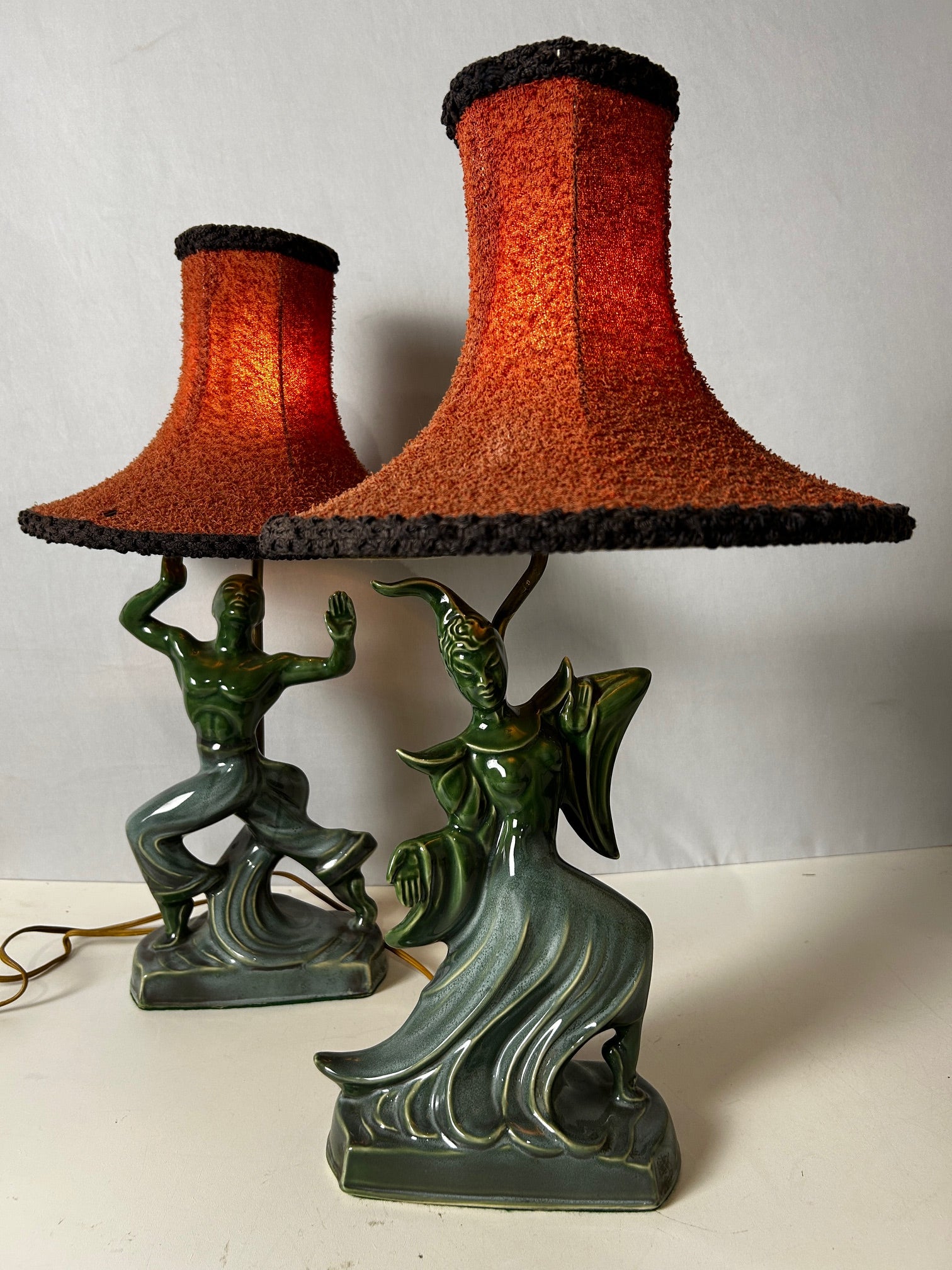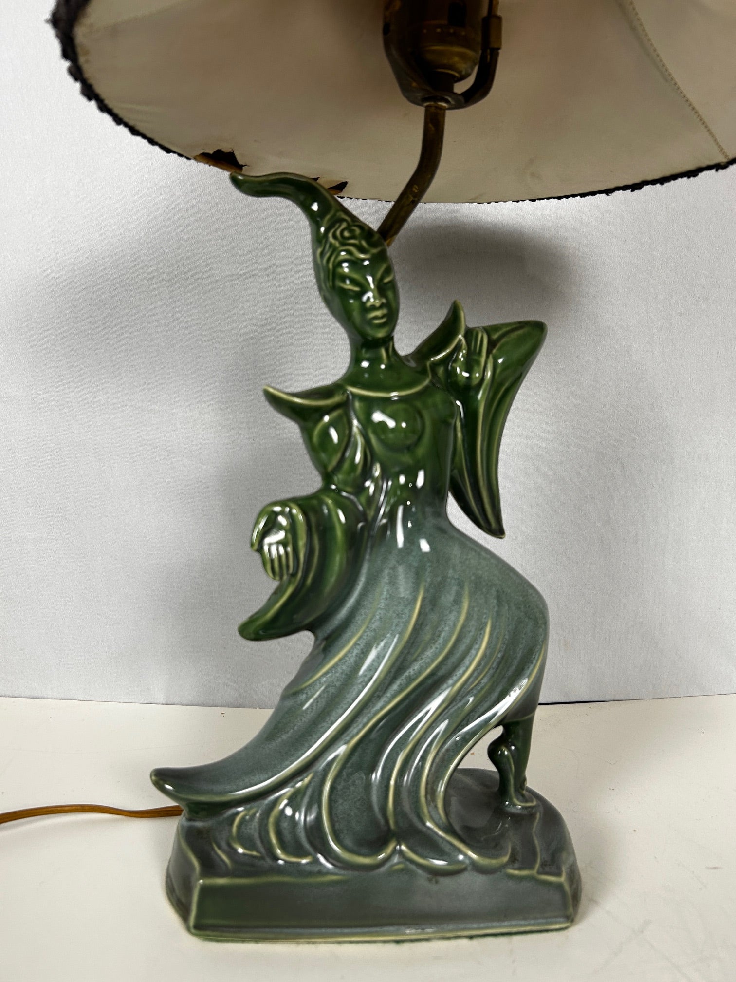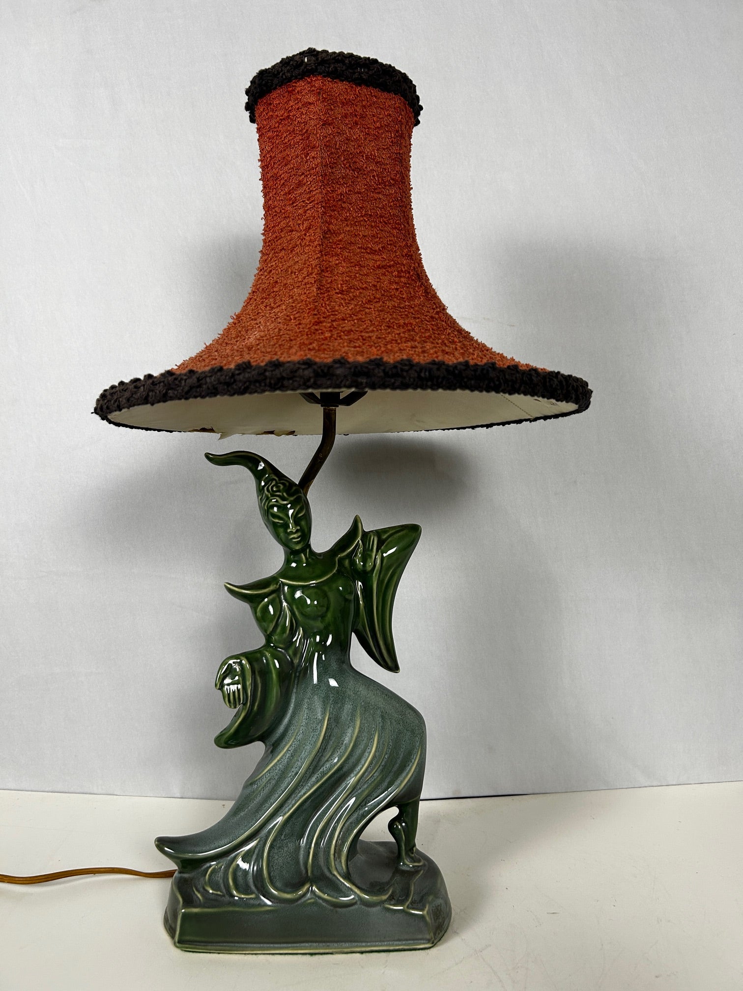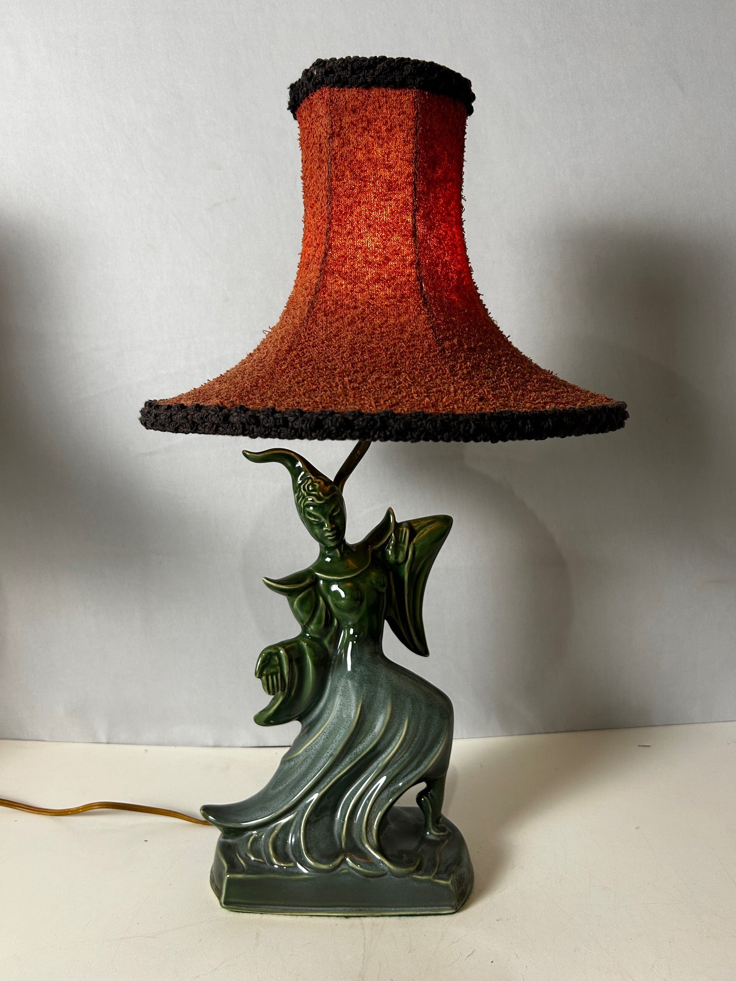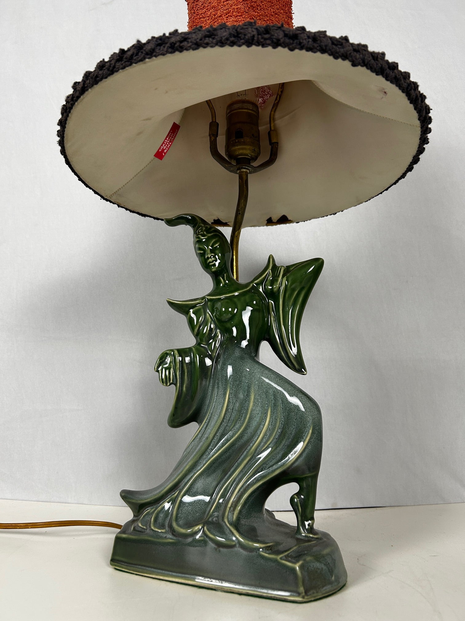 Table lamp Green Porcelain figurine dancer with original red linen shade with black trim