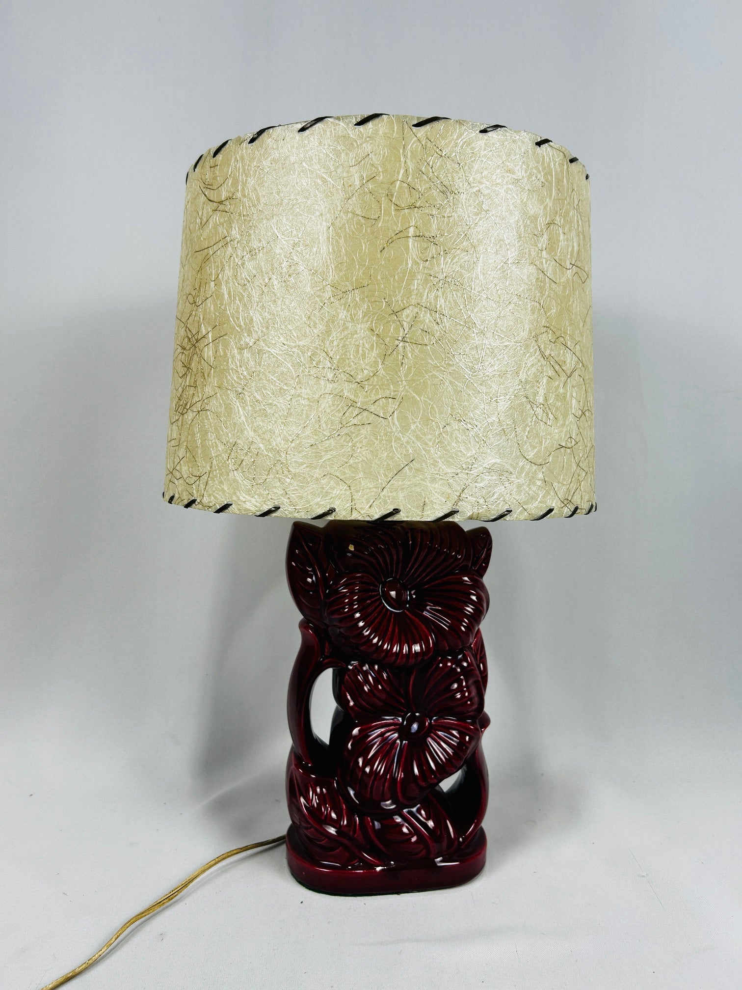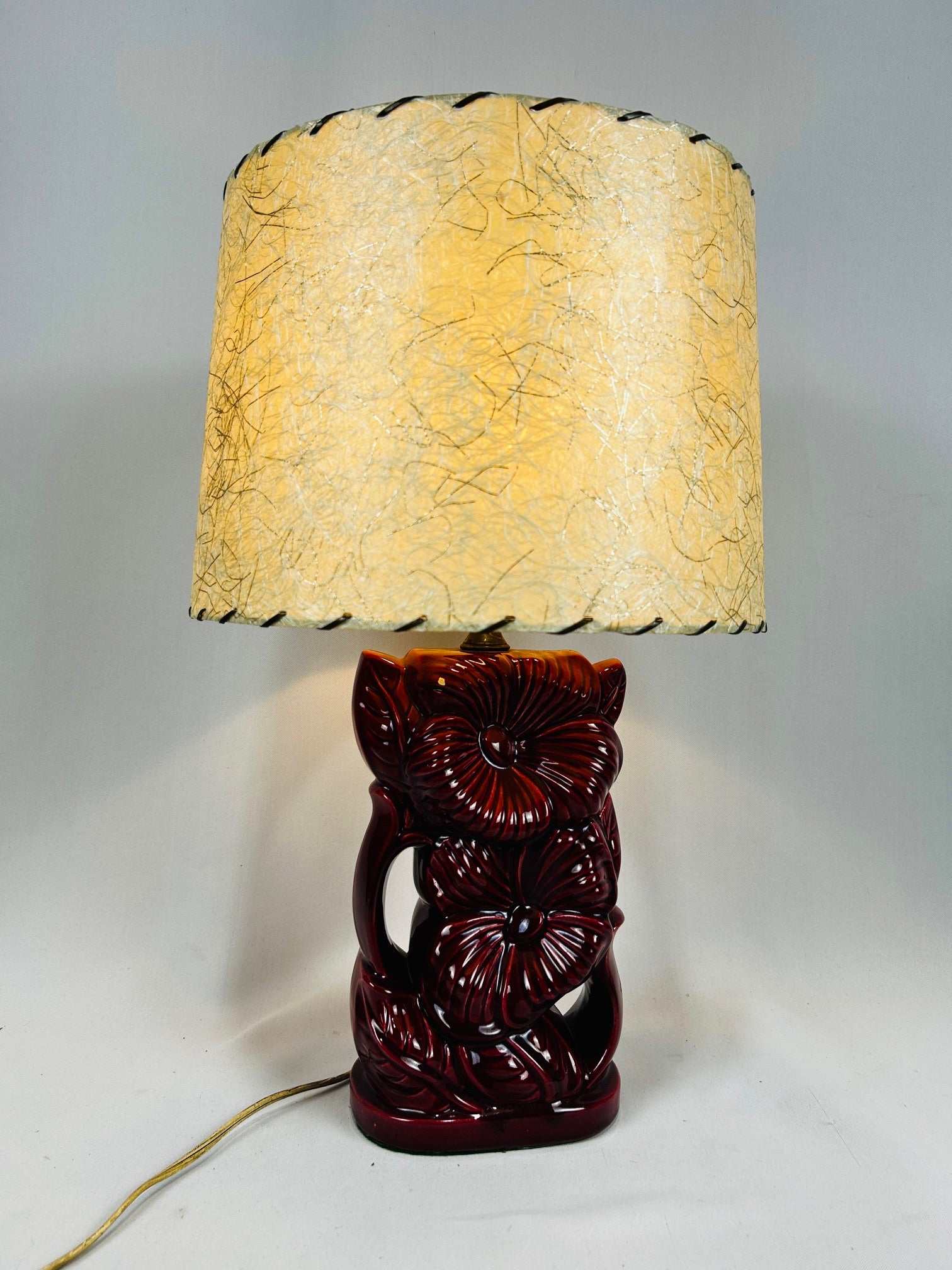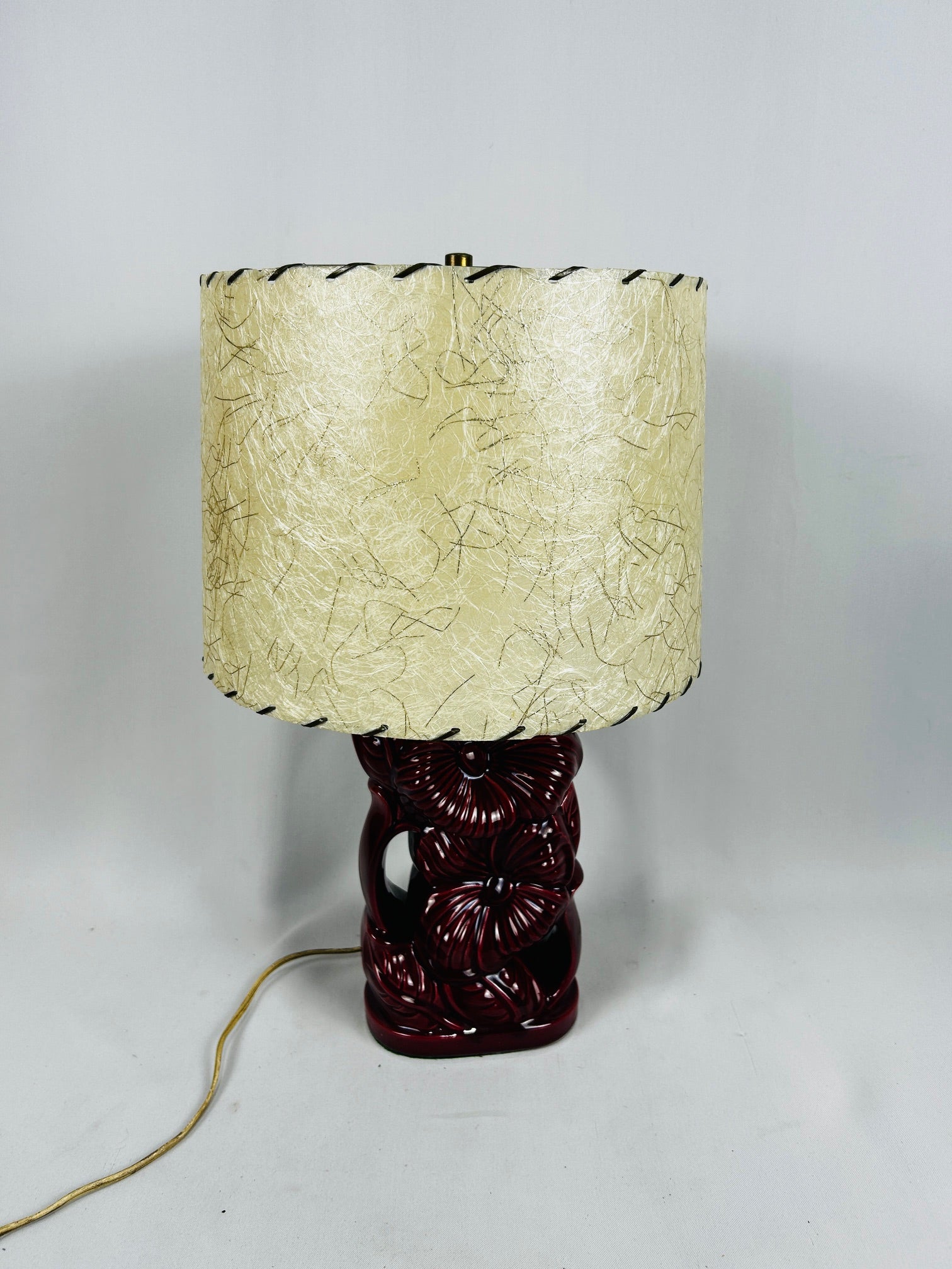 Table lamp Glaze Burgundy Ceramic in Flower pattern with fiberglass shade with Lacing