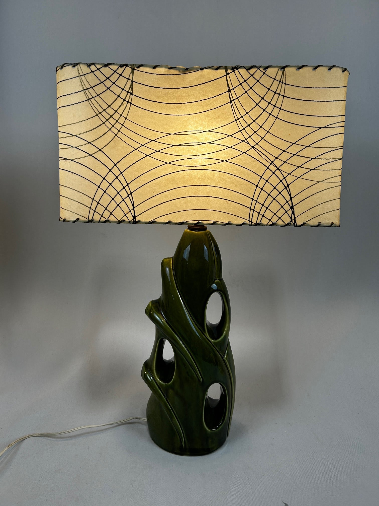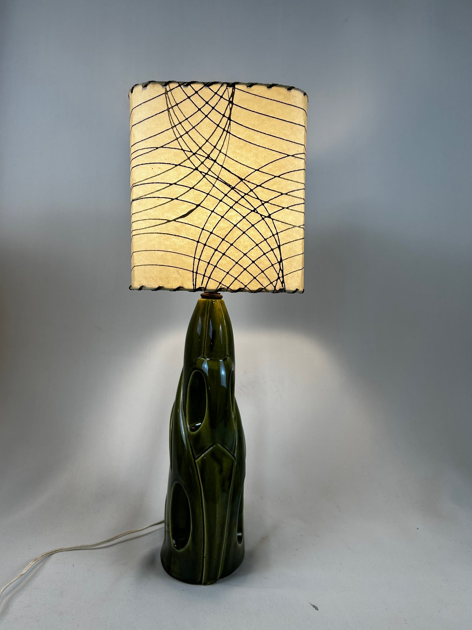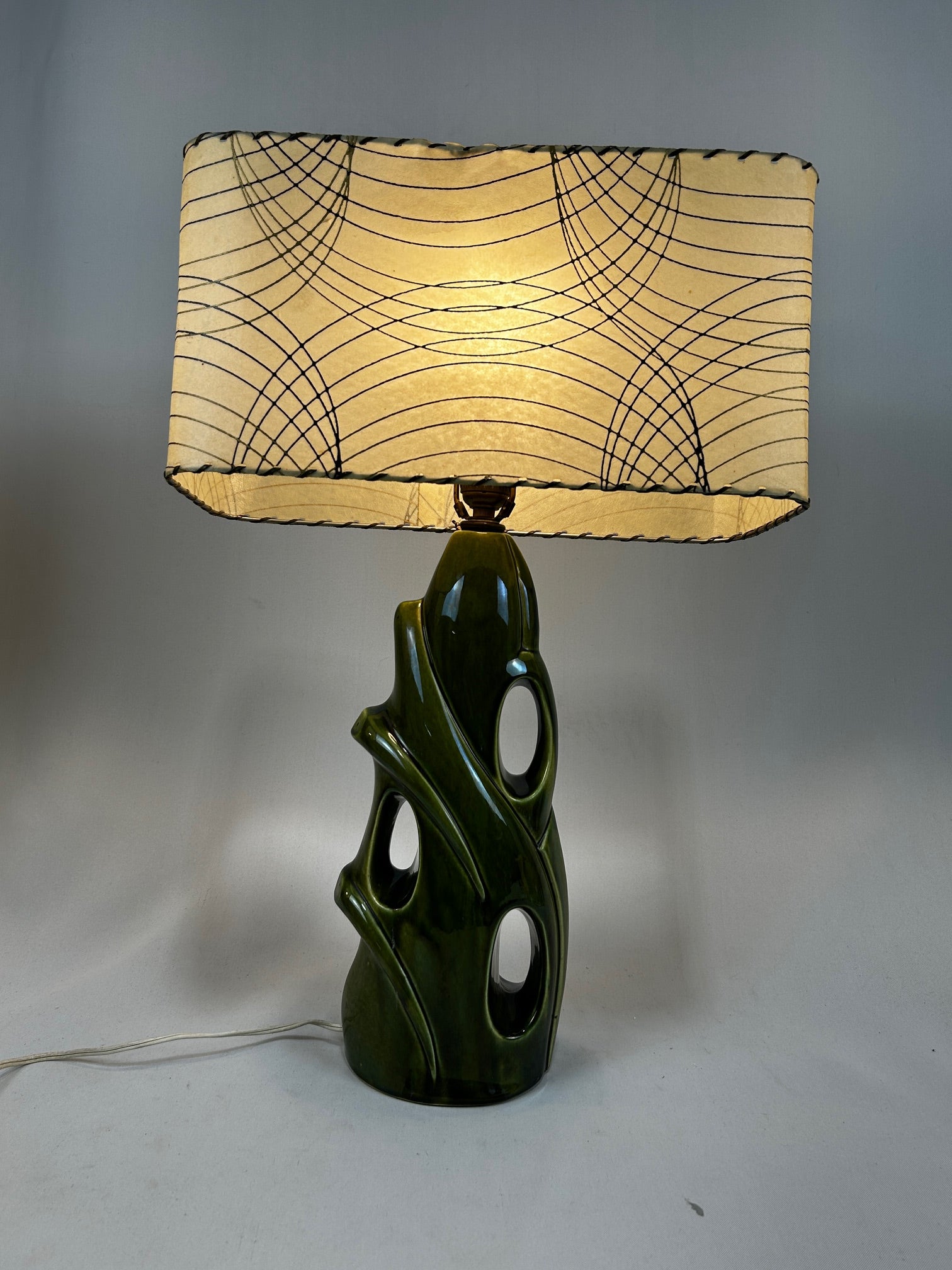 Table lamp Green ceramic tree with square fiberglass shade with blk swirl