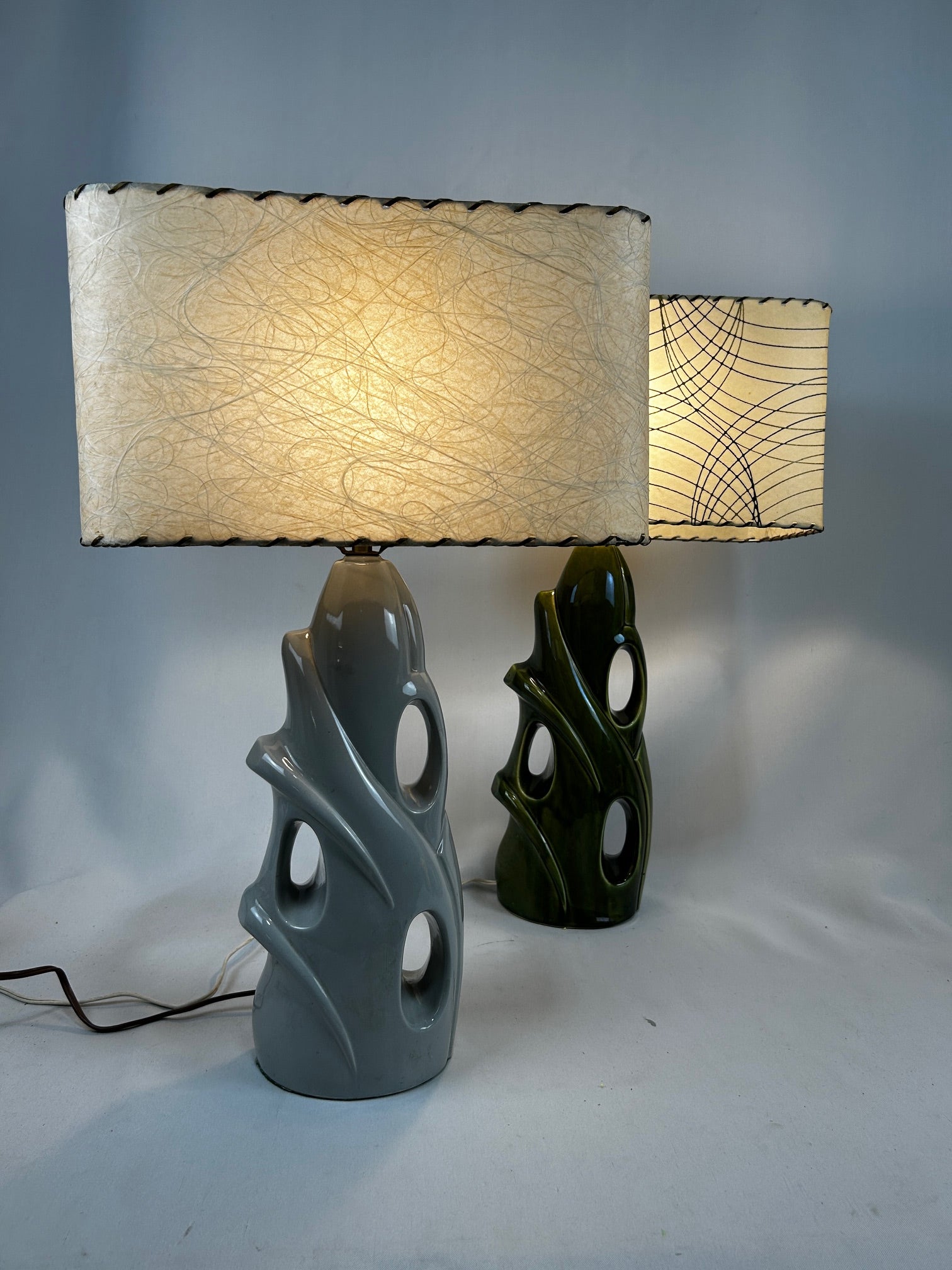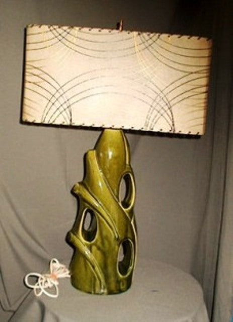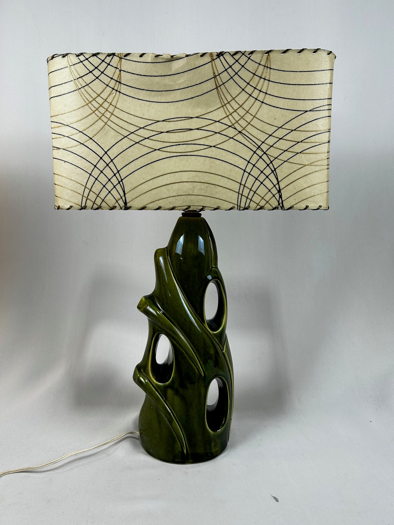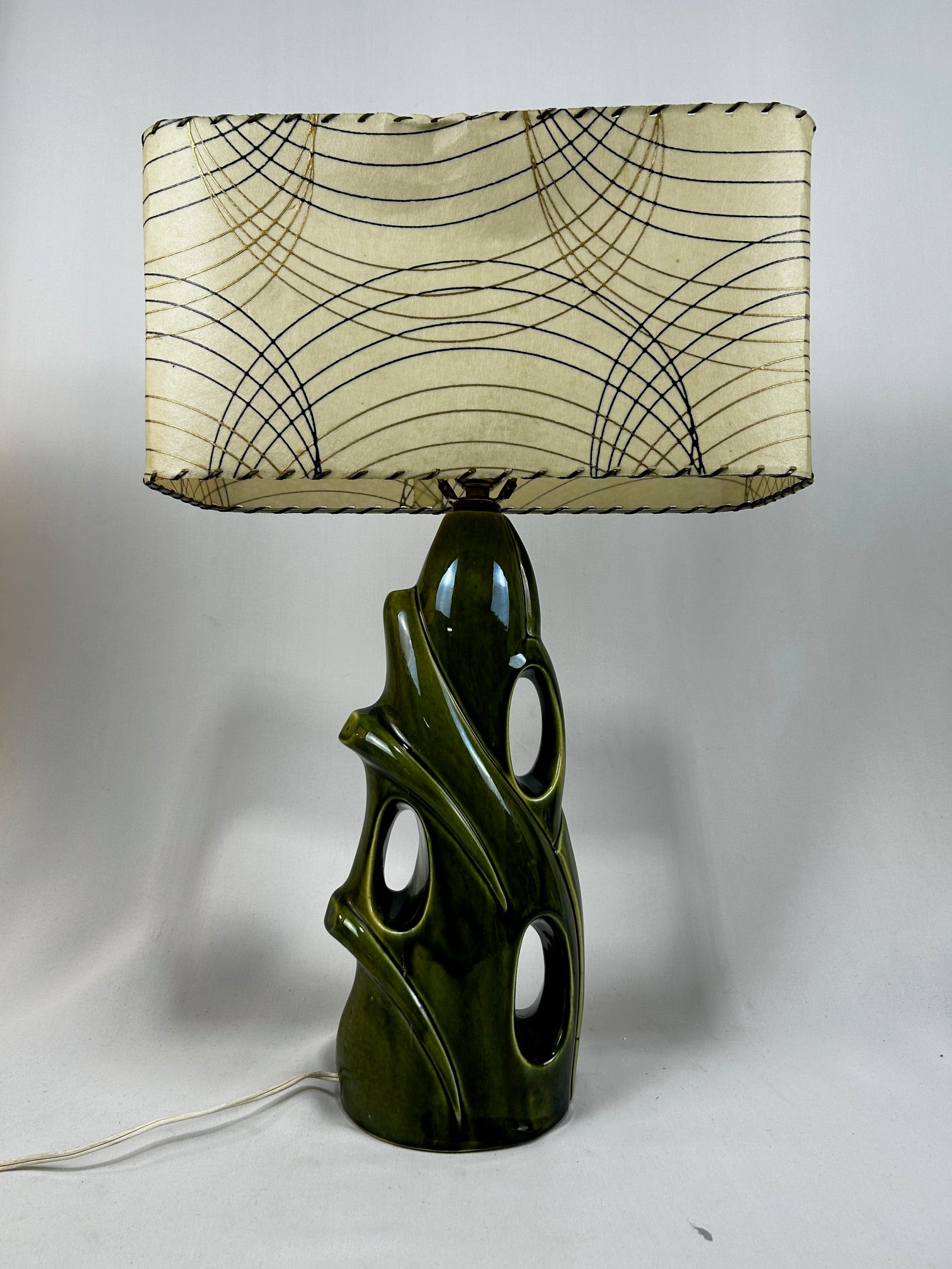 Table lamp Green ceramic tree with square fiberglass shade with blk swirl