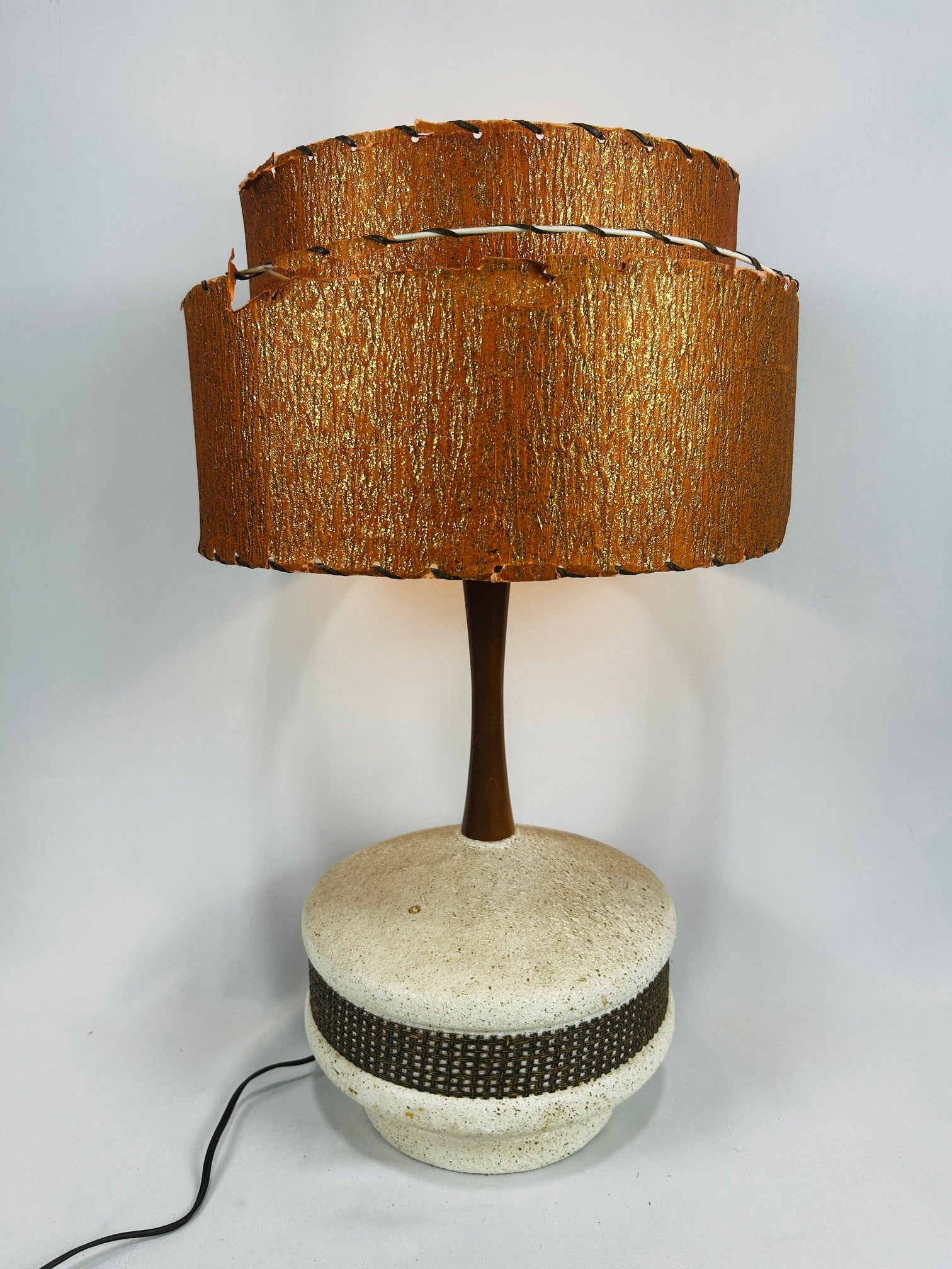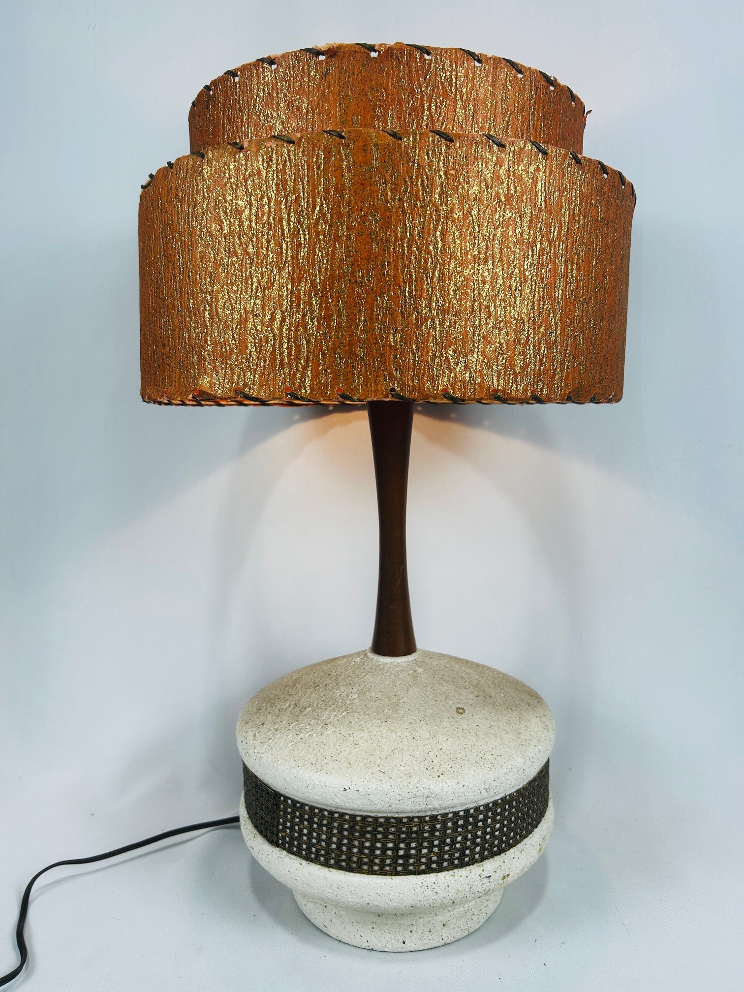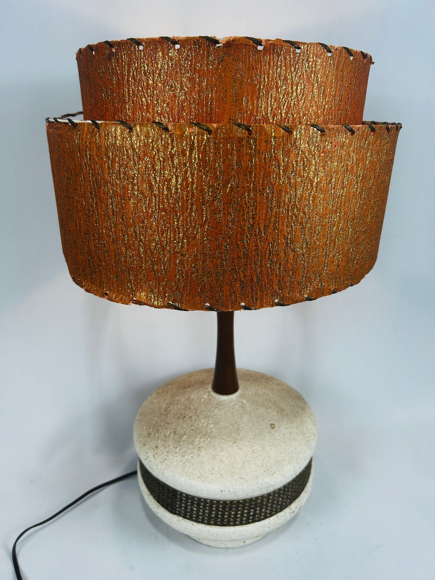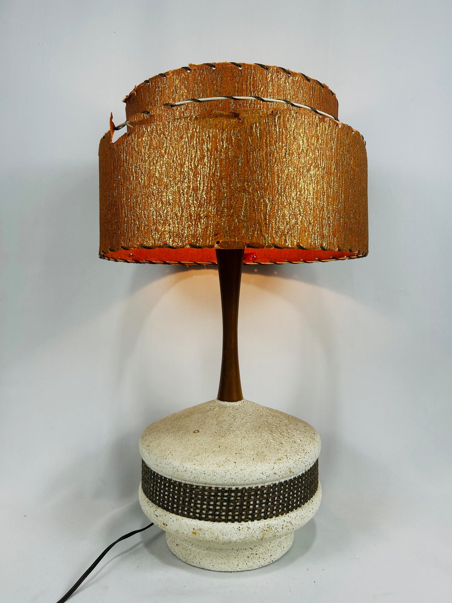 Table lamp Chalkware with double orange fiberglass shade.