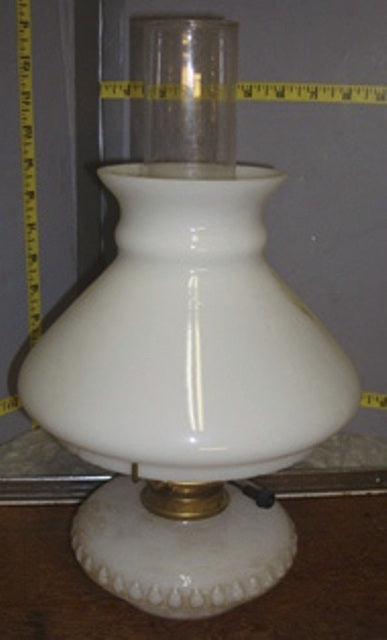 White porcelaine lamp with clear chimney and white glass shade over the chimney
