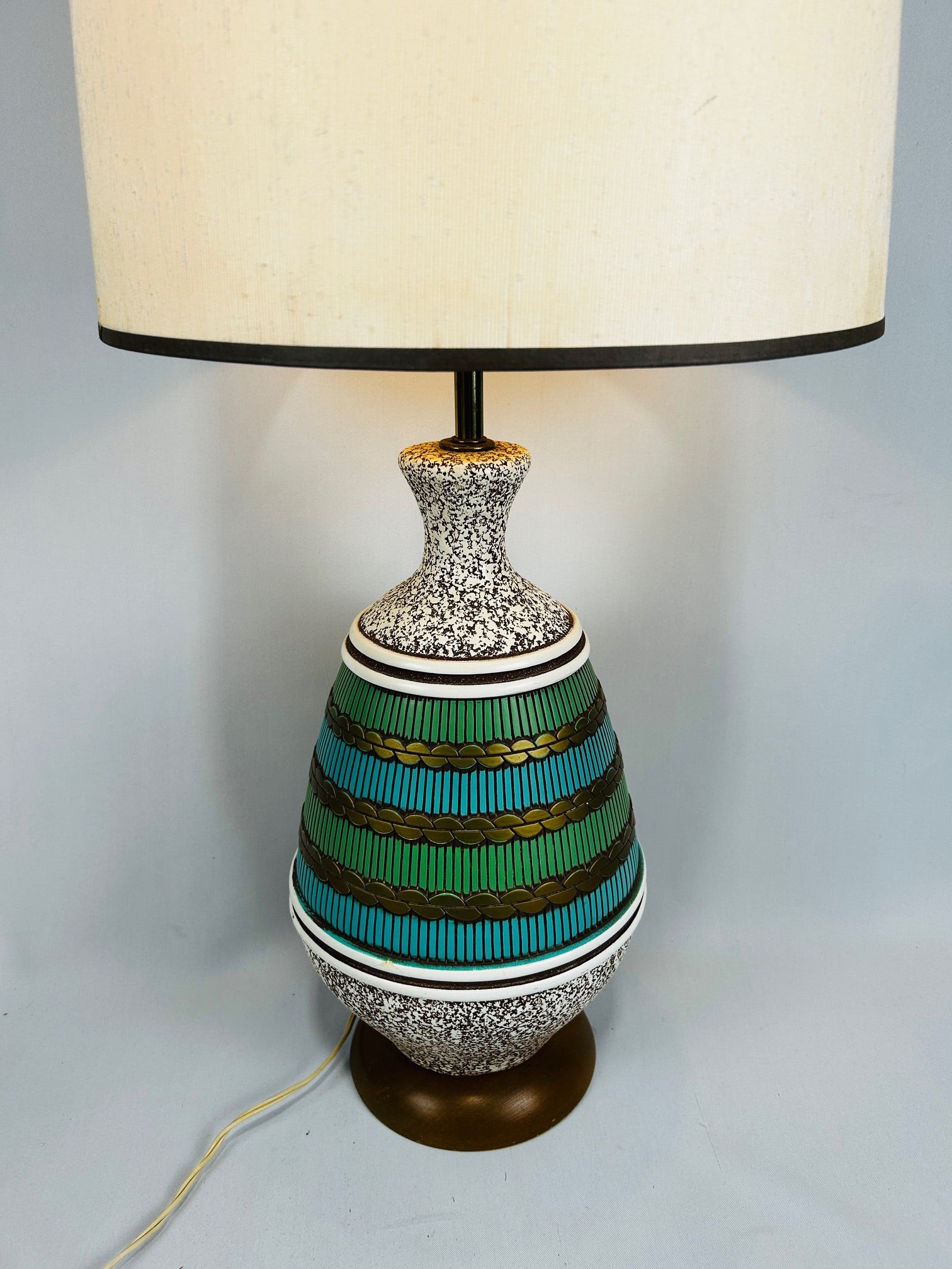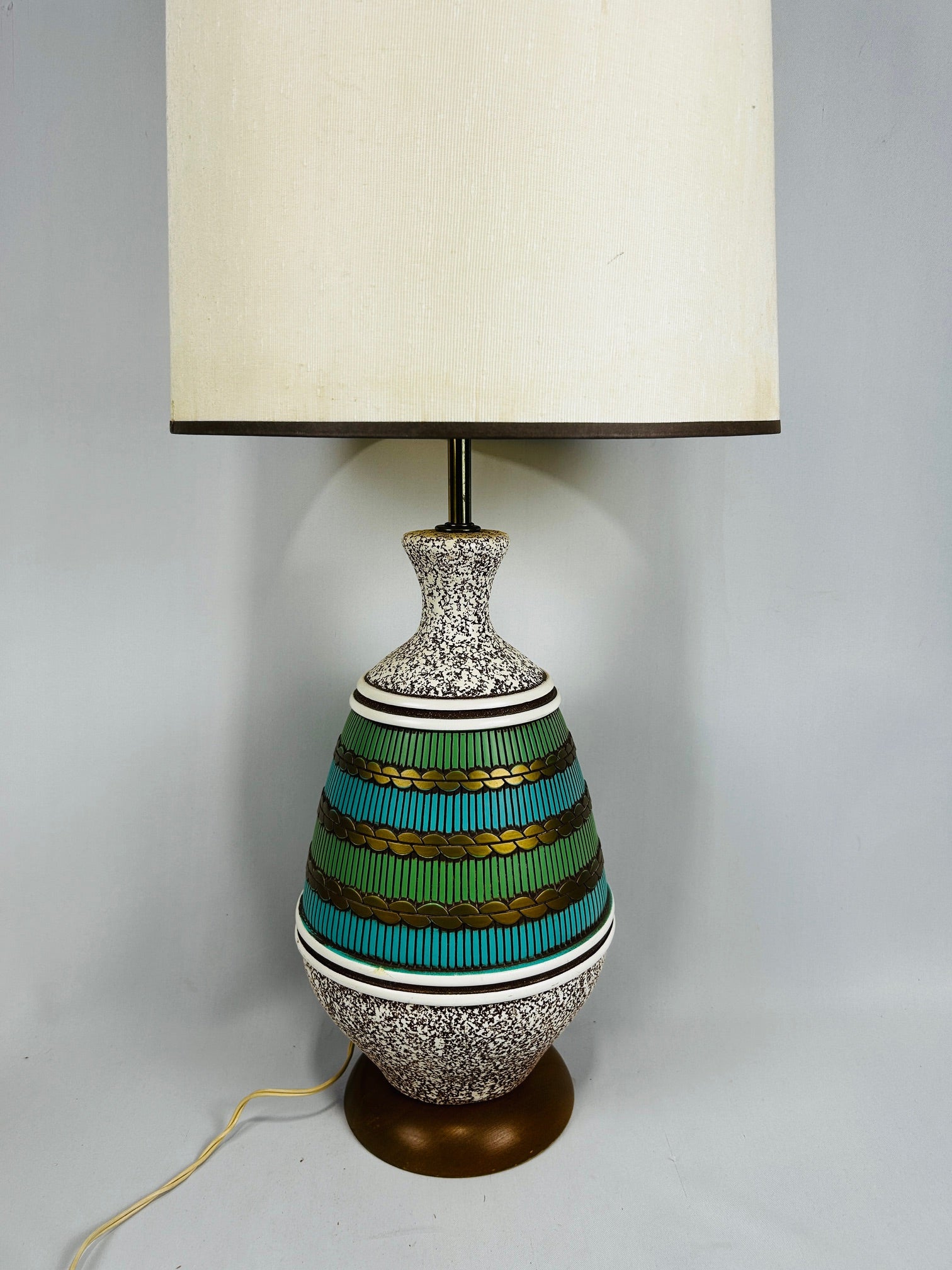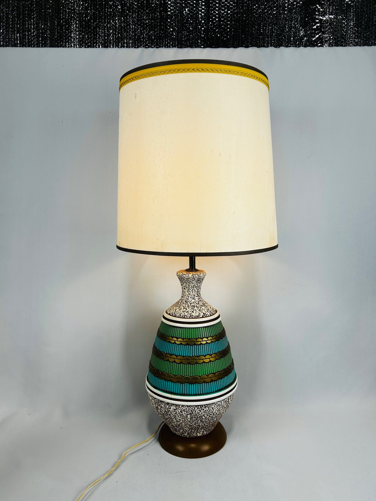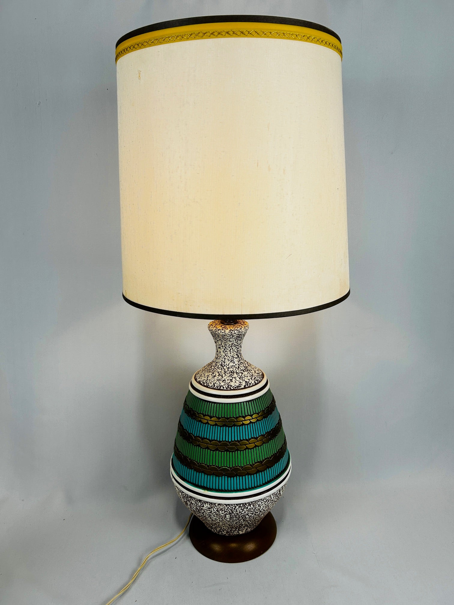 Ceramic 18" tall barrel inlaid with green and gold bands